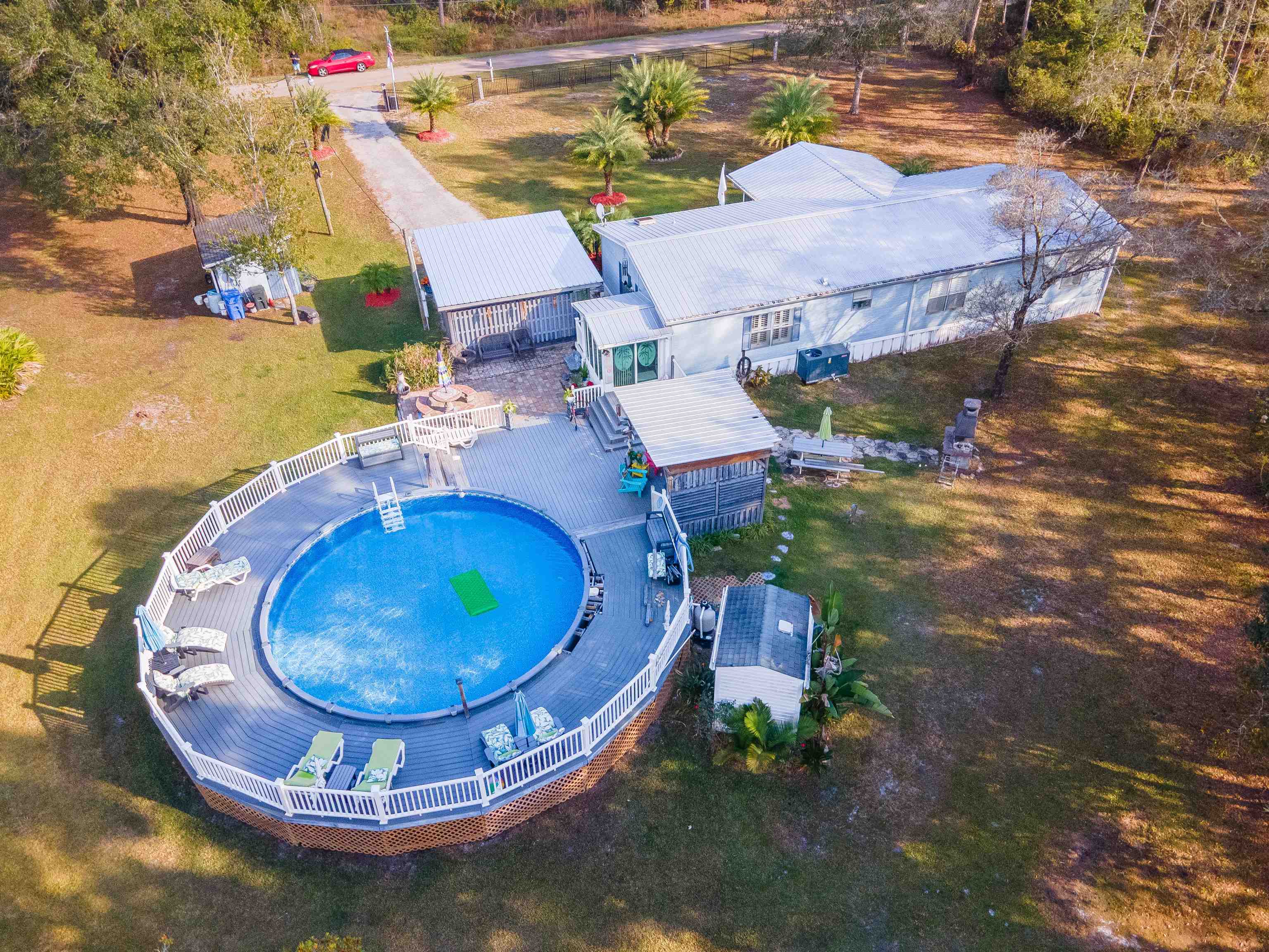 Beautifully Maintained 3 Bedroom, 2 Bath Home on 3. 41 Acres with a Sparkling Pool. Welcome to your private oasis—this meticulously cared-for, one-owner home sits on 3. 41 stunning acres filled with palm trees, mature oaks, pines, crepe myrtles and lush natural landscaping. From the moment you arrive, you’ll feel the peaceful breathing room that only acreage living can offer. Inside, the home features plantation shutters throughout, upgraded lighting, and a beautifully updated kitchen complete with granite countertops, white shaker cabinets, stainless steel island, Venetian stone flooring, and a brand-new (2024) stainless steel refrigerator. The master bedroom is spacious with lots of character. The designer master bathroom is filled with elegant touches including marble countertops, stone backsplash, ceramic tile flooring, and a lovely tile accent wall surrounding the tub/shower combination. All three bedrooms feature comfortable carpet flooring. The home is equipped with a water softener and aeration system, ensuring high-quality water throughout. Enjoy the bright and airy 10’ × 20’ front room addition, perfect for relaxing while soaking in views of the expansive property. Step outside to your Florida paradise…The spectacular pool features a composite walk-around deck, offering plenty of room for lounge chairs and outdoor entertaining. A separate pool house protects all pool equipment from the elements, and the salt-and-chlorine pool system includes a warranty, pool cleaner, sand filter, and all equipment stays with the home. Outdoor features also include: • 14’ × 21’ shed ideal for lawn equipment • 2-car carport • Built-in drainage system that diverts heavy rain—located in Flood Zone X • Beautiful paver patio with concrete table (included) Major updates for peace of mind: • New Goodman AC (2024) • 26-gauge metal roof (9 years old) • Termite bond in place This property is a rare find—acreage, upgrades, beauty, and privacy all wrapped into one move-in-ready Florida retreat. Perfect for anyone seeking outdoor living with comfort and style.