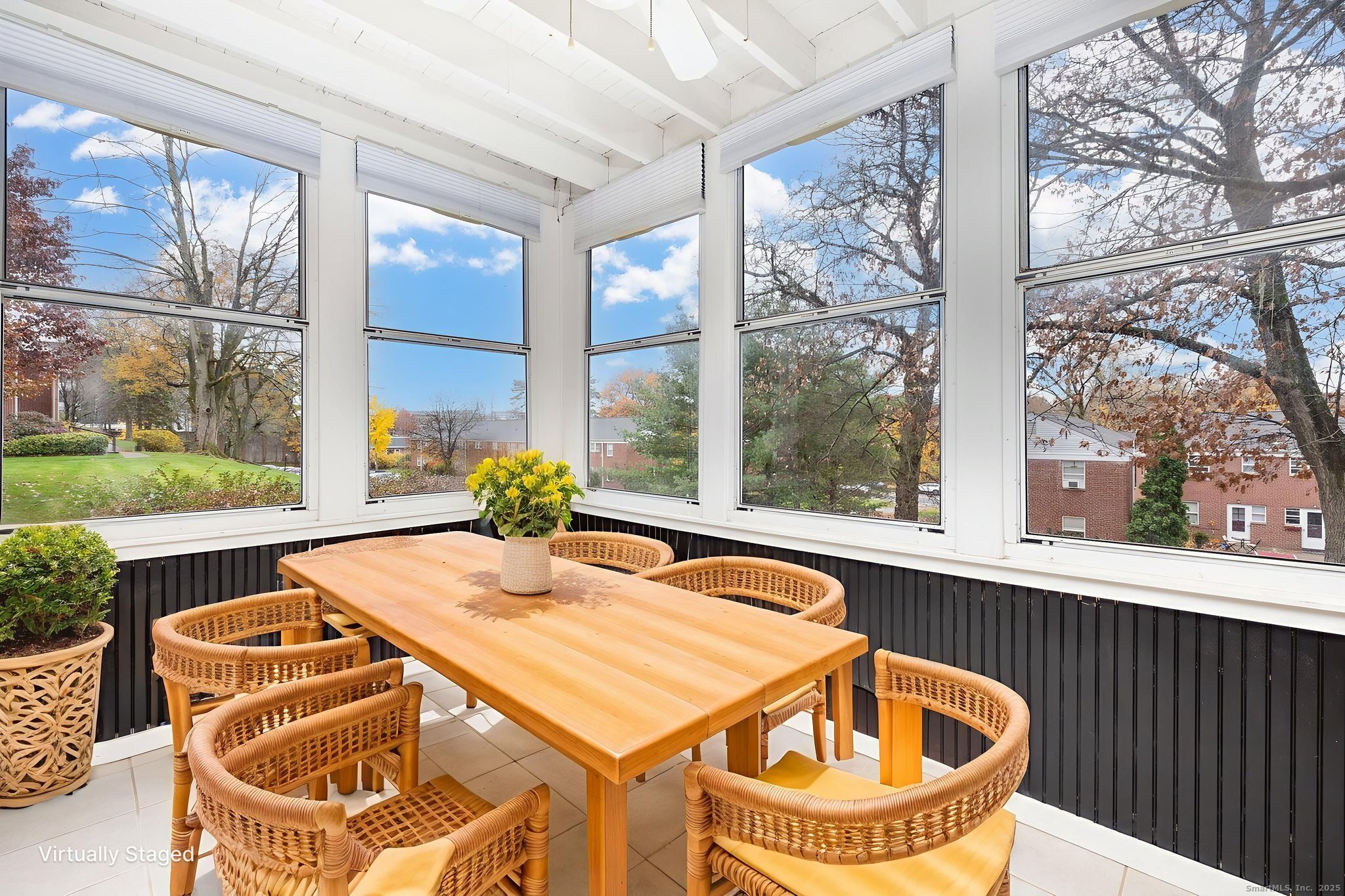 Just one block from Blue Back Square, this beautifully updated ranch-style condo offers convenience, comfort, and style in the heart of West Hartford. Step inside to find a thoughtfully refreshed 1, 100 sq ft layout featuring new recessed lighting, hardwood floors, upgraded electrical outlets and switches, and a seamless flow between the living and dining areas. LOW ELECTRIC COST Natural light pours in from sunrise to sunset warming the living room in the morning and the three-season room in the evening. The kitchen has been completely modernized with new cabinetry, granite countertops, under-cabinet lighting, and sleek hardware, creating an inviting space for everyday cooking or entertaining. The enclosed porch and additional back room with power access for electronics offer flexible options for relaxation, work, or hobbies. Additional features include a front closet with storage under the stairs, one reserved parking spot, a private storage unit located directly below the condo, and easy guest parking. Heat, hot water, and water are all included, keeping utility costs low and life simple. Experience refined living steps away from West Hartford's premier shops, restaurants, and entertainment.