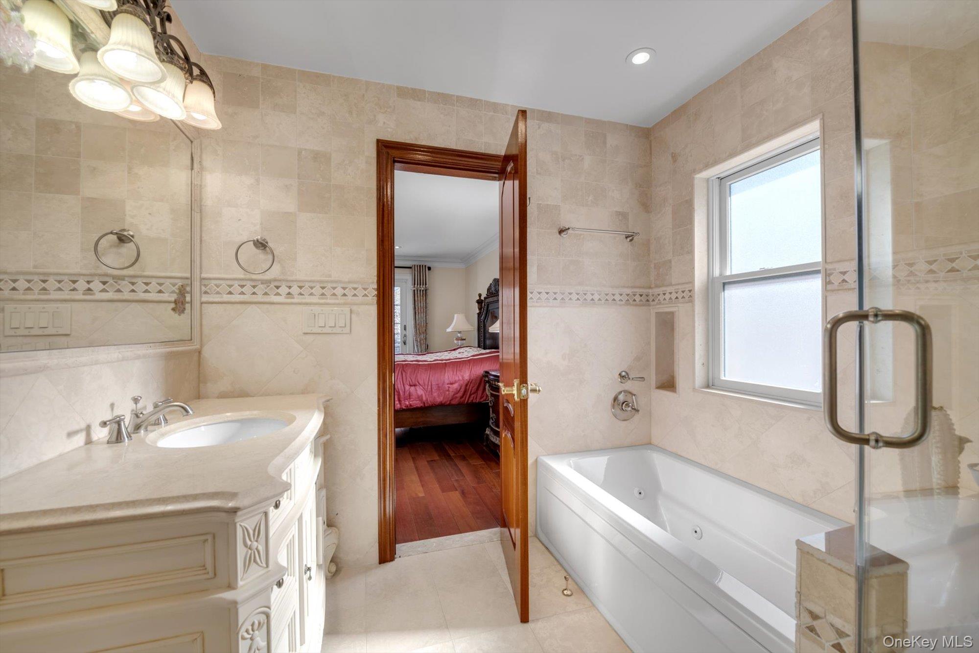 Luxury all-brick two-family residence offers exceptional craftsmanship and modern elegance throughout. The home features premium appliances, quartz countertops, and a stunning gourmet eat-in kitchen designed with both style and functionality in mind. High ceilings, recessed lighting, walk-in closets, and abundant natural light create an inviting atmosphere, while Andersen windows provide outstanding efficiency and durability. Brazilian cherry solid hardwood floors and Elegant exterior door and wood interior doors further elevate the home’s sophisticated design. The first floor, with its high ceilings, presents two generously sized bedrooms, one and a half beautifully finished bathrooms, and an impressive chef’s kitchen appointed with top-of-the-line appliances and quartz surfaces, creating an elegant setting for entertaining. The second floor features an expansive primary suite with a Jacuzzi and private shower. A private sitting area that can serve as an office or lounge. 2nd unit in the Rear. The fully finished high Seiling basement: Separate Entrance, a full bathroom, a wet bar, a washer and dryer, a guest room, and a versatile entertainment space, adding valuable living and hosting flexibility. The property is complete with a private driveway, a detached garage, and a beautifully maintained fenced backyard. School District 26. Close to Alley Pond Park, P. S. 213, public transportation, shopping, dining, and all neighborhood amenities.
