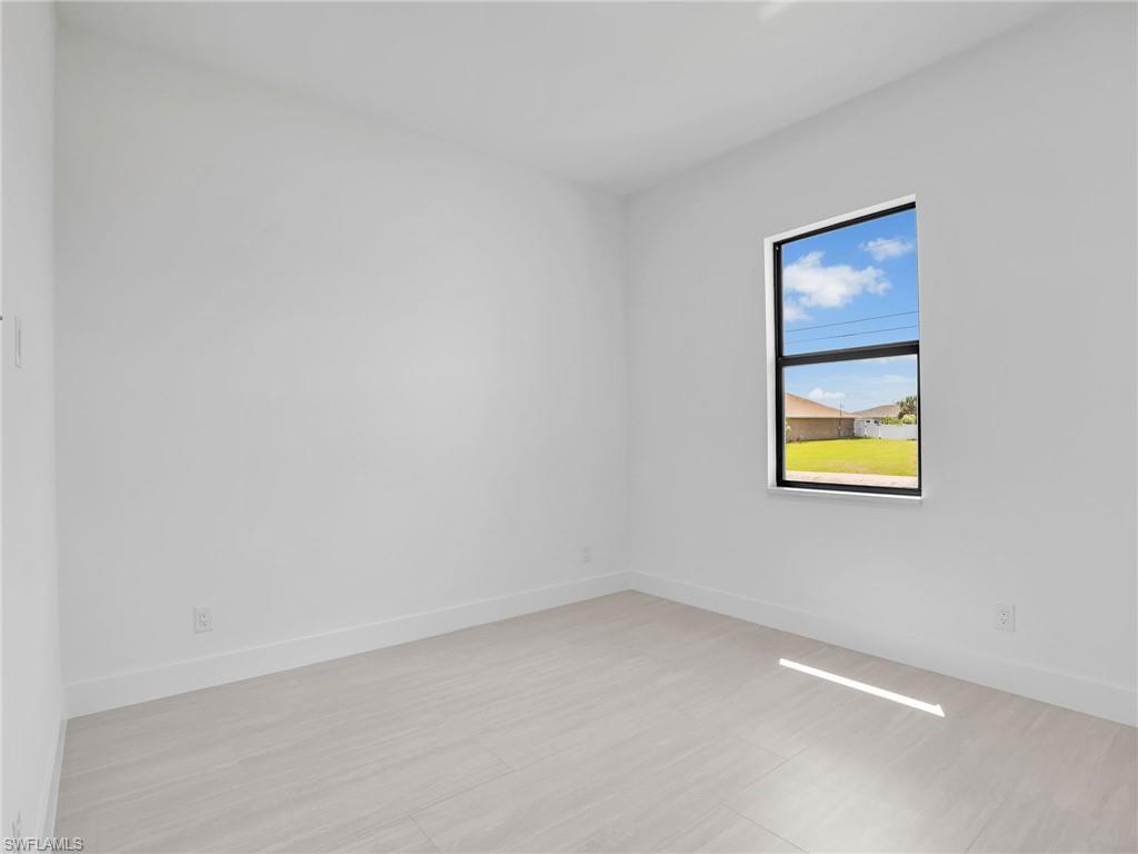 Brand-New Construction - Move-In Ready! This beautifully designed 3-bedroom + den, 2-bath home is ready for immediate occupancy in one of Cape Coral's most sought-after neighborhoods. Enjoy serene freshwater views right from your backyard. The home features: • A sleek modern kitchen with quartz waterfall island and premium stainless steel appliances • Soaring ceilings that enhance the open, airy feel • A spacious laundry room with a folding area and generous cabinetry • Impact-resistant doors and windows for safety and peace of mind • No Flood Insurance Required!