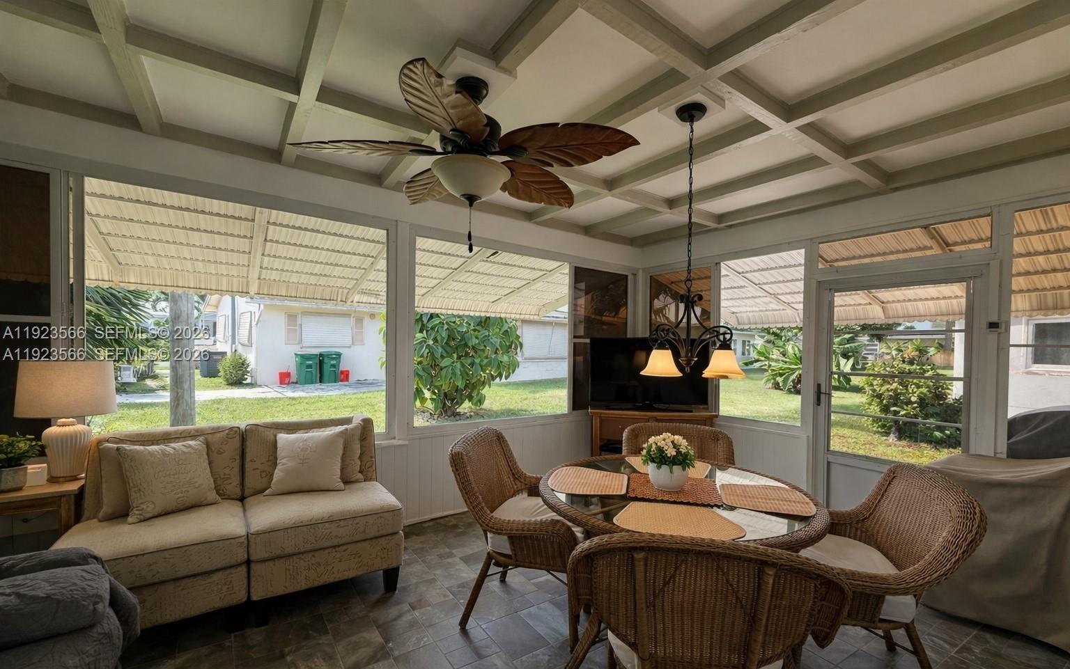 The Florida room is cozy and full of charm, featuring a beautiful ceiling and furnished with a full patio set and BBQ—perfect for relaxing or entertaining. The exterior also includes a water hose hookup and retractable clothesline.
