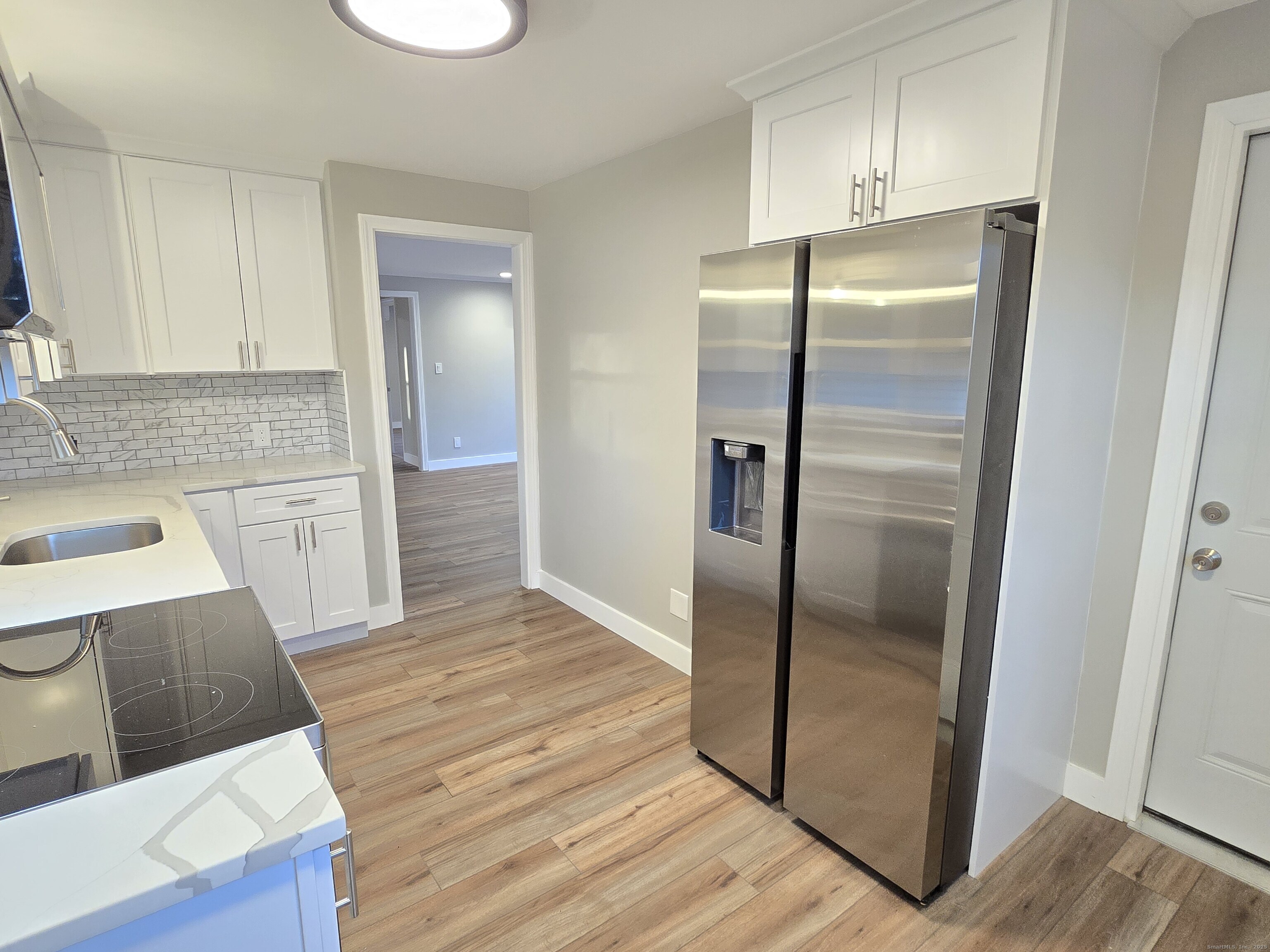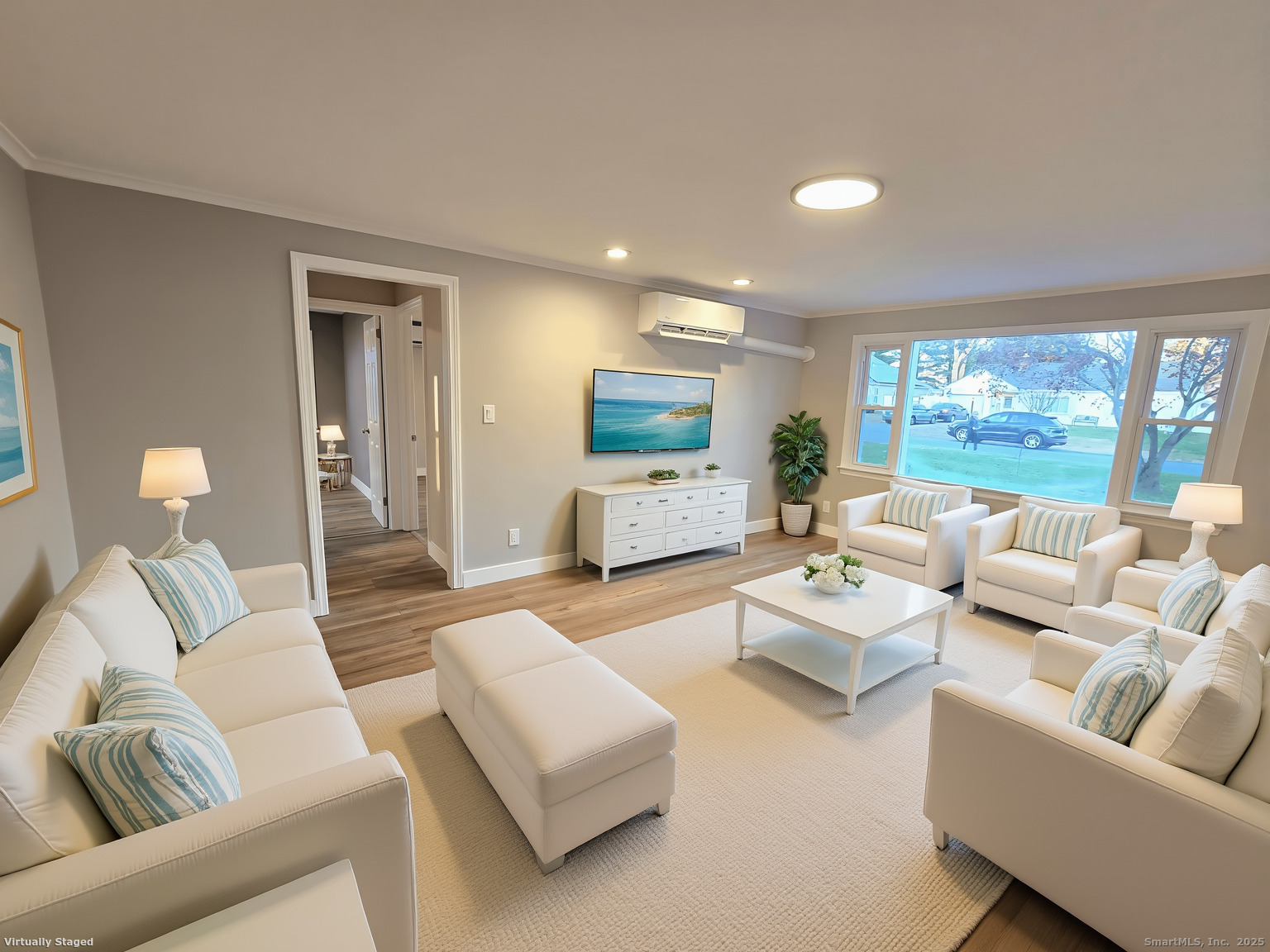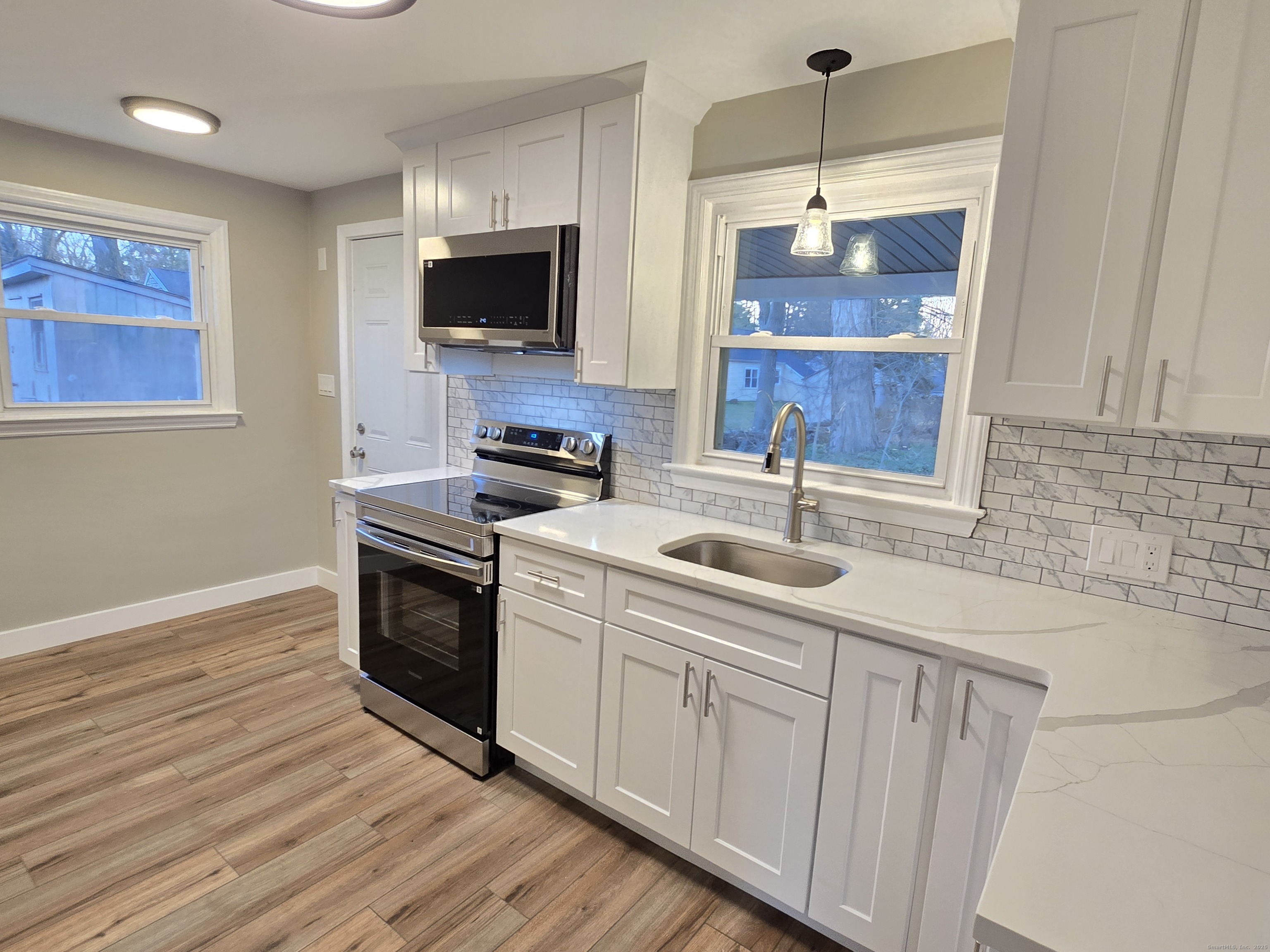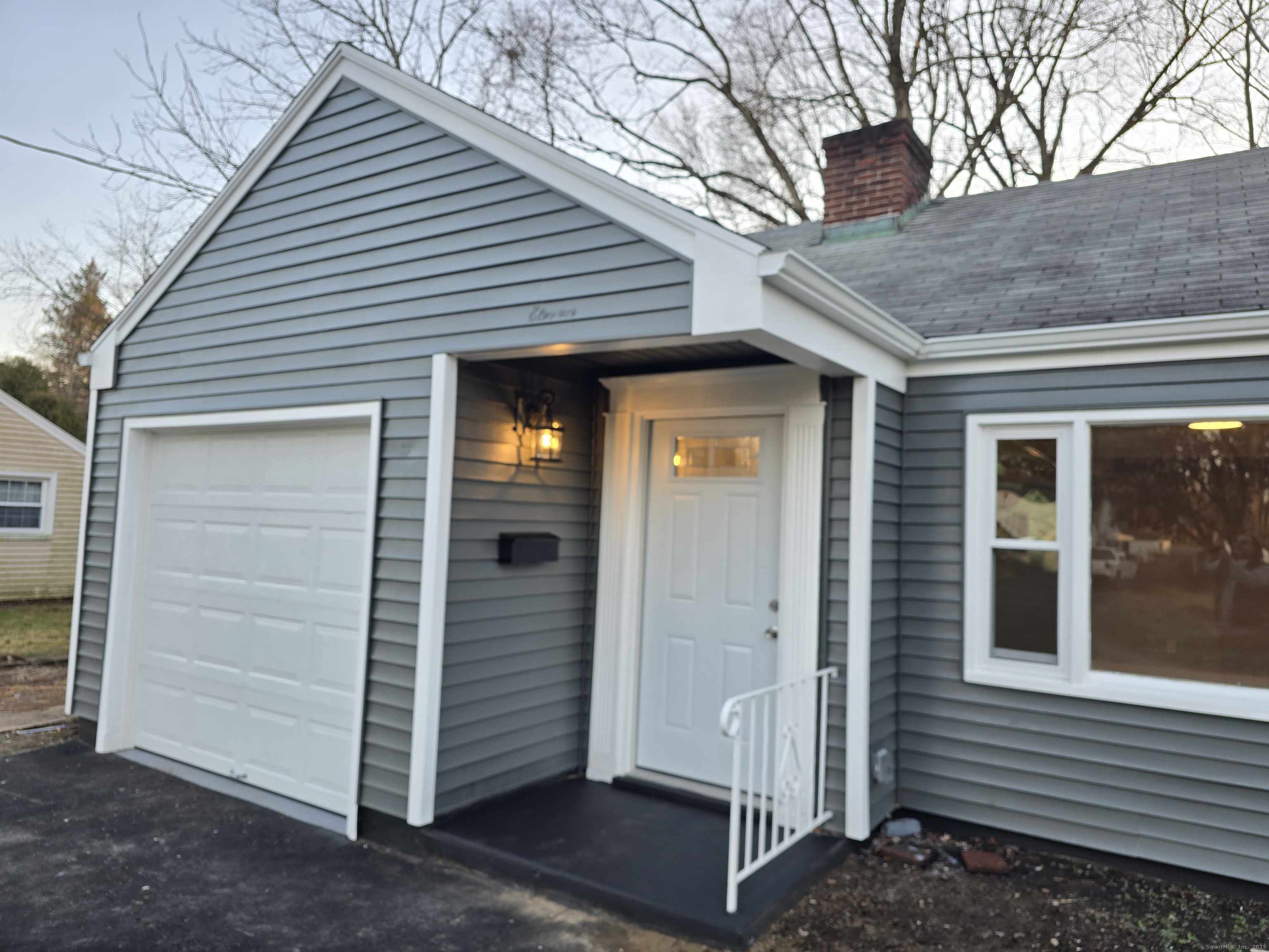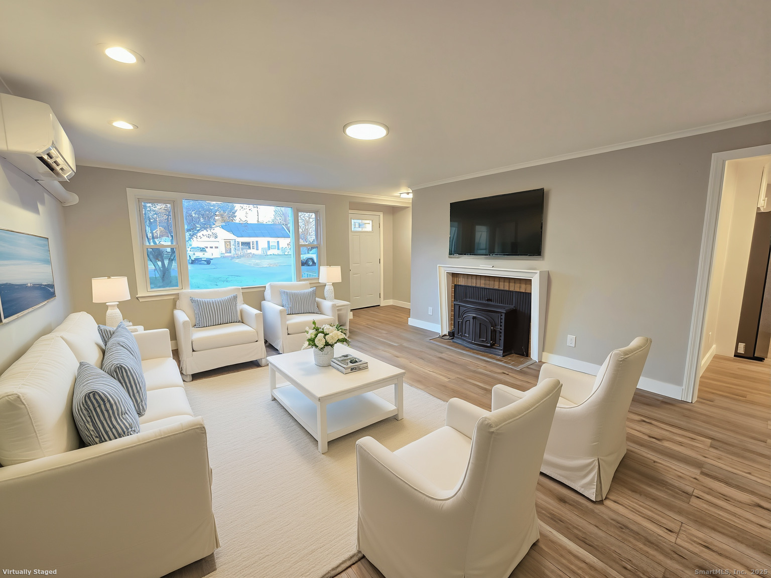 Totally renovated and move-in ready, this gorgeous ranch offers effortless one-floor living with quality upgrades throughout. Step into a beautiful, modern kitchen featuring granite countertops, tile backsplash and flooring, new cabinets, and stainless steel appliances. Gleaming hardwood floors flow into the spacious living room, complete with a cozy fireplace, wood stove insert, and a large picture window that fills the home with natural sunlight. The new bathroom showcases stunning tilework and stylish fixtures. Generously sized bedrooms offer excellent closet space, and the entire home is enhanced with brand-new windows. Enjoy year-round comfort with high-efficiency ductless zoned mini-split systems for both heating and cooling. Outside, relax on the covered rear patio overlooking a large, level, private backyard that's partially fenced-perfect for gatherings, pets, or play. Additional highlights include an attached garage and a newly paved driveway. Ideally located near parks, shopping, and with easy access to major highways, this home delivers modern comfort, convenience, and exceptional value. Don't miss it!