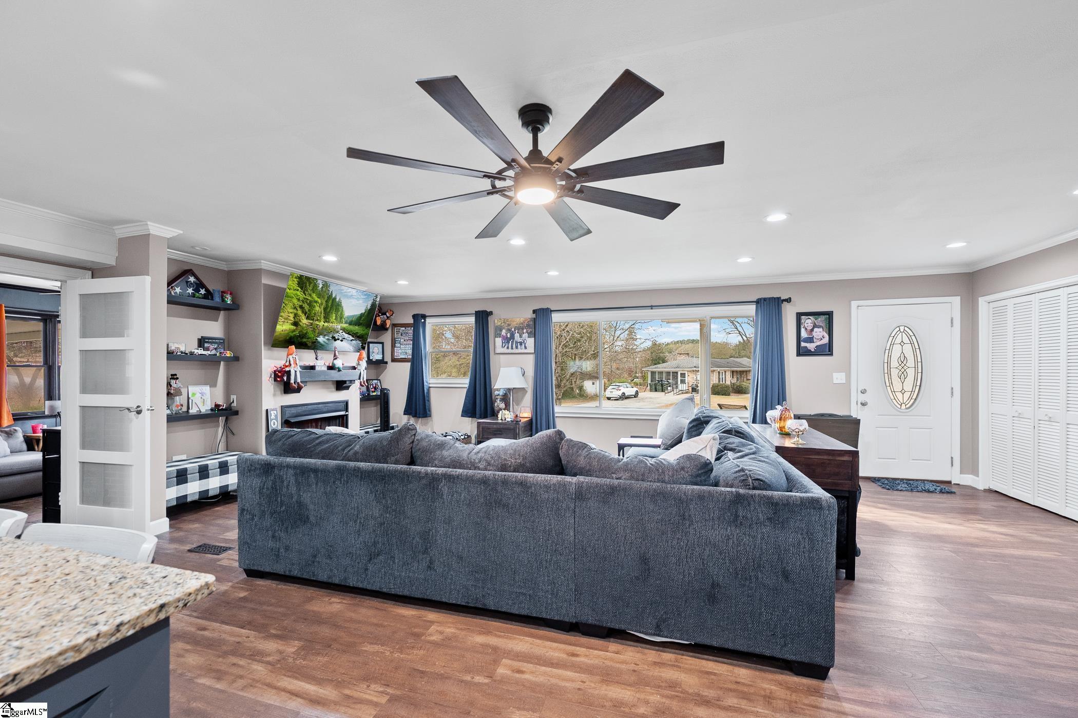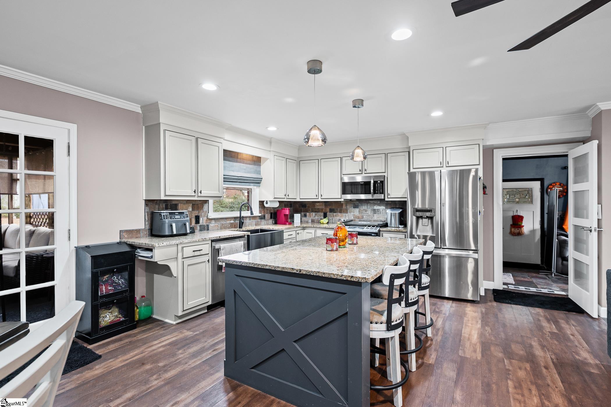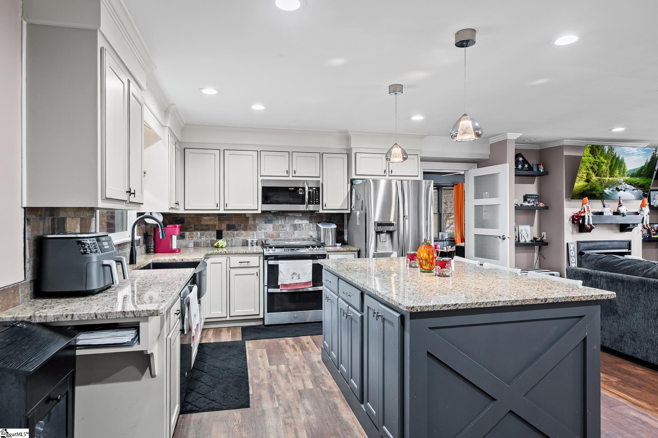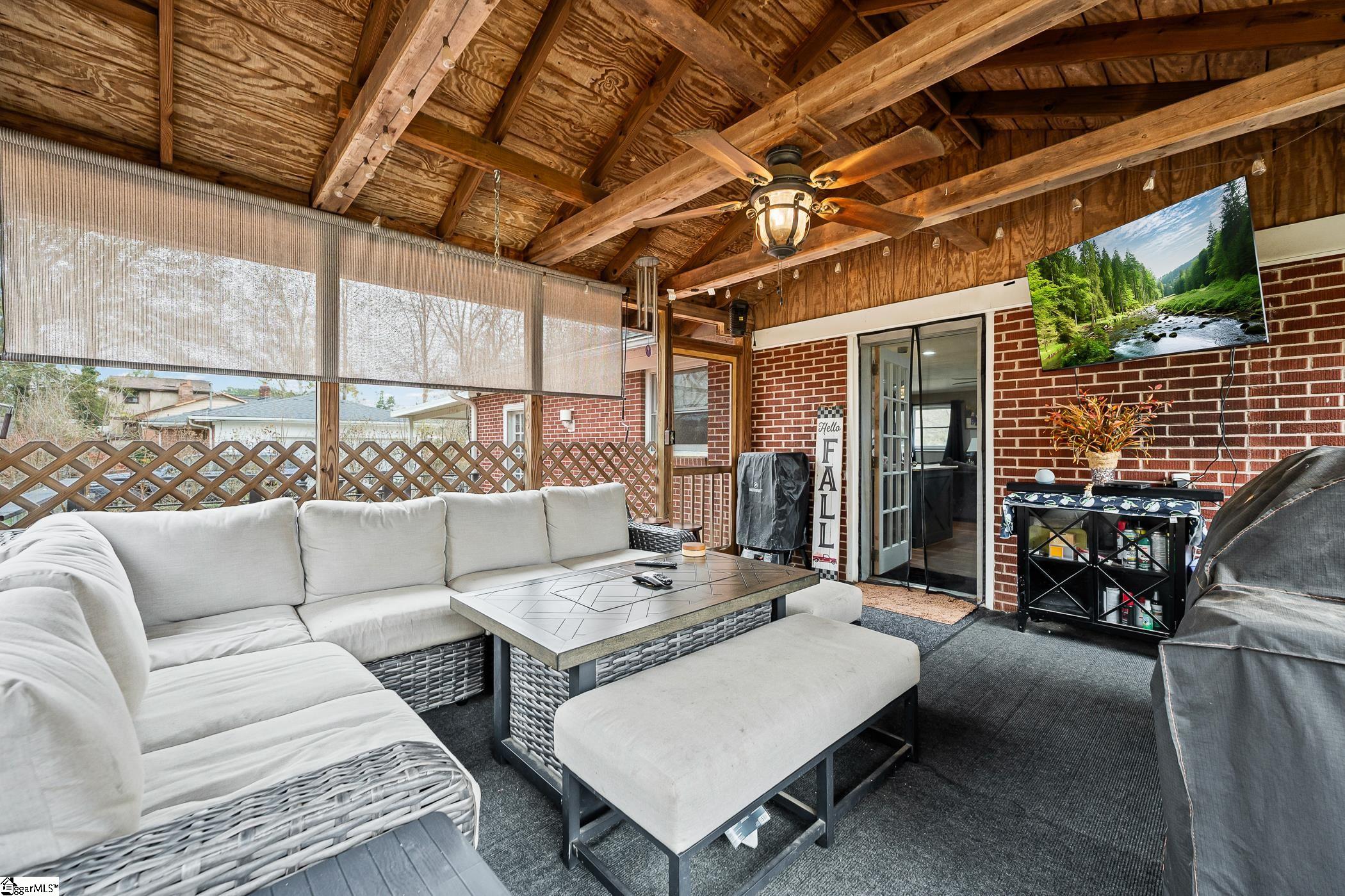 Space, style, and an unbeatable location—this beautifully updated Forest Acres home checks every box! Welcome home to this meticulously maintained 4-bedroom, 2-bath all-brick beauty, perfectly situated on a generous ½-acre lot just minutes from Easley’s shopping, dining, and entertainment, with easy access to Highway 123 and Powdersville Road. From the moment you arrive, you’ll be charmed by the freshly landscaped front beds, featuring soft-touch hollies and colorful seasonal blooms, setting the tone for what awaits inside. Step through the door and bask in the natural light streaming through the triple front windows, reflecting off the sparkling laminate floors and highlighting the custom built-ins and warm masonry fireplace in the inviting living room. The bright, open white kitchen is both functional and stylish, offering crisp cabinetry, a contrasting island, stainless gas range, and plenty of prep space—perfectly positioned beside the spacious dining area for effortless entertaining. Both bathrooms have been thoughtfully remodeled with tile floors, counter-height vanities, and updated fixtures. The hall bath steals the show with its oversized Roman-style shower with seating, creating a spa-like experience at home. All four bedrooms are generously sized, and a versatile flex room (or optional 5th bedroom)—with its own private entrance from the carport—makes an ideal home office, gym, playroom, or guest space. Outdoor living truly shines here. Enjoy quiet mornings or evening gatherings on the screened porch or spread out across the two-tiered deck overlooking your fully fenced backyard. Two storage buildings with electricity—including a 28’ x 14’ outbuilding—offer endless possibilities for hobbies, workshop space, or additional storage. Mature oak trees add charm and tranquility to the outdoor setting. With brick construction, vinyl trim, tilt-out windows, and updated interiors, this home offers both durability and modern comfort—plus a location that makes daily life effortless. Homes like this don’t come around often. Schedule your private showing today and see why this Forest Acres gem deserves your attention!