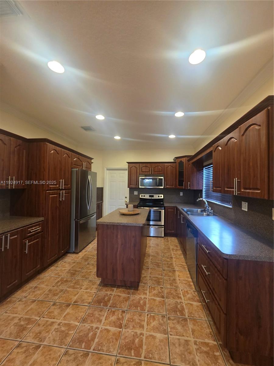 Beautiful four bedroom, two bathroom single-family home, with one car garage. Central air conditioned, tiled throughout, large furnished walk-in closet in master bedroom, French doors, stainless steel appliances, washer and dryer. Also has crown moldings, beautiful chandeliers, wood blind window treatments and beautiful landscaping. Fenced backyard with large tile patio conveniently located near the Florida turnpike. Walking distance to shopping centers, grocery store and restaurants. Close to Homestead Air Force Base and Baptist Hospital. No association fees.