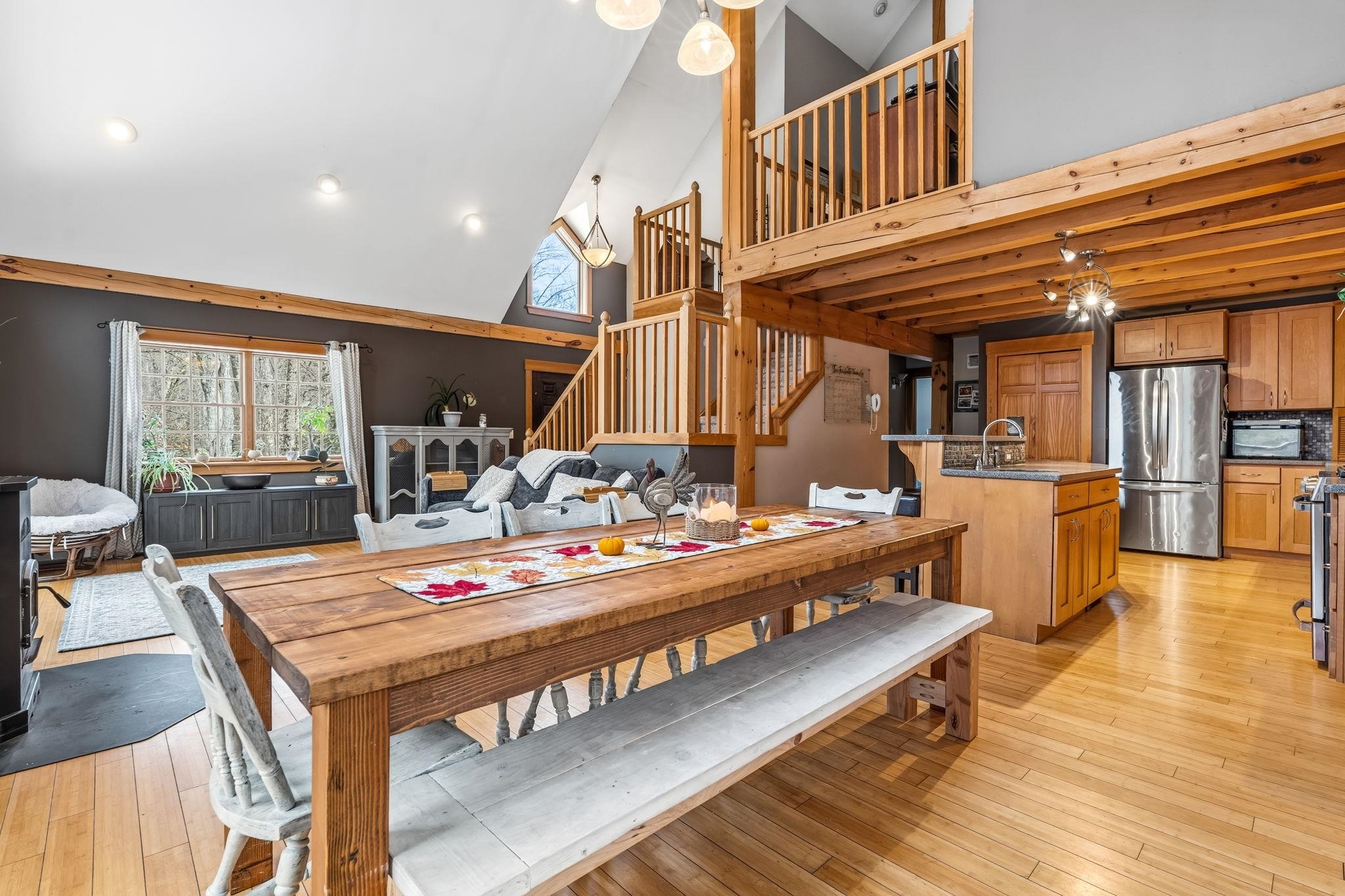 Beautiful post-and-beam retreat with deeded access to Highland Lake in beautiful Stoddard! An ideal vacation getaway or year-round home, this house is completely move-in ready, and includes many recent updates. Cathedral ceilings and exposed beams create an open, sun-filled main living area, centered on a cozy pellet stove and huge windows. The kitchen is built for entertaining, with a center island and prep sink, good lighting and lots of lovely cabinets. A large screened porch and adjacent (Trex) deck expand your living area outdoors—perfect for morning coffee or summer barbecues. The primary suite features a walk-in closet, bathroom with both a soaking tub and a shower, and peaceful views. In the basement there is an insulated two-car garage, a bonus room with laundry, and generous storage. Thoughtful construction and modern touches meet rustic character in this LEED-certified contemporary, all set on a quiet country lot. Just a few hundred yard away is your deeded access to the lake, available exclusively to a few local homeowners, with nearby marina, boat ramp and miles of trails for hiking or snowmobiling. And the stars. . . you might never have seen them so bright as you will here on a cloudless night. All this just 30 minutes to Keene or Peterborough and 60 min to Concord. But be warned: You might never want to go anywhere else once you get here! It's the complete package, so come take a look and make it yours!