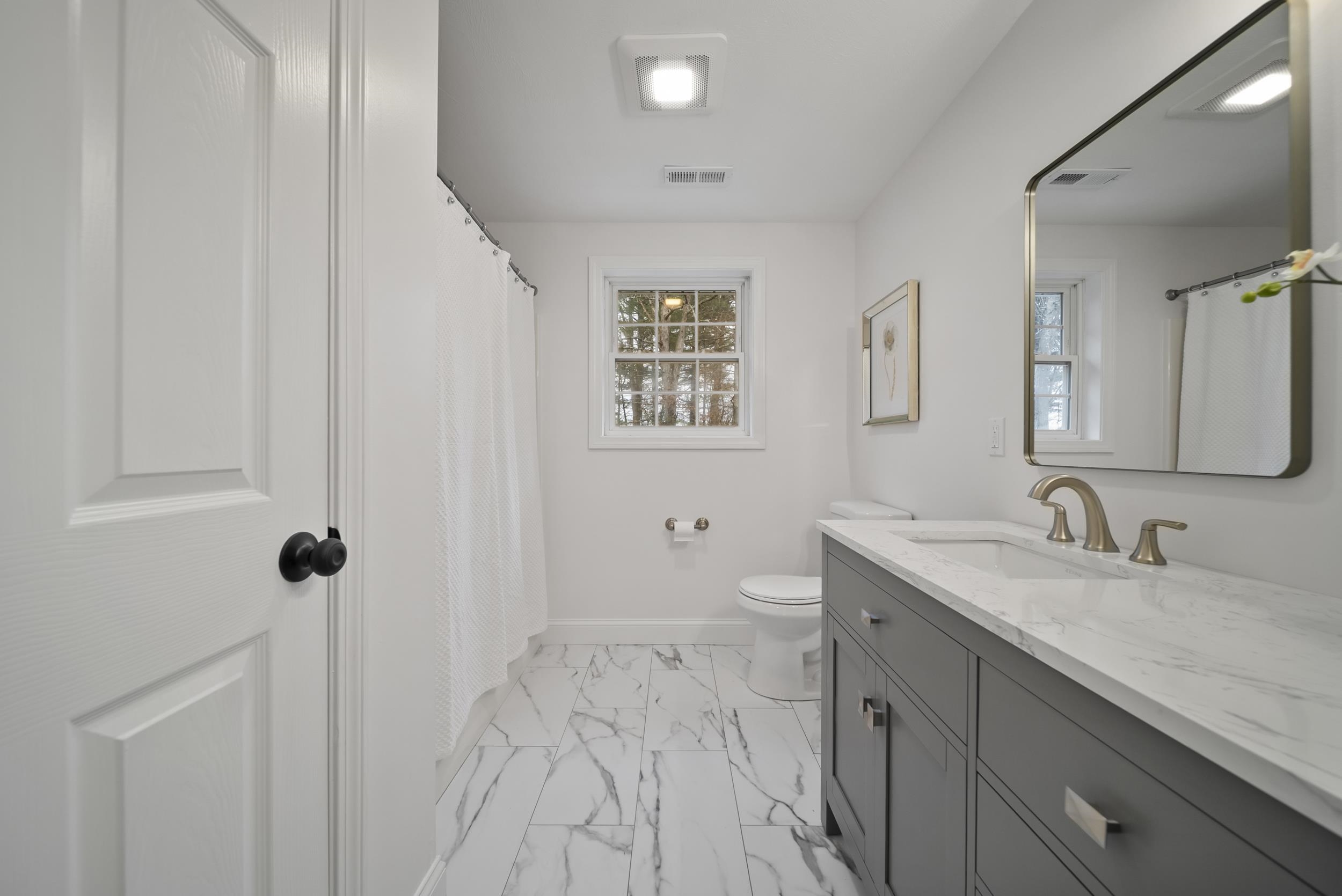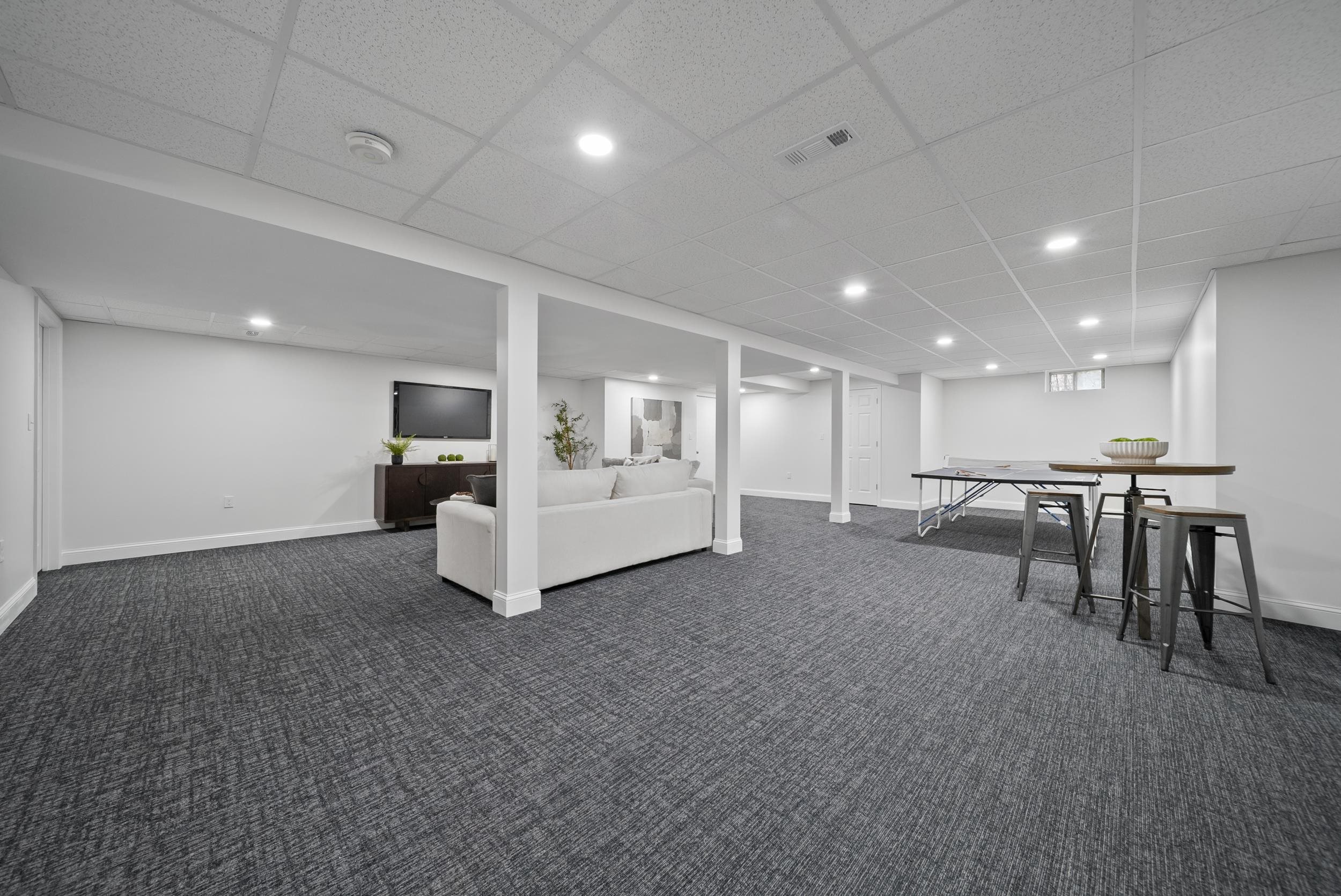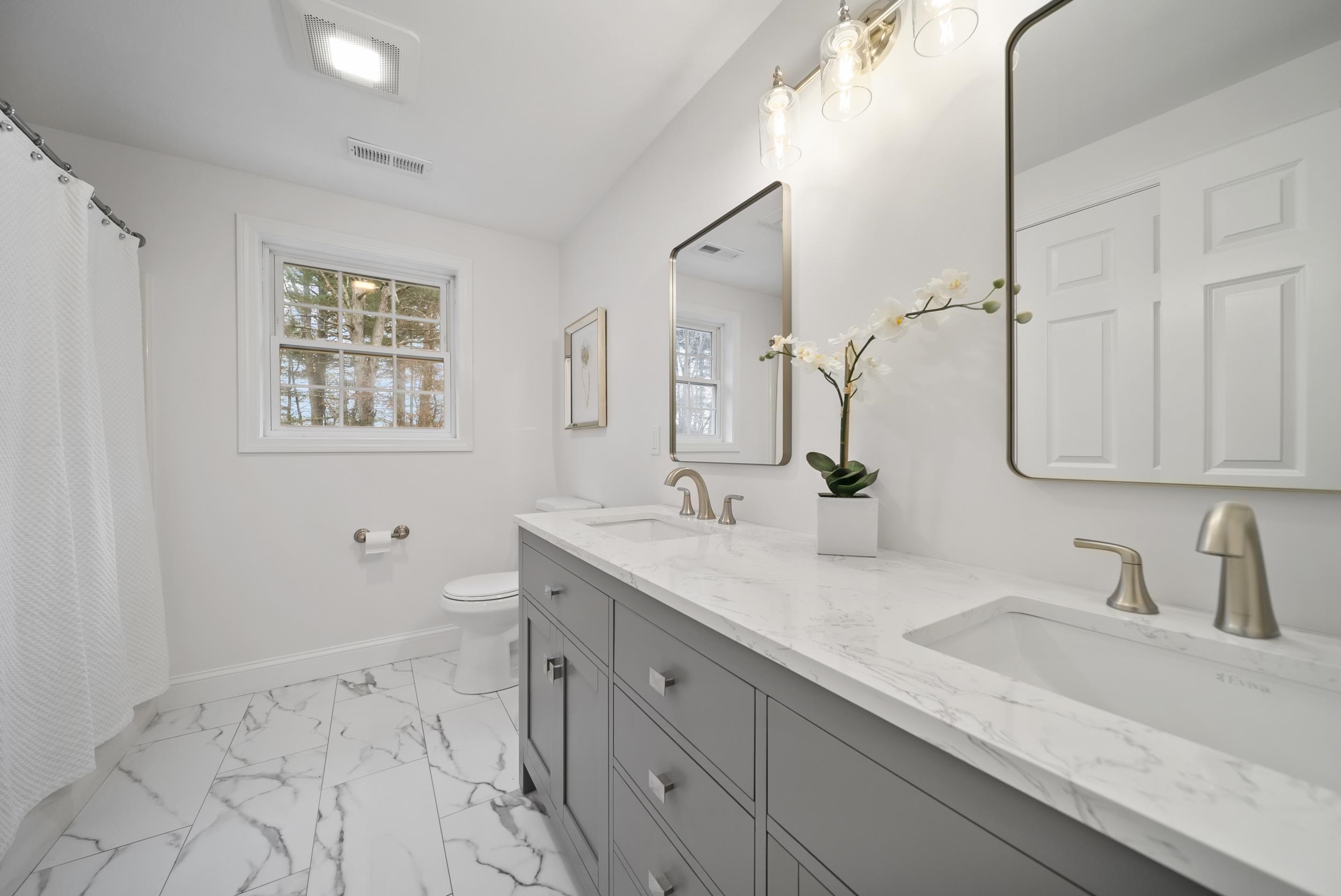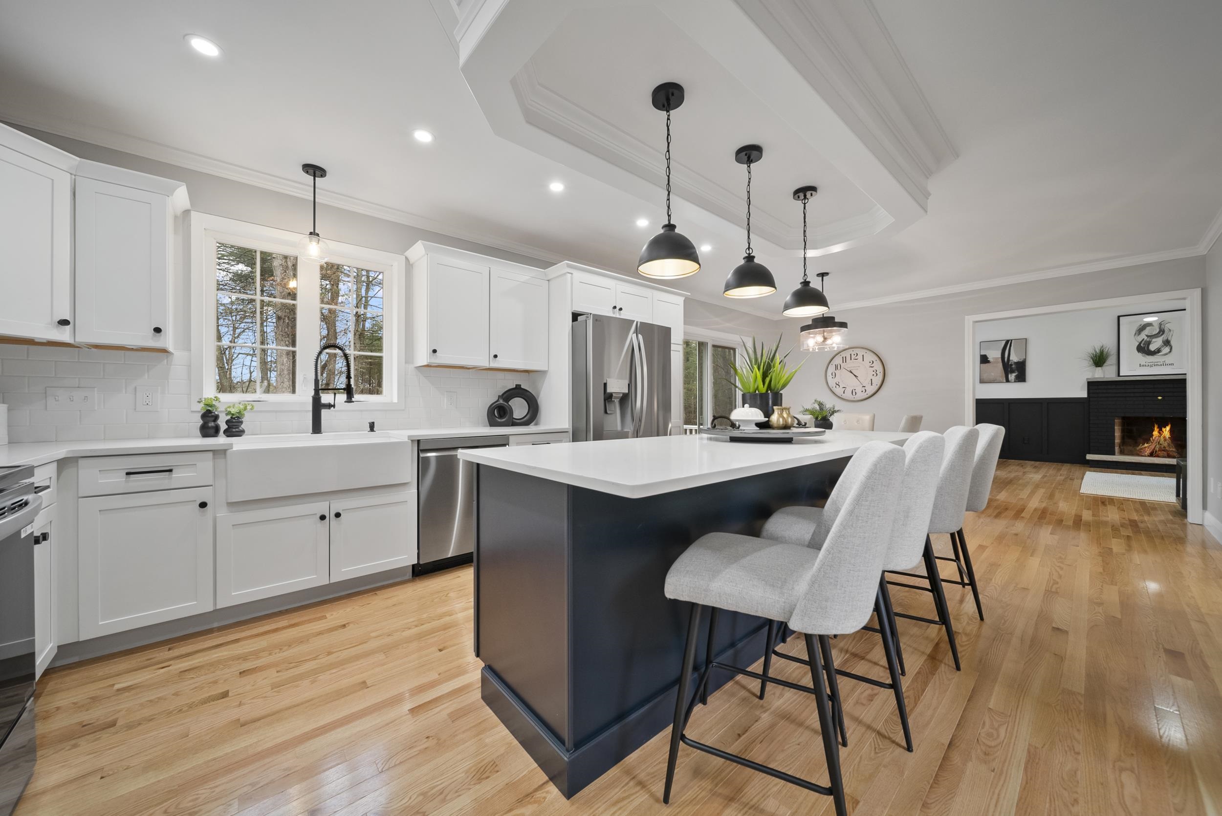 Tired on waiting for new construction but want the peace of mind that comes with it? Look no further than 27 Buckingham! This home has been masterfully renovated from top to bottom in a highly desirable community. Enjoy maintenance free living with a brand new roof, HVAC system & public utilities (water, sewer, natural gas). Step through the light filled foyer and into the heart of the home: the chef-inspired kitchen. It features an 8-ft island, granite countertops, stainless steel appliances and an elegant coffered ceiling. The eat in area provides seamless access to the deck where you can overlook your private backyard. The adjacent living room boasts vaulted ceilings, a cozy wood fireplace & custom accent wall. The first floor is completed by a home office, a formal dining room and convenient half bath. Upstairs, your private escape awaits in the spacious primary suite. Indulge in the spa-like en-suite, featuring a jacuzzi tub, a custom tile shower and double vanity. All complemented by a seating area & walk in closet. Three additional generous bedrooms and a full bath complete the second level. The finished basement space delivers limitless potential with a large bonus room. Complete with a 2 car garage and unbeatable location—close to highways, great schools, shopping & the airport—this home is turn key perfection. Just unpack and settle into your stunningly renovated residence. Delayed showings until the open house on 12/6 from 11am-2pm. Agent interest.