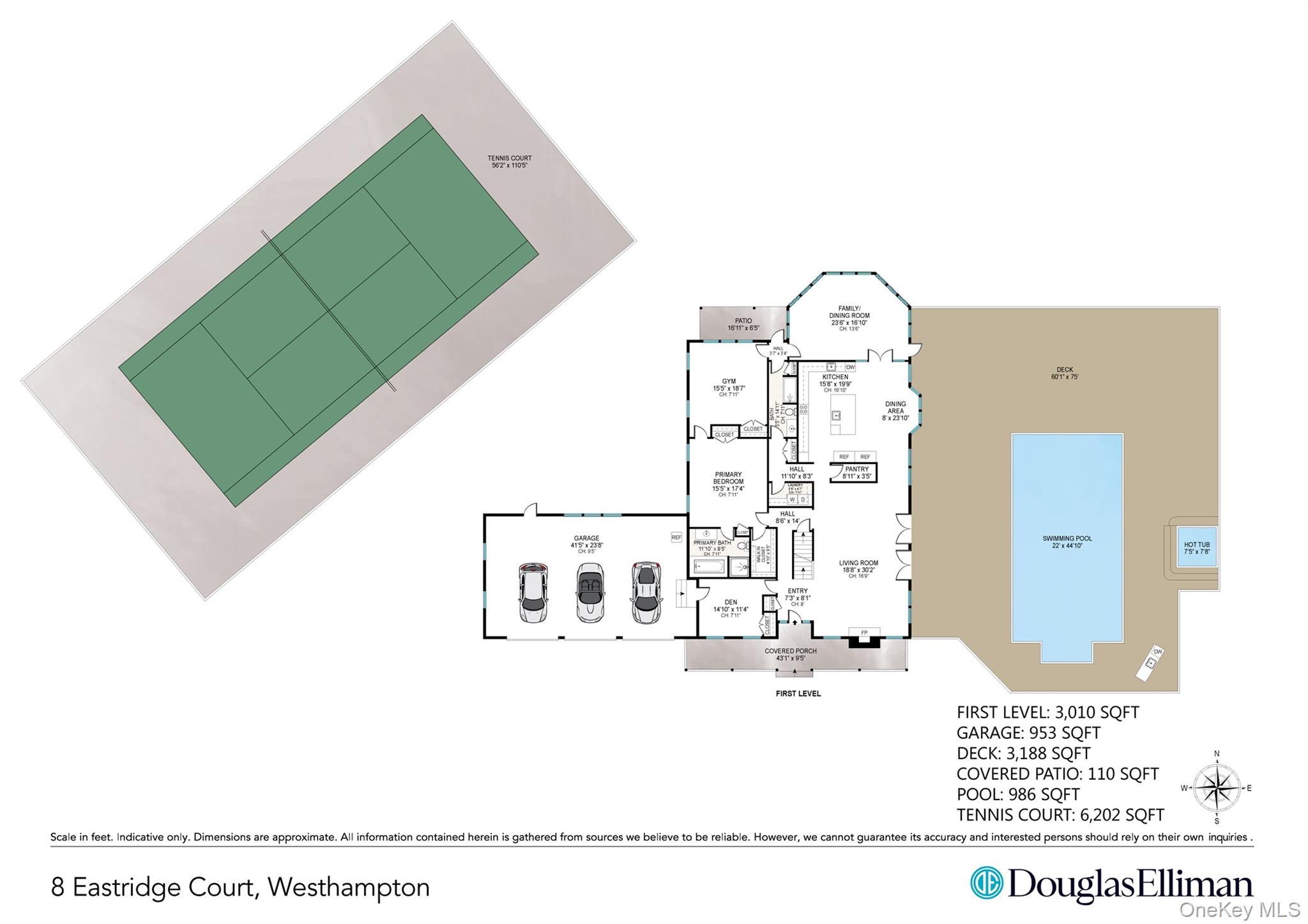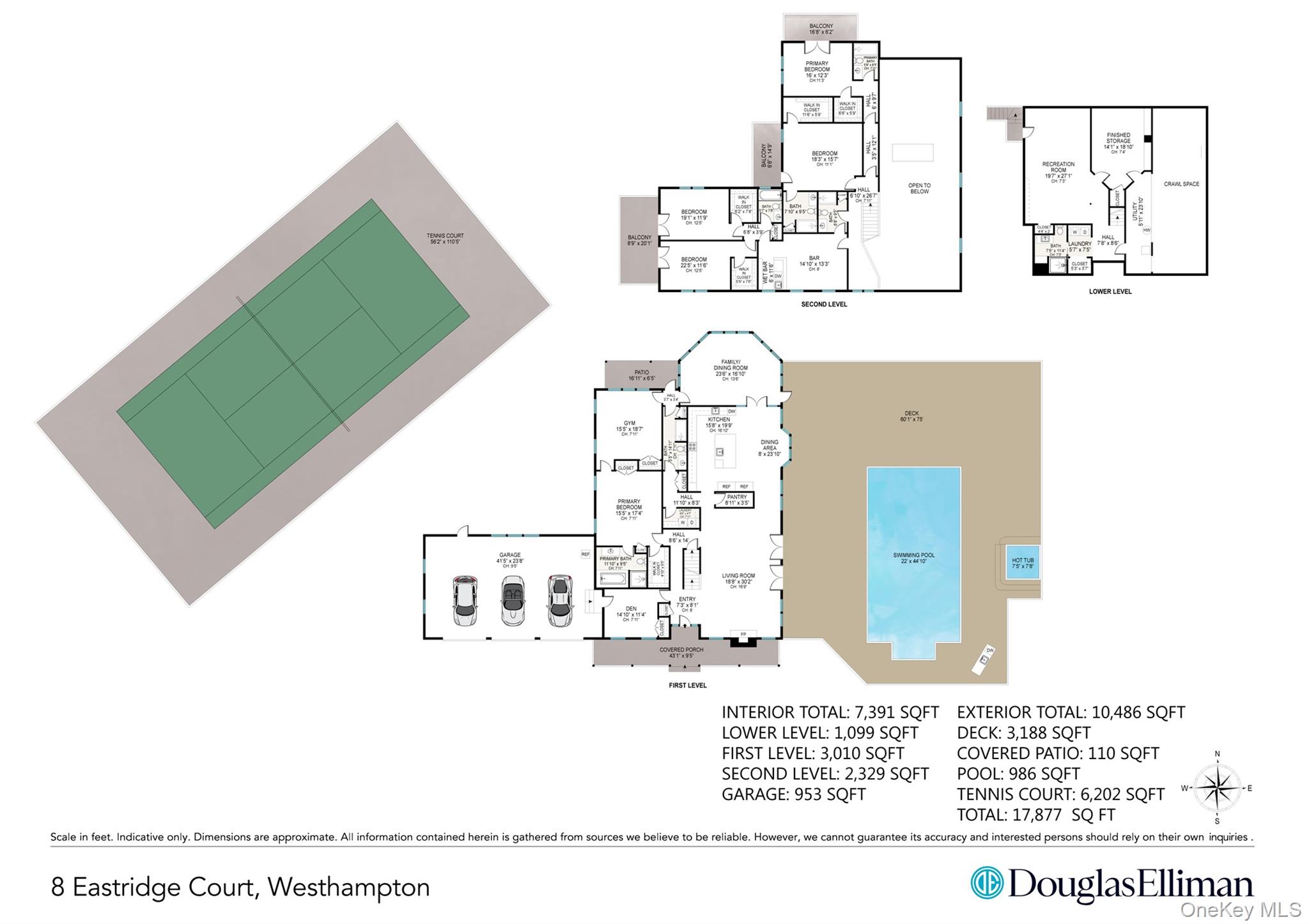 Welcome to 8 East Ridge Ct Westhampton. Set at the end of a quiet cul de sac, this stately move-in ready post modern home is set down a long private driveway situated on a meticulously landscaped 1. 49 acre parcel complete with an all weather tennis court, heated salt water pool, outdoor spa, large entertaining deck as well as a gazebo. The 4, 800+ sq ft above grade home features 5 bedrooms, 7 baths plus numerous bonus areas. The first level open floor plan includes high vaulted ceilings, a large entertaining living room with wood burning fireplace, an open dining/kitchen area with high-end double Thermador refrigerators/freezers, double Viking ovens as well as an expansive open sunroom/dining room off the kitchen overlooking the yard. The main level also features the primary ensuite bedroom with walk in closet, jacuzzi tub and an entryway into a gym/bonus room. In addition, there is another bonus room/den, laundry room, bathroom and walk in pantry. Venture upstairs where you will enjoy an English style pub bar with custom woodwork, 4 bedrooms (three with outdoor decks/balconies) and 4 bathrooms. There is high end custom trim work/hardware, solid hard wood doors and numerous large windows/glass doors throughout the home bringing the natural light inside. A finished basement with outdoor stairs includes a recreation room, laundry, bathroom, finished storage and mechanicals. Plenty of parking as well as a large 3 car 1, 000+ sq ft heated oversized garage. A lifestyle retreat with an easier commute to NYC. Close to Westhampton Beach village, waterfront Hampton's/North Fork restaurants, beaches, shopping, vineyards and farms.