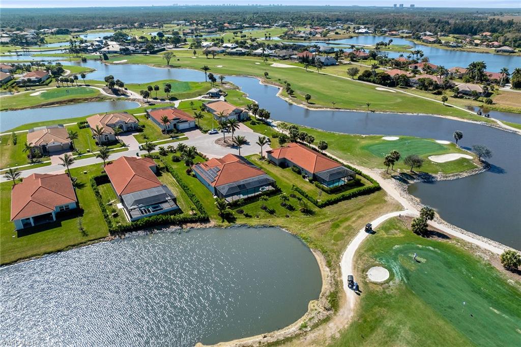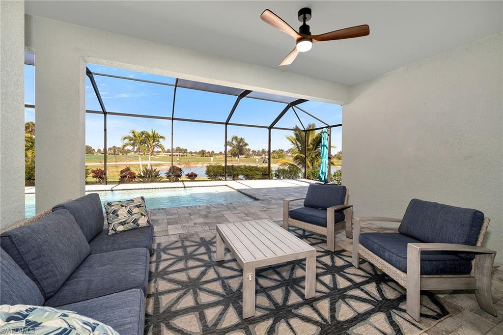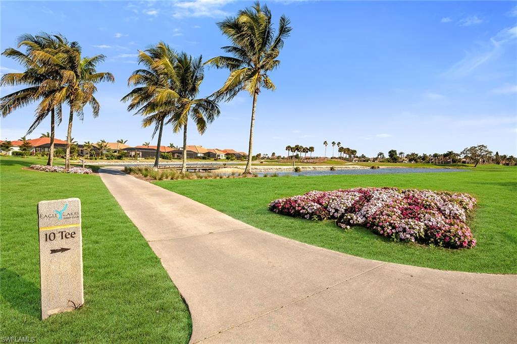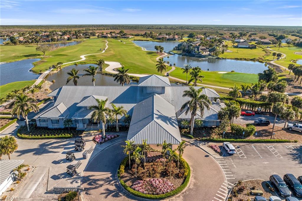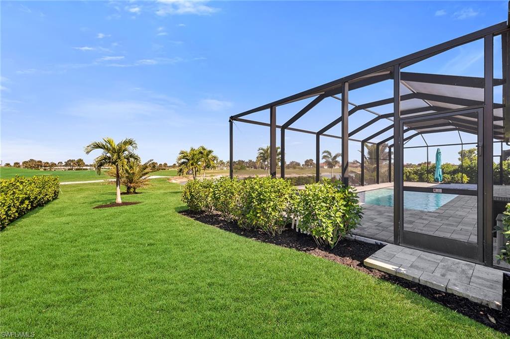 Motivated seller! Closing cost assistance and a one-year home warranty offered to the buyer. On a large cul-de-sac lot, this private home offers peaceful views of a lake and the Eagle Lakes Golf Club, overlooking the 18th hole. Built in 2021 by D. R. Horton, this inviting home features a spacious pool and spa layout, including four bedrooms plus a den, three baths and a three-car garage. The open design makes the space feel elegant and practical. The kitchen is ideal for cooking enthusiasts, with white cabinets, quartz countertops, a trendy tile backsplash and plenty of lighting. It also has a large island with a breakfast bar. The kitchen comes equipped with stainless steel Whirlpool appliances, including a stove, microwave, refrigerator and dishwasher. The dining area smoothly connects to the big living room, which has glass doors leading to a covered outdoor area, making outdoor entertaining easy. The main bedroom is a peaceful retreat with stunning views and a luxurious bath that features a double-sink vanity, a full mirror and a modern walk-in shower. The large walk-in closet has been customized for plenty of storage. The guest area has two comfortable bedrooms next to a stylish full bath that also serves as a bath for the pool. There is a third guest bedroom near another bath with a shower and tub. New carpet in the bedrooms adds a cozy feel. The flexible den, with French doors and built-in shelves, can serve as a home office or an extra bedroom. The outdoor space is a getaway, featuring a screened patio with brick pavers, a shaded seating area, and a saltwater pool and spa that has a waterfall. The seller has invested $47, 000 in solar panels for energy efficiency, lowering utility bills to just $20 a month, and they help keep the pool and spa comfortable year-round. For entertainment, the home has modern surround sound speakers and a subwoofer for an immersive music and movie experience. It also has high-quality glass windows and doors for safety, along with monitored ADT security for peace of mind. The three-car garage provides plenty of storage, with built-in shelves and space for a golf cart for easy travel around the community. Additional features include a transferable flood insurance policy, beautifully updated landscaping and negotiable furnishings. In the gated community of Royal Palm Golf Estates, this home has low HOA fees and is pet-friendly, with golf carts allowed on the streets. You’ll have access to the public Eagle Lakes Golf Club, which includes a clubhouse, restaurant and bar. Plus, it's just minutes from beaches of Marco Island, and shops and restaurants on Naples lively Fifth Avenue, making this home a blend of coastal charm and sophistication.