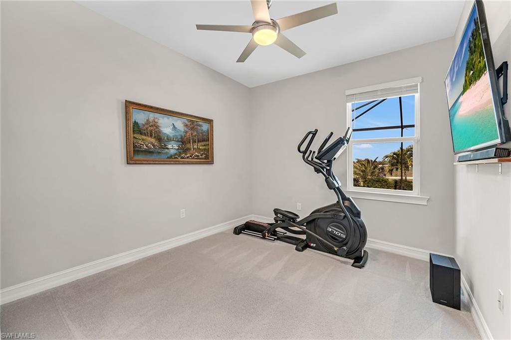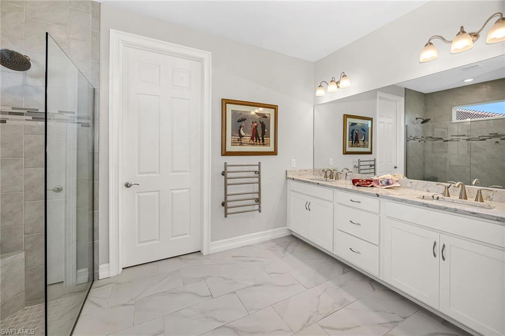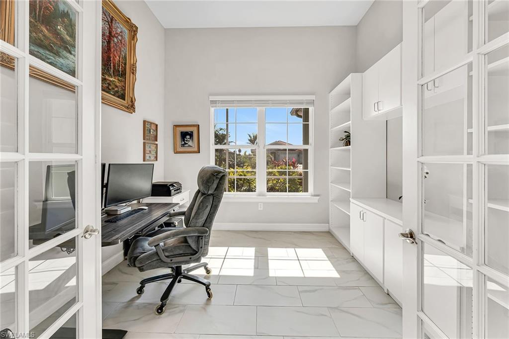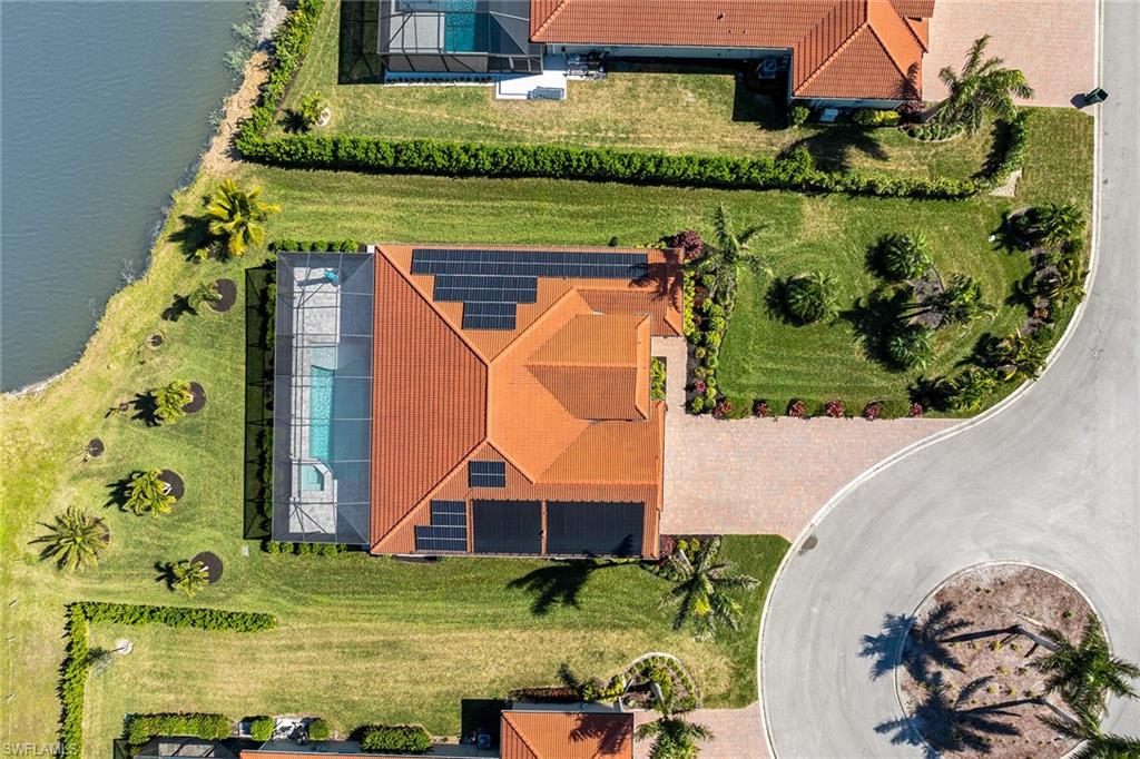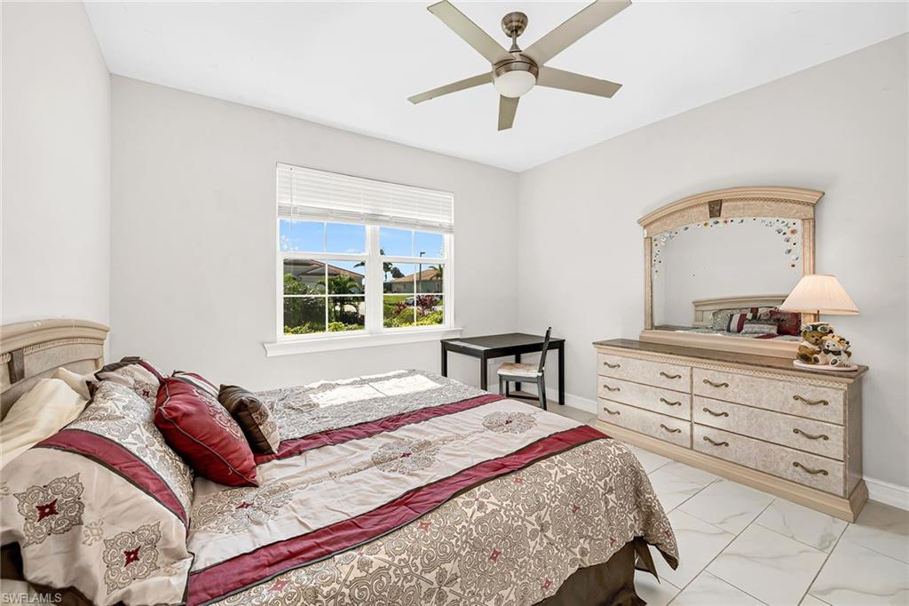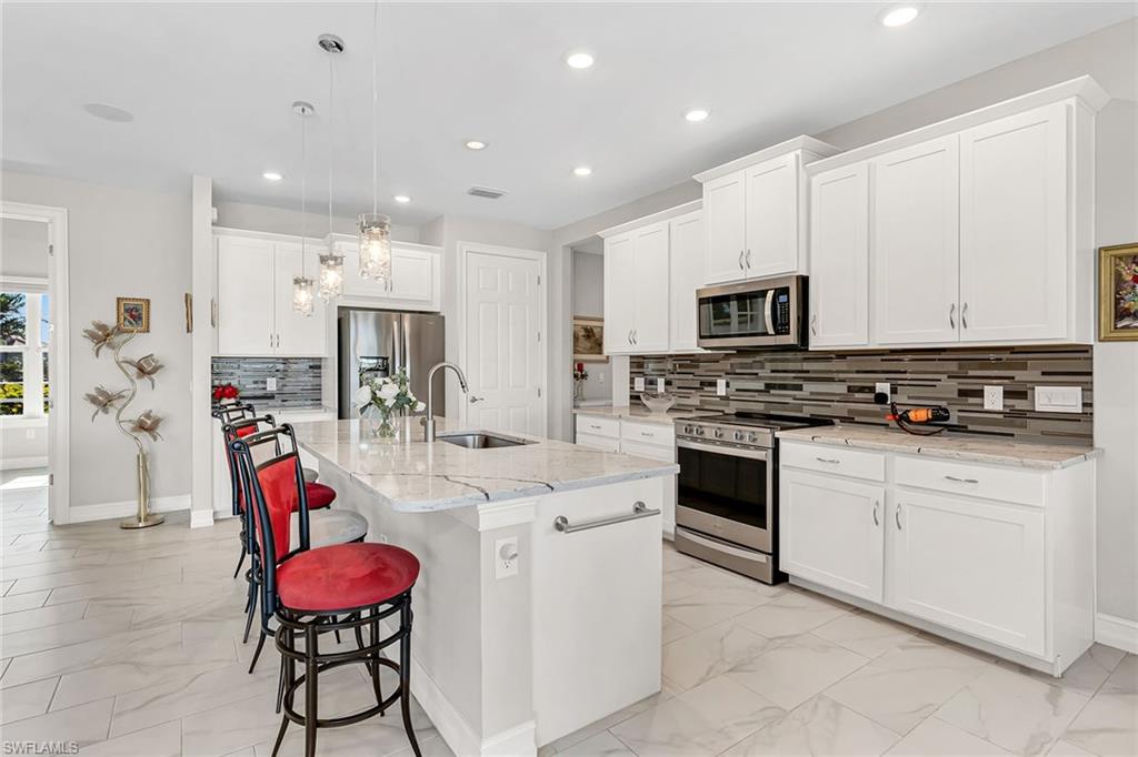 Motivated seller! Closing cost assistance and a one-year home warranty offered to the buyer. On a large cul-de-sac lot, this private home offers peaceful views of a lake and the Eagle Lakes Golf Club, overlooking the 18th hole. Built in 2021 by D. R. Horton, this inviting home features a spacious pool and spa layout, including four bedrooms plus a den, three baths and a three-car garage. The open design makes the space feel elegant and practical. The kitchen is ideal for cooking enthusiasts, with white cabinets, quartz countertops, a trendy tile backsplash and plenty of lighting. It also has a large island with a breakfast bar. The kitchen comes equipped with stainless steel Whirlpool appliances, including a stove, microwave, refrigerator and dishwasher. The dining area smoothly connects to the big living room, which has glass doors leading to a covered outdoor area, making outdoor entertaining easy. The main bedroom is a peaceful retreat with stunning views and a luxurious bath that features a double-sink vanity, a full mirror and a modern walk-in shower. The large walk-in closet has been customized for plenty of storage. The guest area has two comfortable bedrooms next to a stylish full bath that also serves as a bath for the pool. There is a third guest bedroom near another bath with a shower and tub. New carpet in the bedrooms adds a cozy feel. The flexible den, with French doors and built-in shelves, can serve as a home office or an extra bedroom. The outdoor space is a getaway, featuring a screened patio with brick pavers, a shaded seating area, and a saltwater pool and spa that has a waterfall. The seller has invested $47, 000 in solar panels for energy efficiency, lowering utility bills to just $20 a month, and they help keep the pool and spa comfortable year-round. For entertainment, the home has modern surround sound speakers and a subwoofer for an immersive music and movie experience. It also has high-quality glass windows and doors for safety, along with monitored ADT security for peace of mind. The three-car garage provides plenty of storage, with built-in shelves and space for a golf cart for easy travel around the community. Additional features include a transferable flood insurance policy, beautifully updated landscaping and negotiable furnishings. In the gated community of Royal Palm Golf Estates, this home has low HOA fees and is pet-friendly, with golf carts allowed on the streets. You’ll have access to the public Eagle Lakes Golf Club, which includes a clubhouse, restaurant and bar. Plus, it's just minutes from beaches of Marco Island, and shops and restaurants on Naples lively Fifth Avenue, making this home a blend of coastal charm and sophistication.