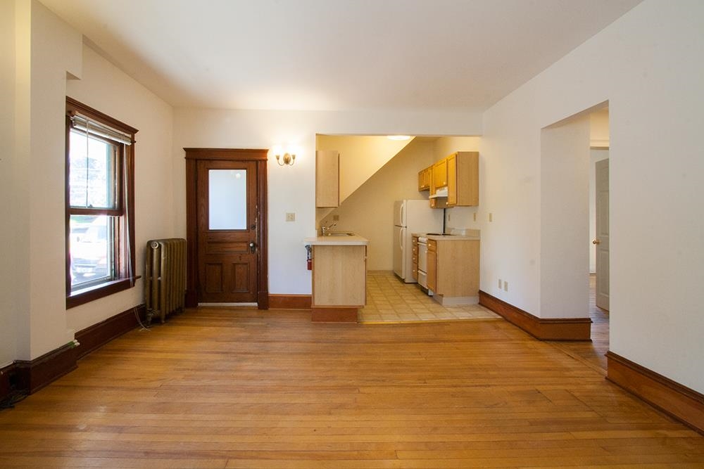 MOVE-IN 2025 First-floor, two-bedroom apartment with a large living room and open kitchen layout. Kitchen includes electric range and dishwasher. Original hardwood floors throughout. Both bedrooms have closets. One full bathroom with custom-tiled shower and built-in storage. Access to shared front porch. Laundry in building. Gas heat and gas hot water. Located one block from UVM and Fletcher Allen Hospital. Shared laundry in the basement. Tenant is responsible for electric and heat.