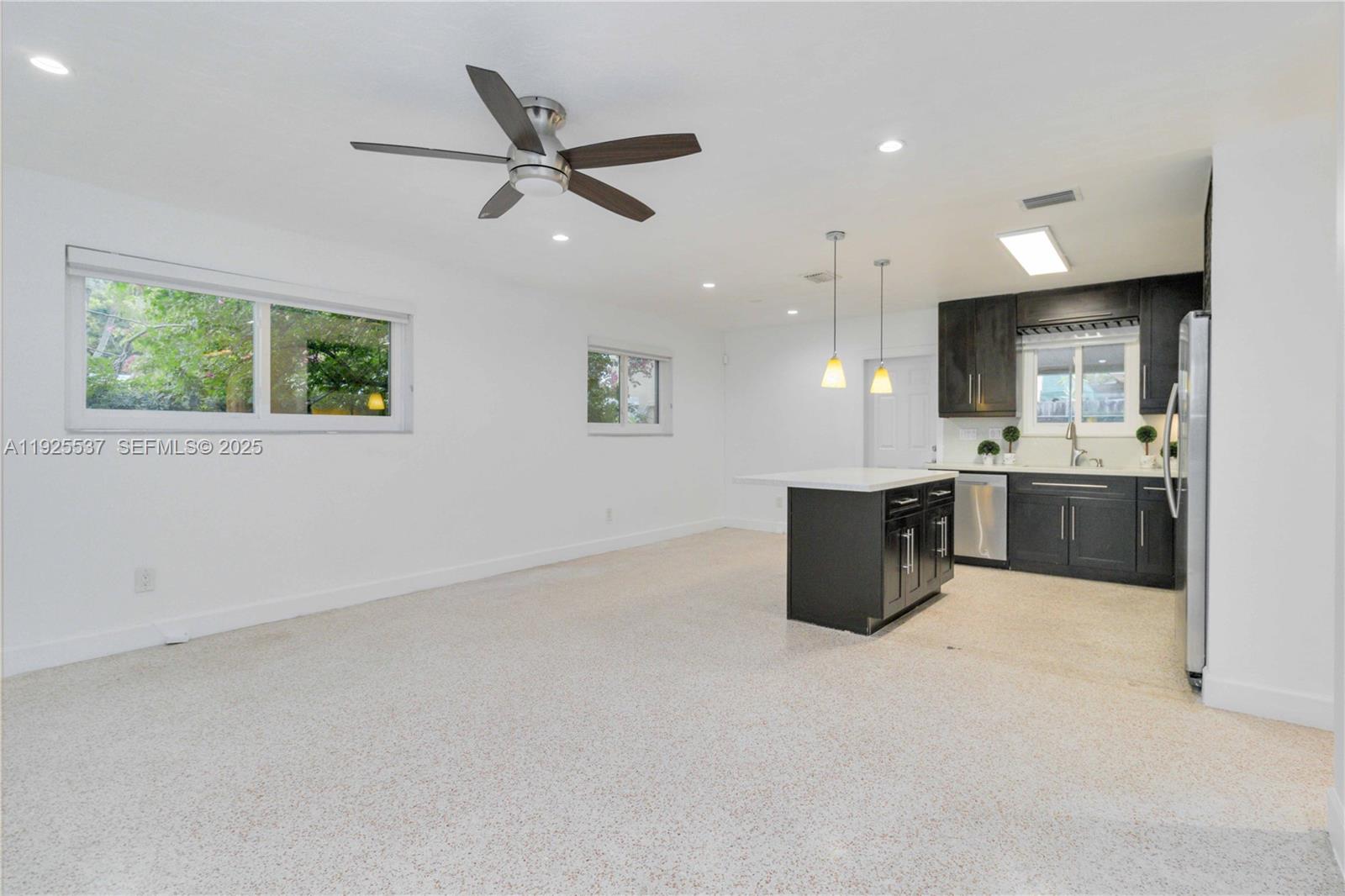 Welcome to this charming and beautifully updated home, offering comfort, style, and an open, inviting layout. The spacious floor plan flows seamlessly, making it perfect for both everyday living and entertaining. Enjoy a newly renovated kitchen featuring a large island, quartz countertops, elegant wood cabinets with plenty of storage, and stainless-steel appliances. The remodeled bathroom offers a generous walk-in shower, while the spacious bedrooms offer a peaceful retreat, white interior creates a bright and welcoming atmosphere throughout. Step outside to your private garden oasis, complete with lush palm trees—ideal for relaxing, lounging, or hosting barbecues. Additional features include impact-resistant windows for added safety, a large indoor laundry room, and ample parking with a gated two-car driveway plus room for two more vehicles in front. Perfectly located near shopping, dining, and major conveniences, this home delivers the ideal blend of comfort, functionality, and South Florida living. Move-in ready and waiting for you! Rent includes water and electricity.