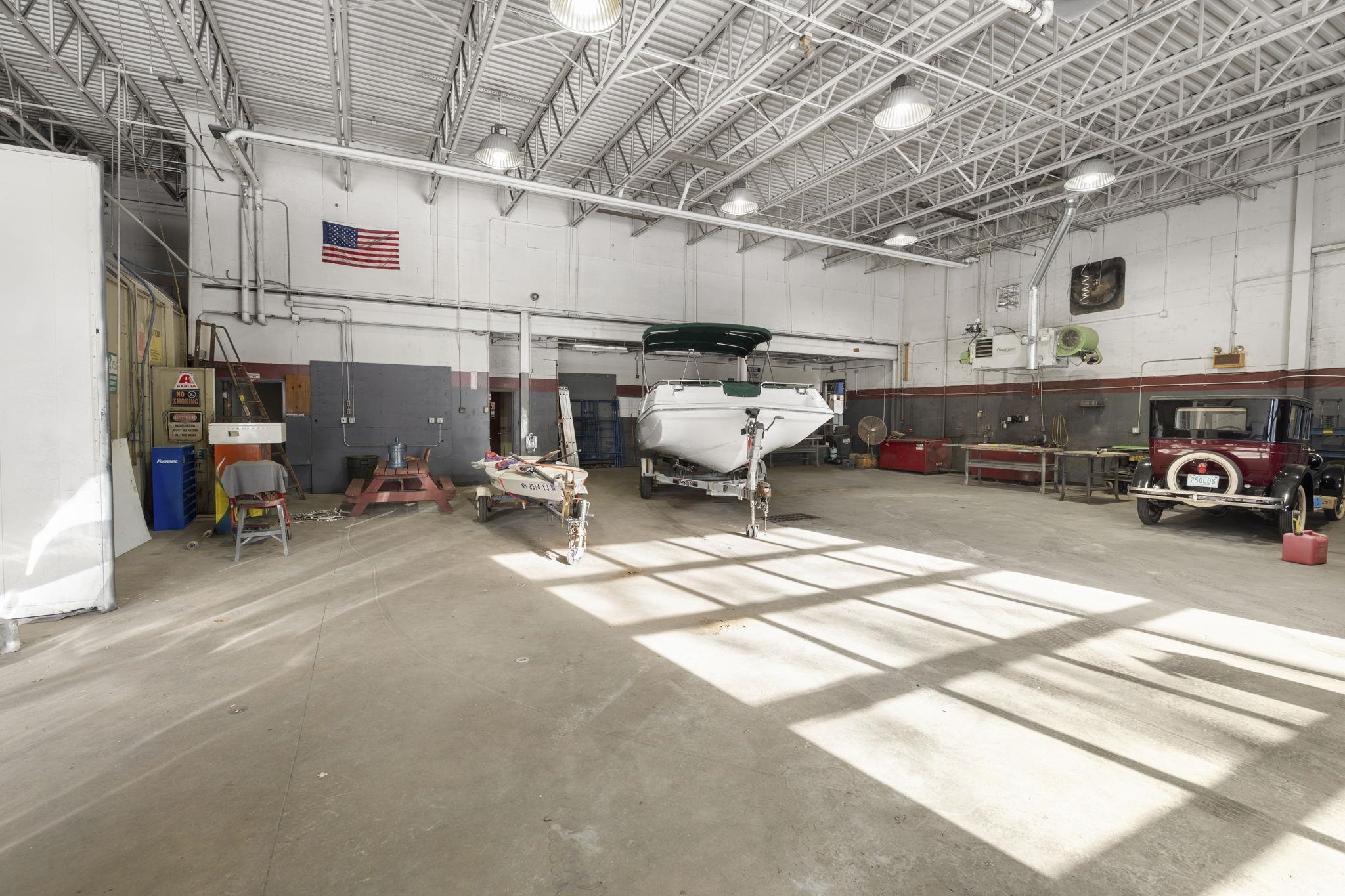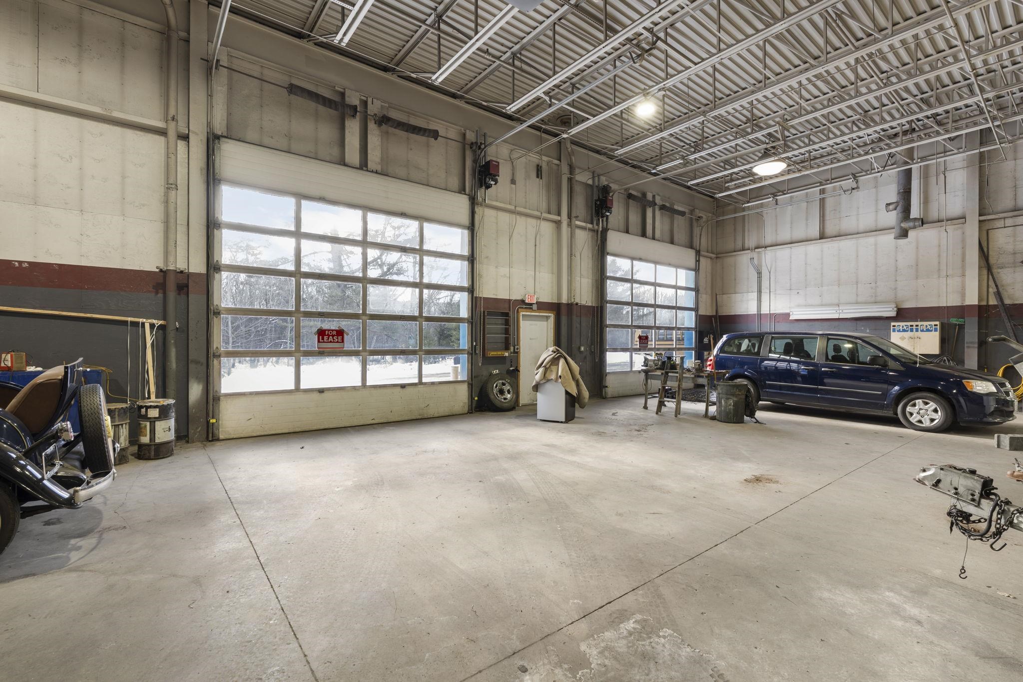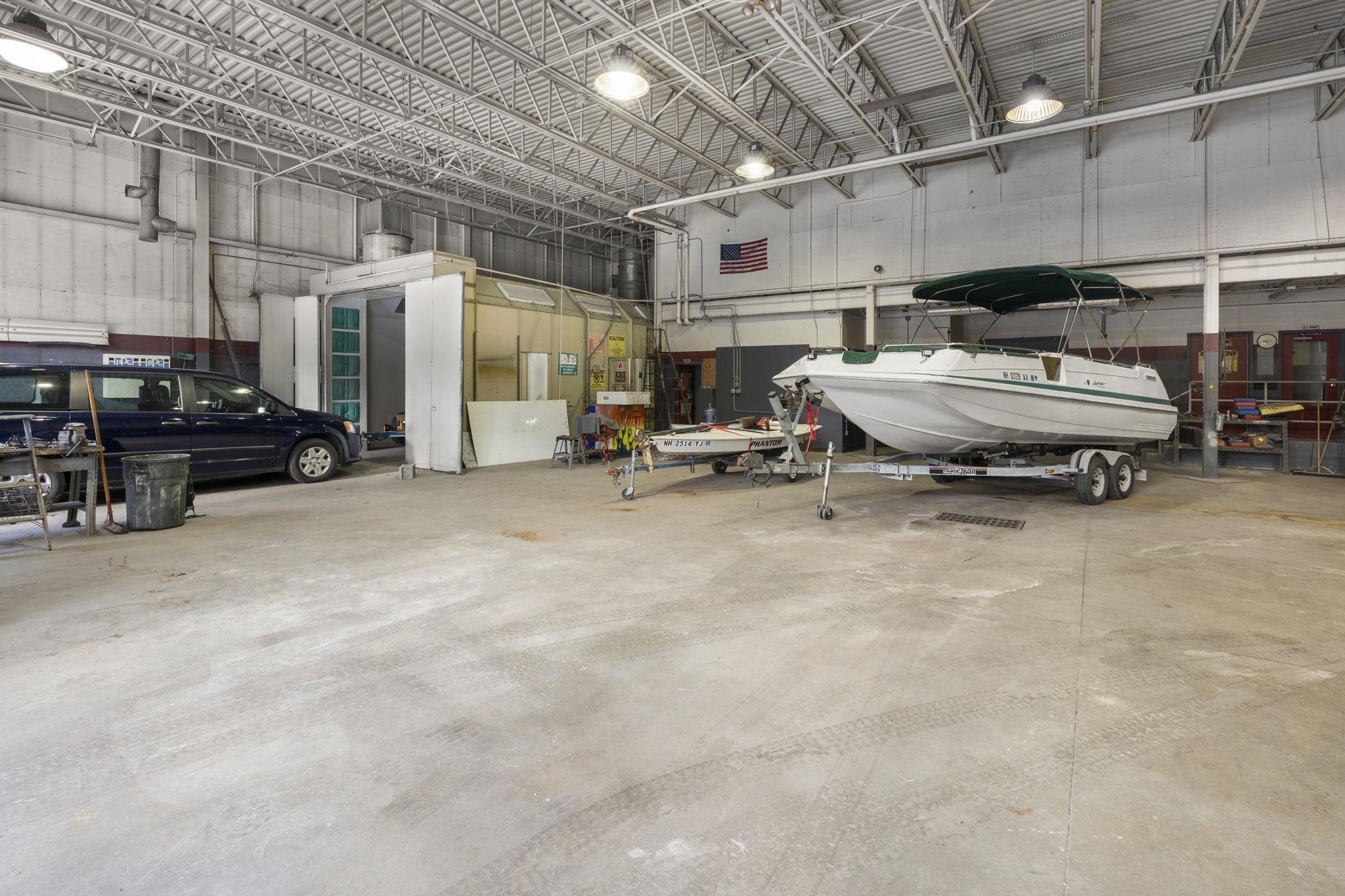 Suite F: Large Commercial Manufacturing, Truck or Body Shop with 14' o/h Doors: 4, 400± SF commercial unit available on busy West Main Street (NH Route 149) in Hillsborough, NH, with over 10, 000 cars passing daily. This exceptionally deep and wide unit is ideal for accommodating large vehicles including buses, tractors, and trailers. Features include paved parking, an adjacent loading dock, office space with HVAC, restroom, paint/parts storage, and a Devilbiss paint booth (or clean room). The unit is fully equipped with three-phase power, compressed air, and both waste oil and FHW heating. Covered outdoor storage and additional storage or merchandising space are also available. Located across from a new 84-unit apartment complex, the property offers excellent visibility, steady traffic, and access to a strong workforce. Unit F can also be paired with adjacent Unit H (4, 000± SF), which offers high ceilings, LED lighting, HVAC, and a loading dock, creating a combined opportunity of over 8, 400 SF with versatile layouts and expanded capacity. Lease rate includes all utilities.