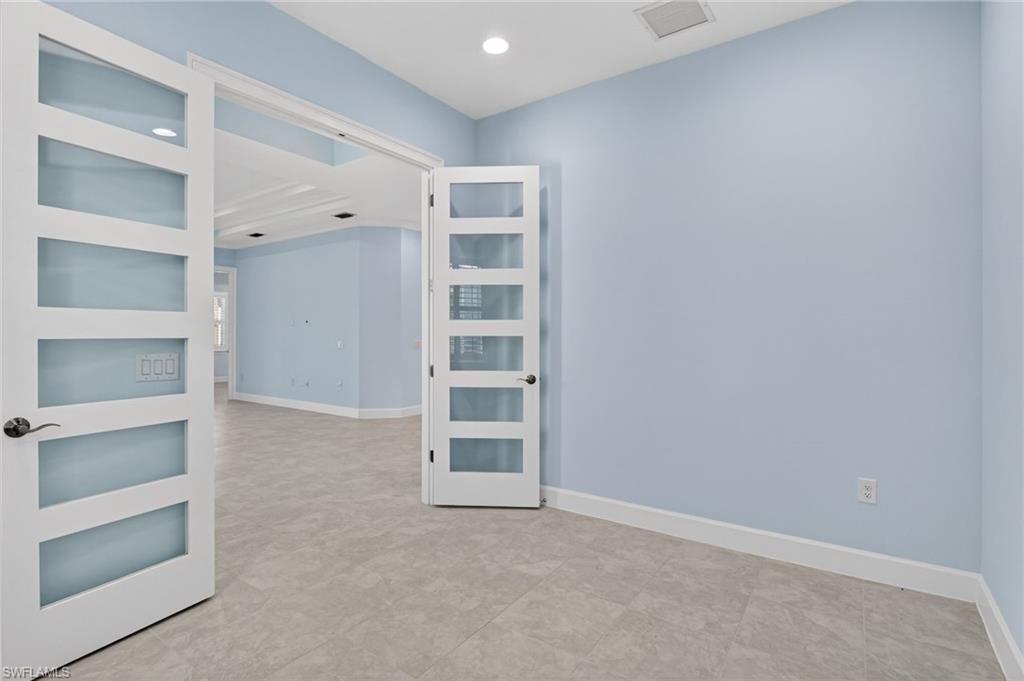 The split-bedroom floor plan ensures privacy. The spacious primary suite offers tranquil lake views, a bath with dual vanities, a step-in glass shower, and a generous walk-in closet. The second bedroom provides ample storage, while the versatile den, framed by modern French doors, adapts effortlessly to your lifestyle needs.
