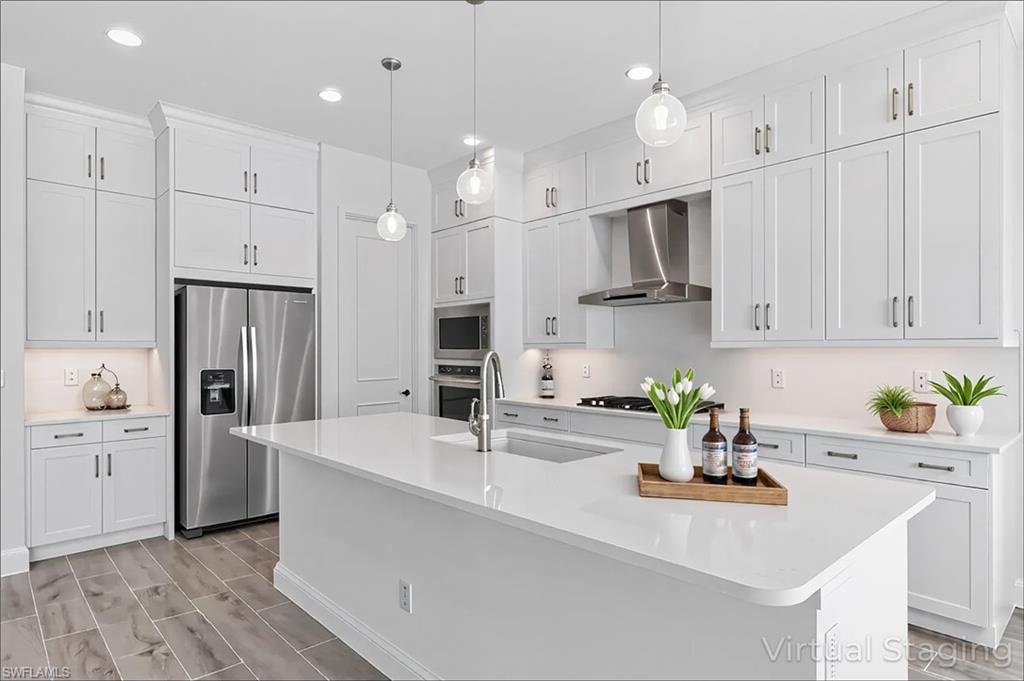 The gourmet kitchen is a chef’s dream, featuring a large statement island, natural gas cooking, a 5-burner gas range, KitchenAid stainless steel appliances, Arctic white cabinetry, and elegant quartz countertops—perfect for both entertaining and everyday living. Tile flooring throughout enhances the home’s modern, refined aesthetic.