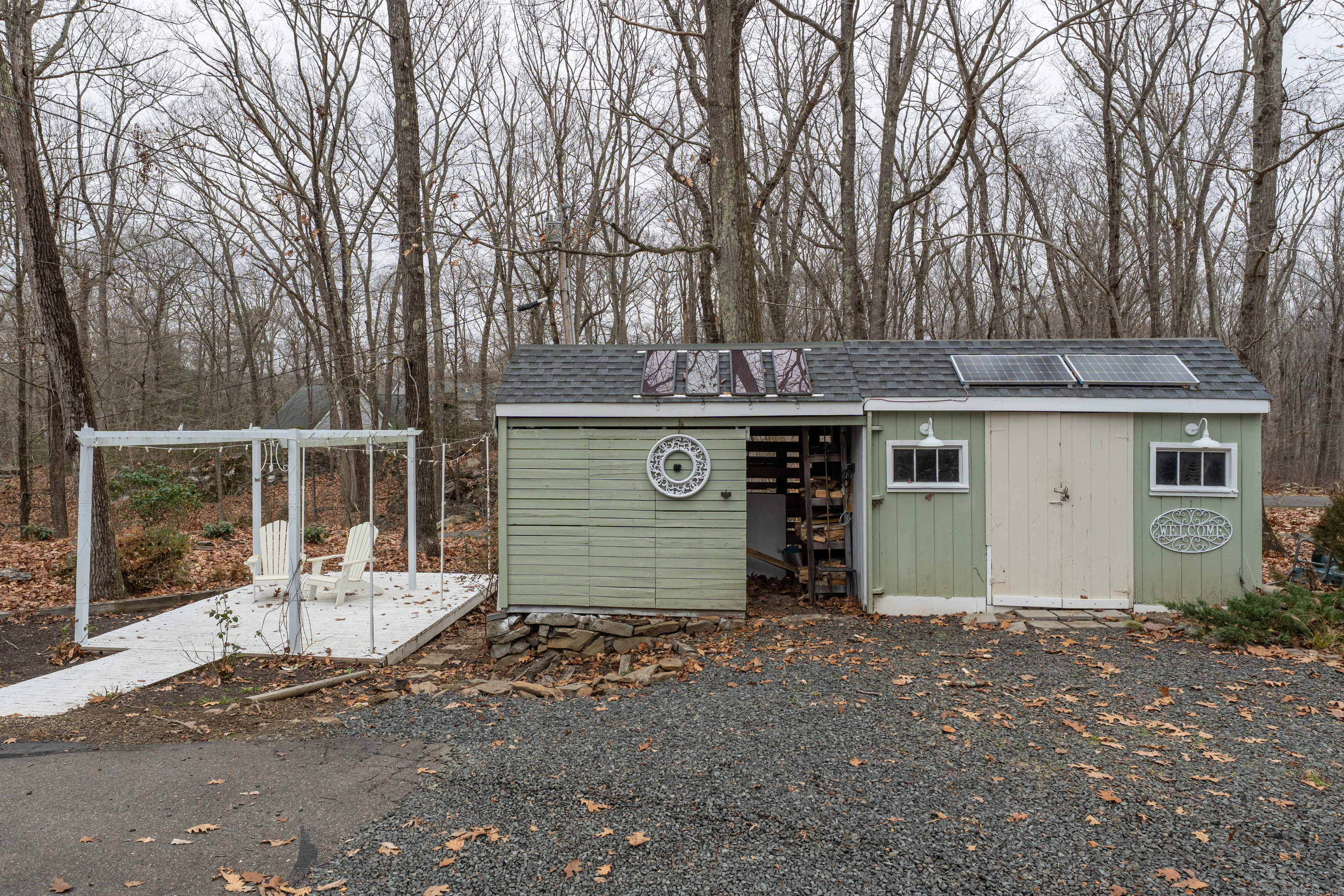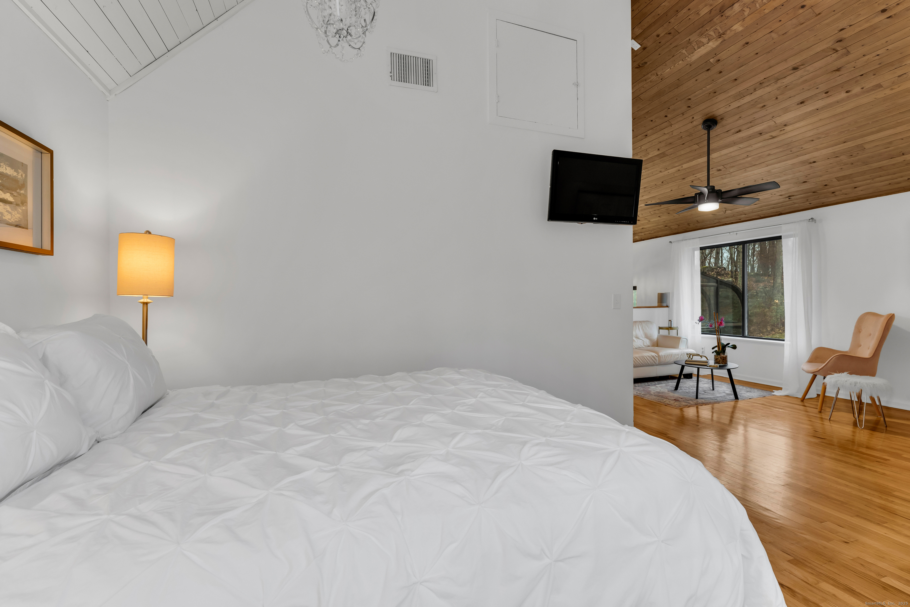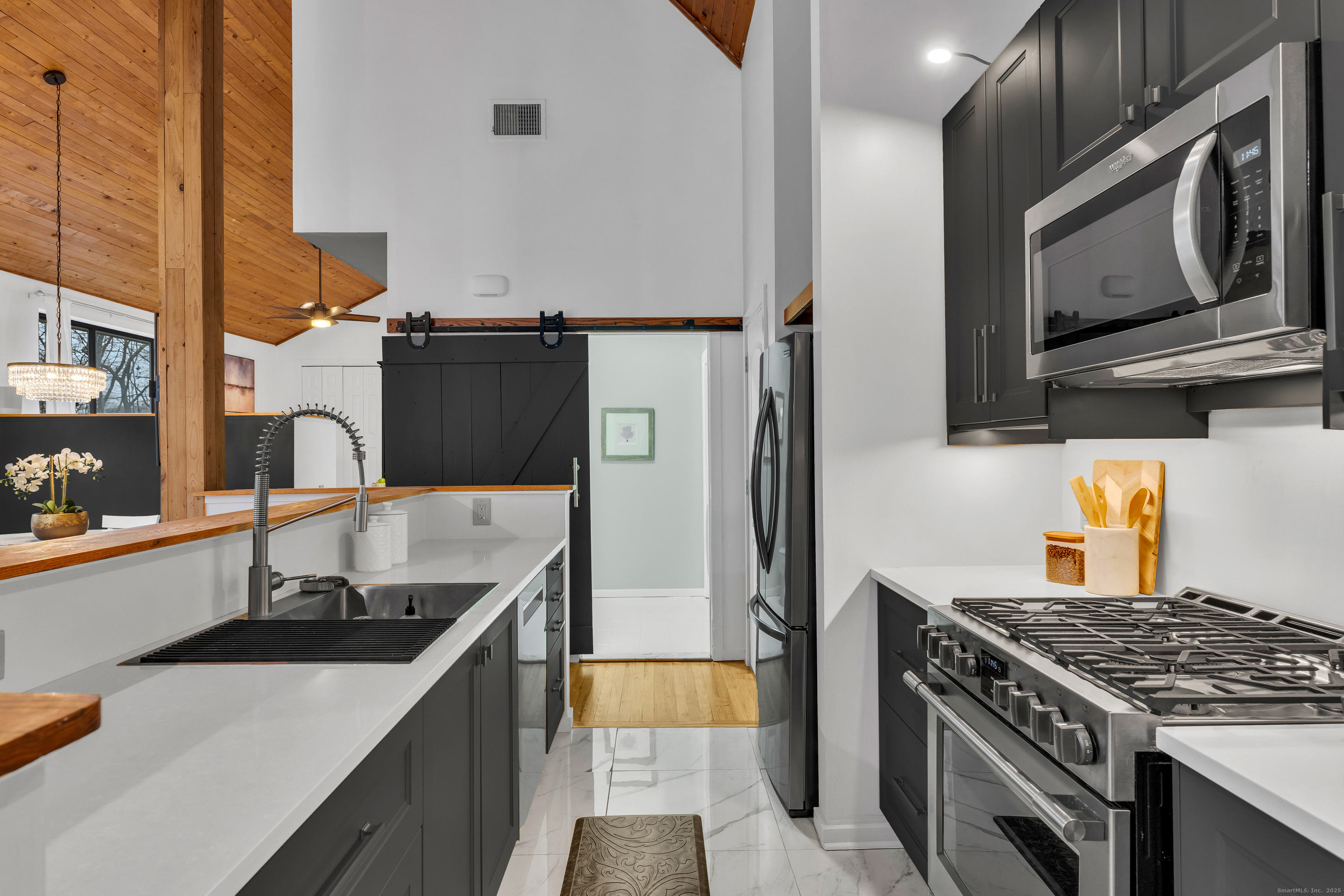 One-of-a-kind contemporary in Guilford! This beautifully updated multi-level home offers an open floor plan filled with natural light and thoughtful design. Freshly painted inside and out, the property also features a newer roof with gutter guards for years of low-maintenance living. The renovated kitchen shines with new cabinetry, quartz countertops, a work style inspired sink and smart appliances, including the dishwasher, washer and dryer. The updated baths bring a modern, clean aesthetic. A charming solarium with newer windows provides the perfect year-round spot to relax and take in the surrounding beauty. Tucked back on a private shared driveway, this home is bordered on 2 sides by 25 acres of Guilford Land Trust property, offering unmatched privacy, woodland views, and access to scenic trails, picnic areas, and even a pathway that leads all the way to the Dudley Farm Farmers' Market. Outdoor living is impressive with a wrap-around Trex deck and patio and a new hot tub, ideal for entertaining or unwinding under the stars. Major home system upgrades include efficient 2-zone hydro-air system with updated components and a brand new Rheem Central Air Conditioning Unit, ensuring comfort and efficiency throughout the seasons. This is a rare opportunity to own a contemporary retreat in a highly desirable neighborhood that has been updated, is move-in ready and is truly one of a kind.