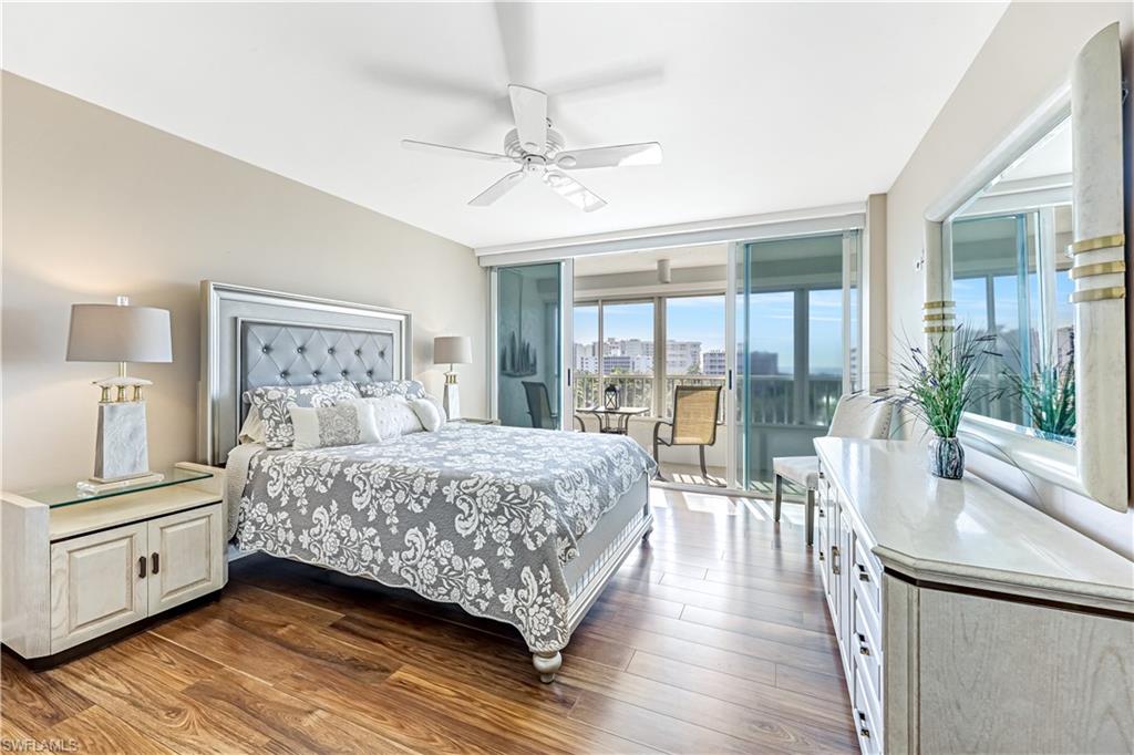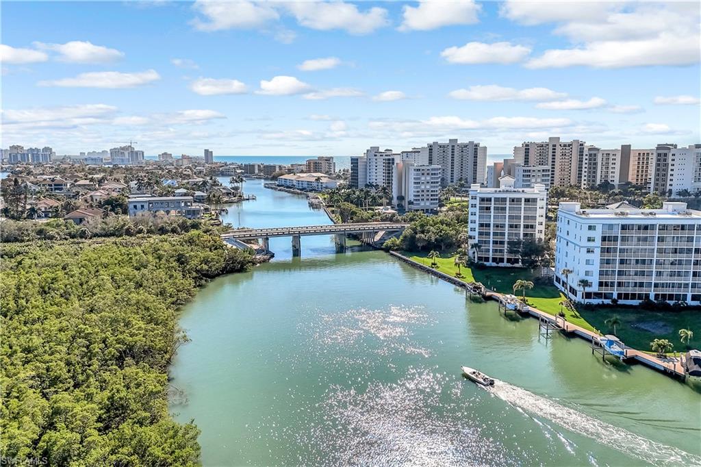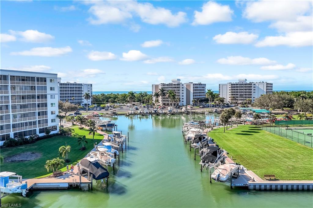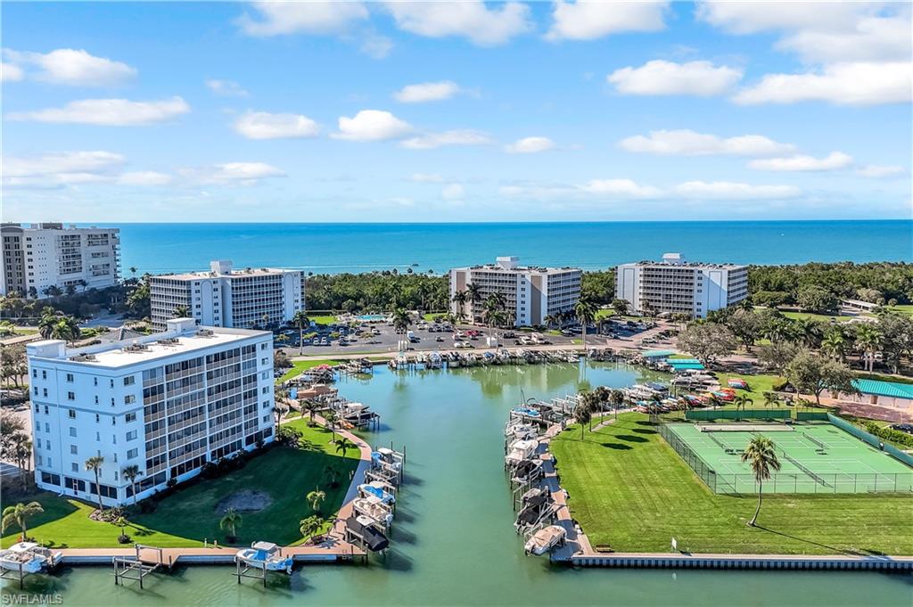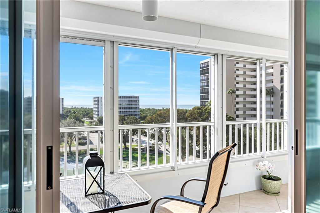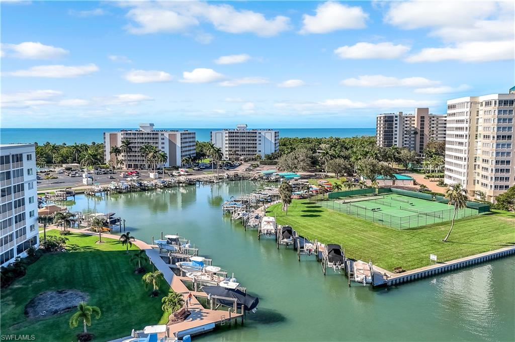 Priced to sell! Light and bright sky home with incredible partial Gulf view! Walk or bike to the best beach park on the Gulf at Delnor-Wiggins State Park and enjoy even more miles of safe biking and walking trails from this great location. This recently refreshed home features brand new kitchen appliances and the lightest creamy paint color that literally reflects all the great natural light in the home. The palette includes beautiful wood flooring in the bedrooms and designer inspired tile flooring in the living areas. Your generous- sized screened lanai adds great outdoor living space to enjoy the weather and the view. The walls of glass bring the outdoors in and you will feel the reasons you came to Naples! Storm shutters PLUS impact glass! You will be entertained watching or playing tennis and bocce conveniently on site. Just steps to the resort pool or stroll by the gorgeous bay waters. This home is convenient not only to the beach but to the top tier Artis Naples performing arts theatre, the Naples Museum and world class shopping and dining that Naples is known for. Nearby boat slips may be available for rent or sale. On-site property management is a convenient resource for this well managed property. Very well-maintained building with a lovely, newly re-imagined entry lobby. Relax, and enjoy this comfortable home and the great lifestyle of Southwest Florida!