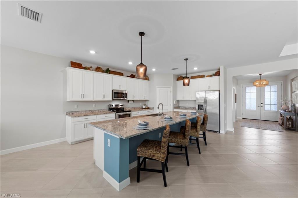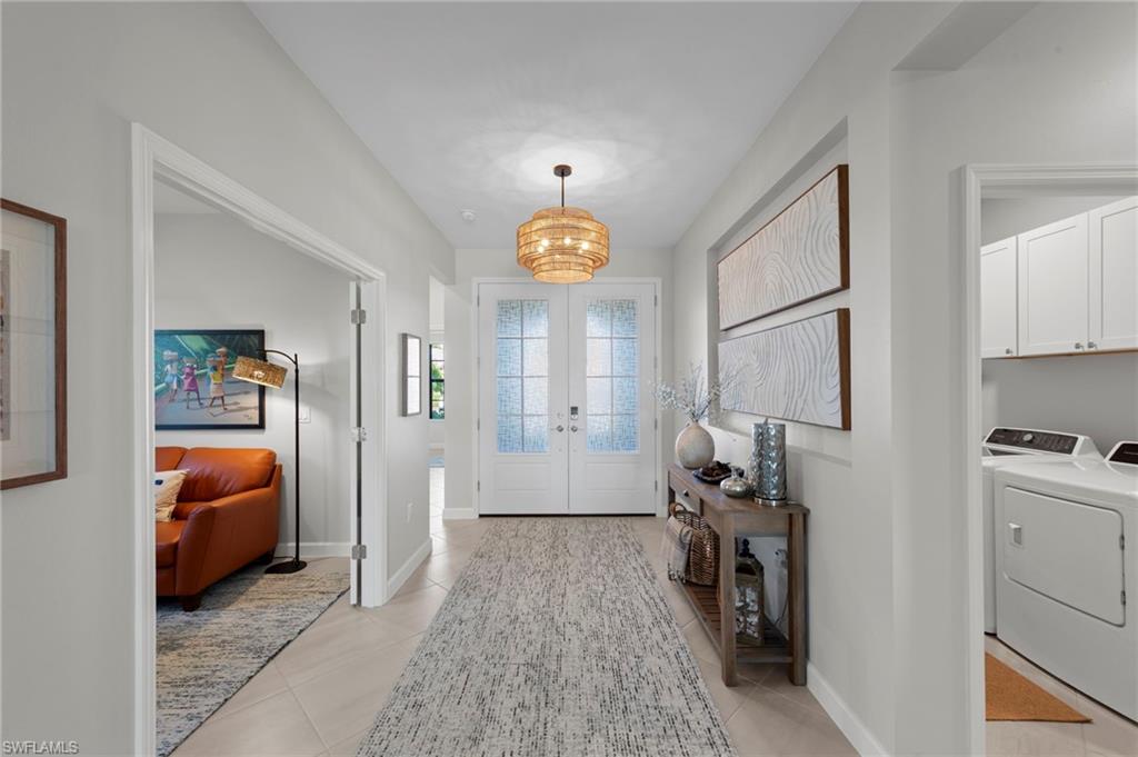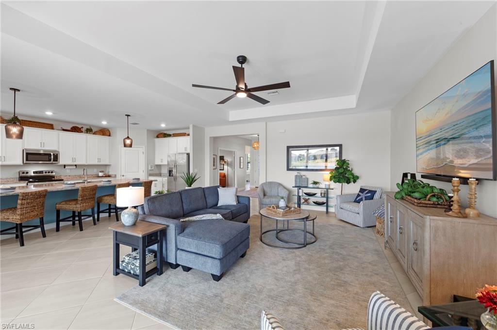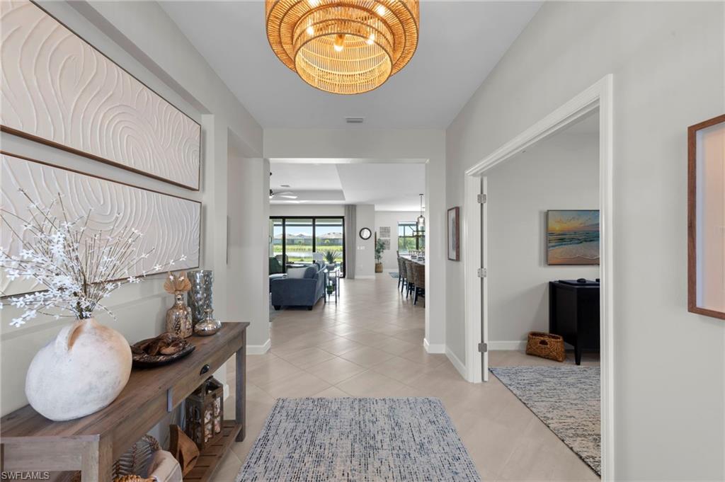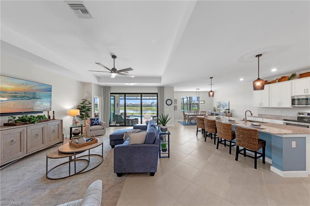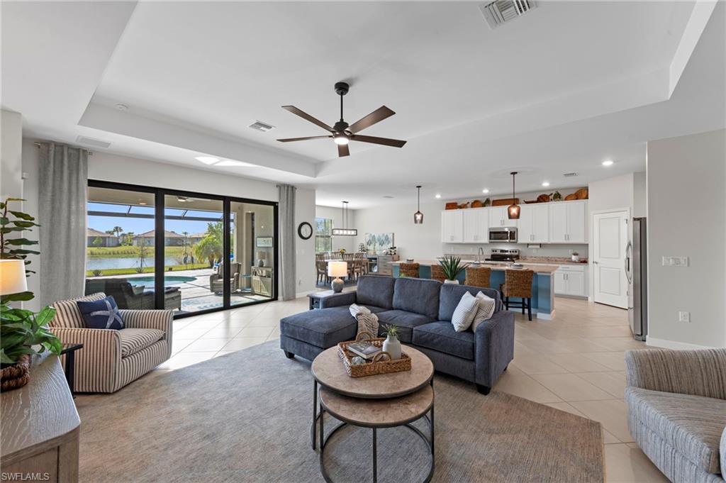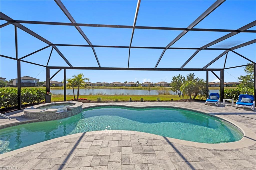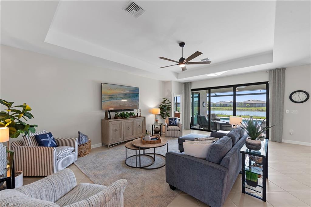 Welcome to this highly sought-after Summerville II floor plan, offering the perfect blend of open-concept living, privacy, and resort-style outdoor space. This beautifully designed 3 Bedroom + Den, 3 Bathroom home features a spacious 3-car garage, bright natural light throughout, and peaceful southern exposure overlooking a serene lake. Inside, enjoy an expansive great room, a large kitchen with an oversized island, and a dedicated dining area ideal for gatherings. The private primary suite offers two walk-in closets and a spa-inspired bathroom. Two separate guest suites each include a full bath, providing exceptional comfort and privacy for visiting family or guests. The versatile den works perfectly as an office, media room, or additional sleeping space. This home includes numerous upgrades and enhancements throughout: new interior paint, new lighting fixtures, upgraded ceiling fans, air purification system, added utility room cabinetry, and Storm Smart Hurricane Shutters, featuring motorized shutters for the lanai and a roll-down shutter for the front door. Additional electrical outlets were added to the lanai and outdoor areas, offering increased functionality for grilling, lighting, or entertainment. The seller also invested in professional landscaping for improved curb appeal. Step outside to your personal Southwest Florida oasis. The extended covered lanai, screened pool cage, heated pool & spa, and south-facing lake views create a setting ideal for year-round enjoyment. The pool deck features a concrete sub-deck beneath the pavers, providing long-term stability and durability. Whether hosting guests or enjoying quiet evenings by the water, this outdoor living area is designed to impress. Located in the highly desirable community of Timber Creek, this home offers unmatched convenience. Residents enjoy close proximity to RSW International Airport, JetBlue Park, home of the Boston Red Sox Spring Training, and CenturyLink Sports Complex, where the Minnesota Twins hold spring training. Shopping, dining, and everyday conveniences are all nearby, making this one of the most accessible locations in the region. This Summerville II captures the very best of Florida living—bright, open, elegant, and resort-like—enhanced by thoughtful upgrades and an ideal southwest Florida setting