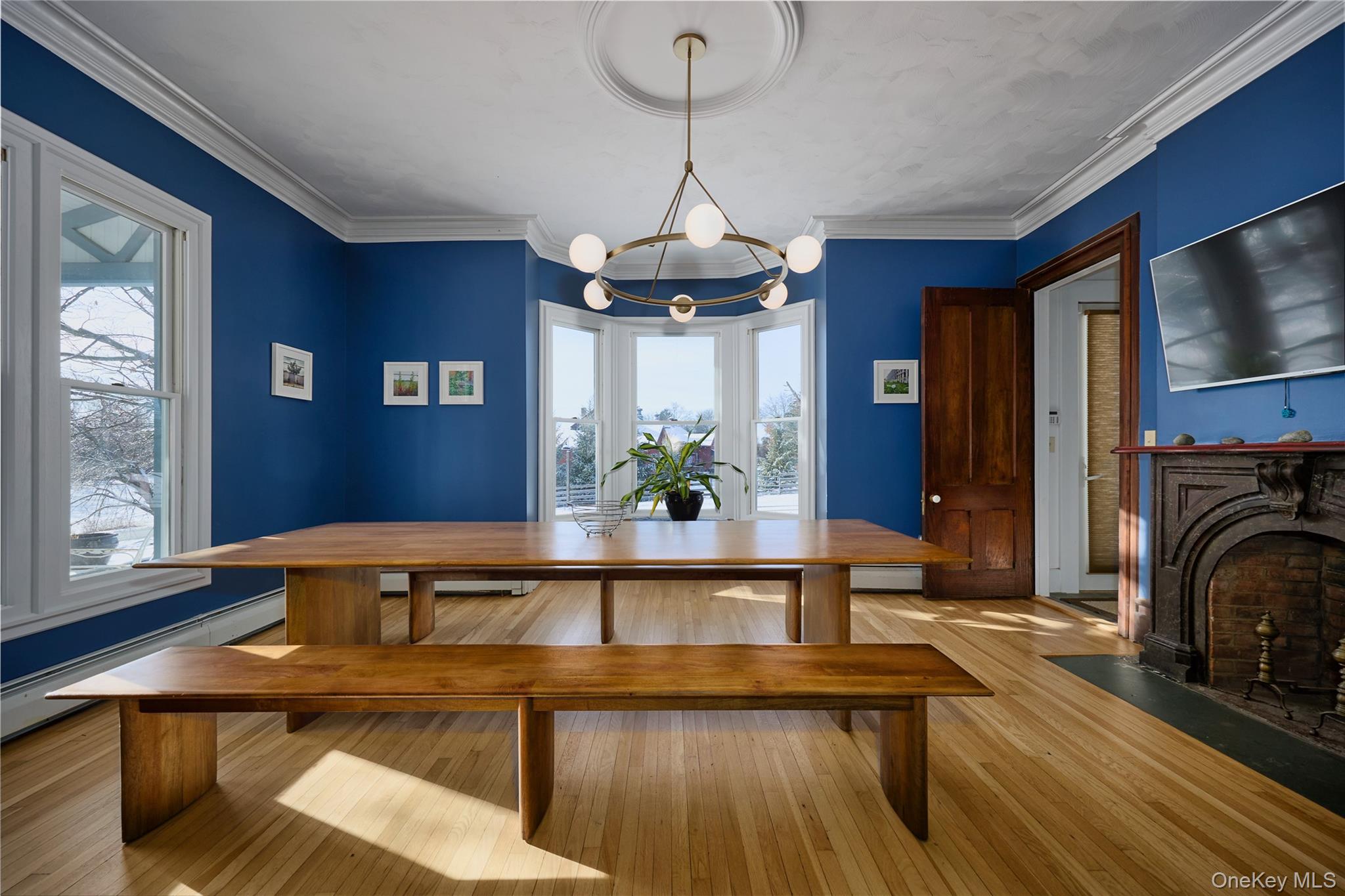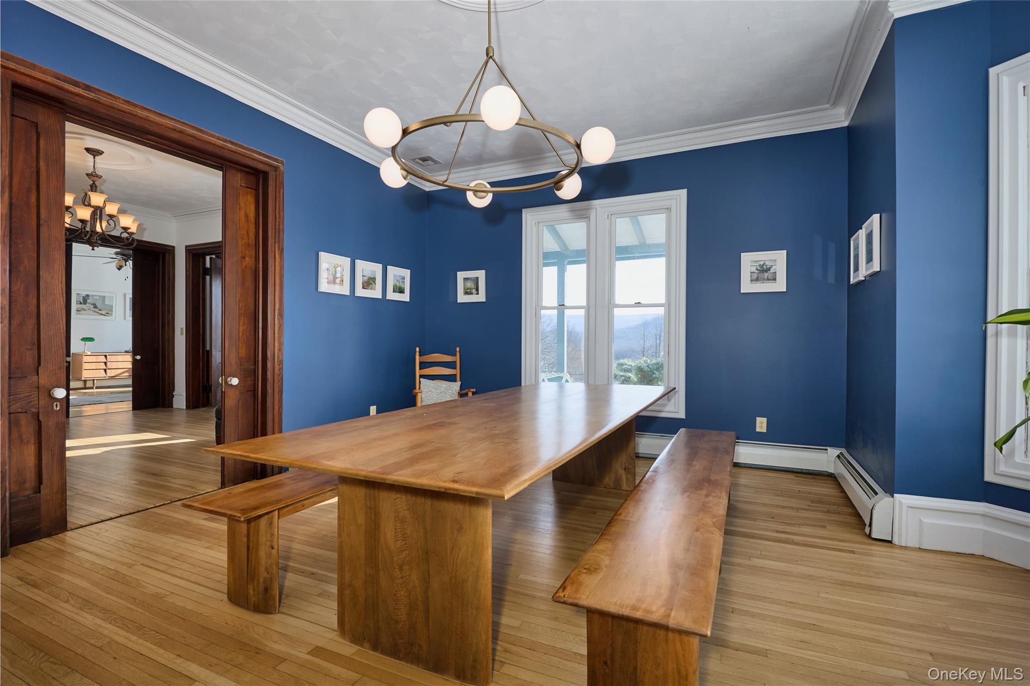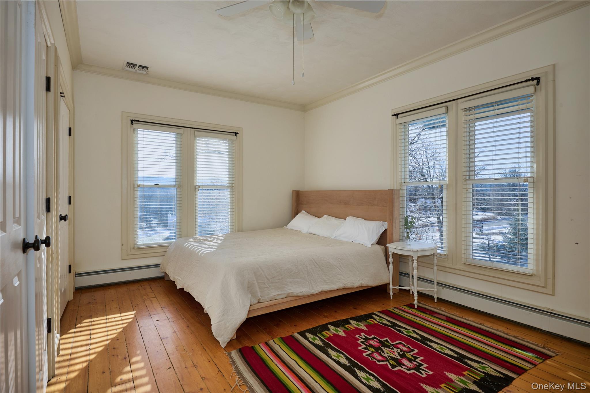 Set atop a gentle hill with sweeping eastern views of Round Hill and Schunnemunk Ridge, this pristine 1860 farmhouse blends preserved historic character with thoughtful modern updates. Originally part of the Sears family dairy pasture, the 3, 866 sq ft home has been meticulously maintained and features original wide-plank hardwood floors, a striking hand-carved banister, five fireplaces with original wooden and stone mantles, 10' ceilings, and large sun-filled windows throughout. The main level offers two gracious living rooms, a formal dining room, a dedicated office, and an updated kitchen outfitted with a Wolf range, cherry cabinetry, generous storage, and a walk-in pantry. A dedicated first-floor laundry room adds convenience. Upstairs are four spacious bedrooms and two full bathrooms, including a generous primary suite with a large walk-in closet and a 5-piece ensuite bath. These spaces reflect the thoughtful renovation completed in 2014 by previous owners, which also included a living room extension, upgraded kitchen, and a 1, 250 sq ft three-car garage designed to complement the home’s historic profile. The lower level is just as impressive. The dry, clean basement contains a unique wine-tasting room set against the original hand-stacked stone foundation, offering a charming and unexpected entertaining space. The 5-acre property offers level, usable land framed by mature native trees—including two historic Linden trees dating to the late 1800s—and expansive lawn. In 2022, the owners installed an 8, 000 sq ft organic vegetable garden complete with deer fencing and a full irrigation system, creating a highly productive and beautiful outdoor space. Additional improvements include new trees and screening, newly added parking, a ground-floor repaint, refinished wood floors, an EV charger (CCS), and the conversion of the former stable into a functional workshop. Three outbuildings expand the estate’s potential for creative, professional, or commercial work. The 3, 036 sq ft workshop is fully equipped with 6" concrete floors for heavy machinery, 220V power, propane heat, ventilation systems, a bathroom with independent septic, and a four-bay garage. The 1, 300 sq ft former stable has been transformed into another heated workspace with 220V power, a kitchenette, a sink, and large sliding barn doors for easy access. The charming 144 sq ft red barn, believed to predate the house and possibly dating back to the 1700s, features traditional mortise-and-tenon joinery and hand-tooled beams. Today it serves as a functional landscape shed while retaining its historic character. History runs deep on the property. The grounds include the historic Sears Cemetery, an 11-memorial family graveyard with stones predating the home's construction. Among those buried here is Hector Craig, a U. S. Congressman and father-in-law to William Havemeyer, part of a family central to the development of early Washingtonville. A rare opportunity to own a fully modernized historic estate, this property seamlessly merges historic integrity, architectural detail, and contemporary comfort across home, land, and workspaces. One Hour to NYC, Close to All Transportations, Dining, Hiking, Shopping and other Conveniences.