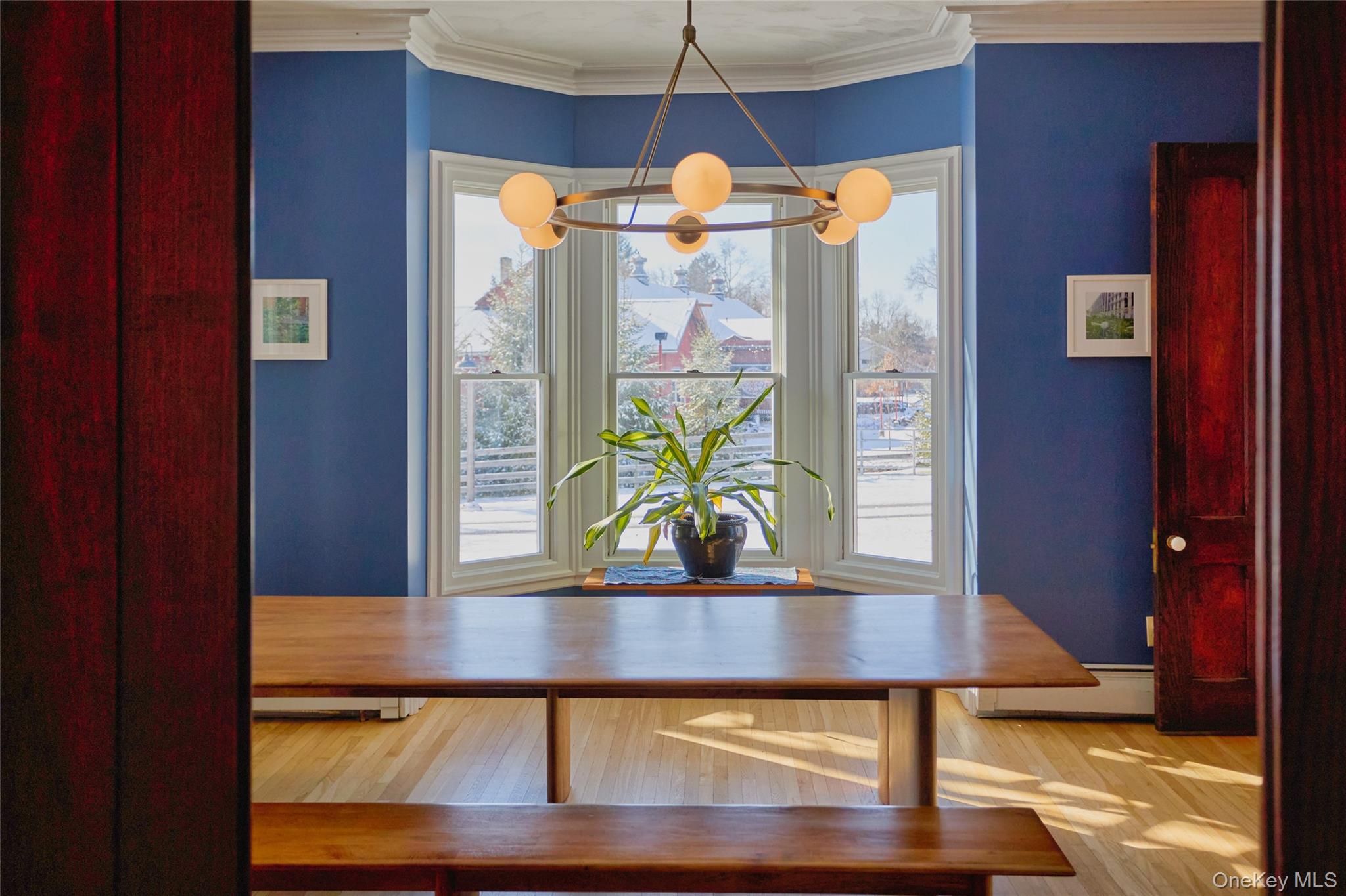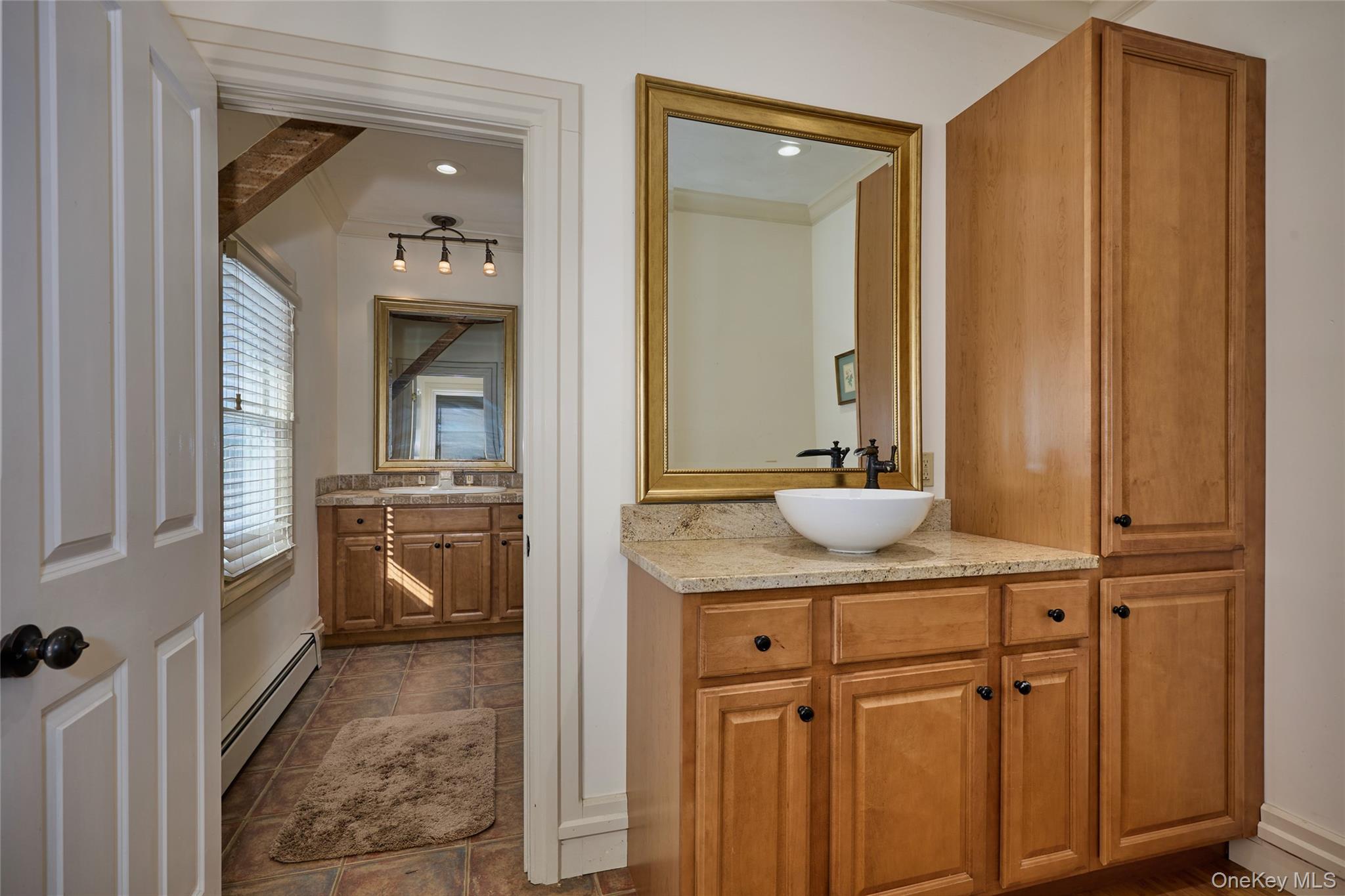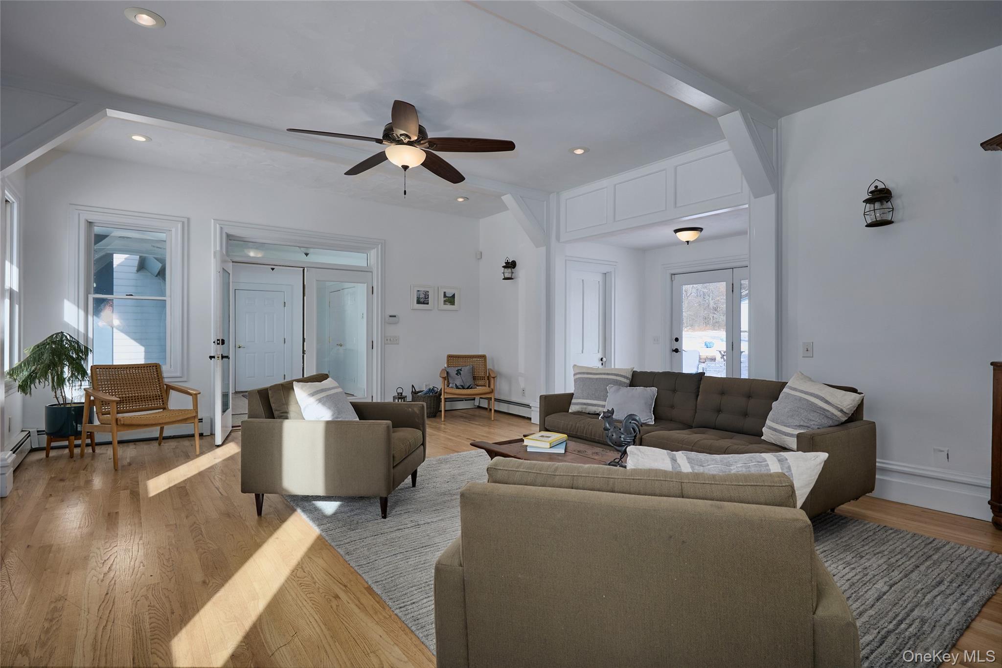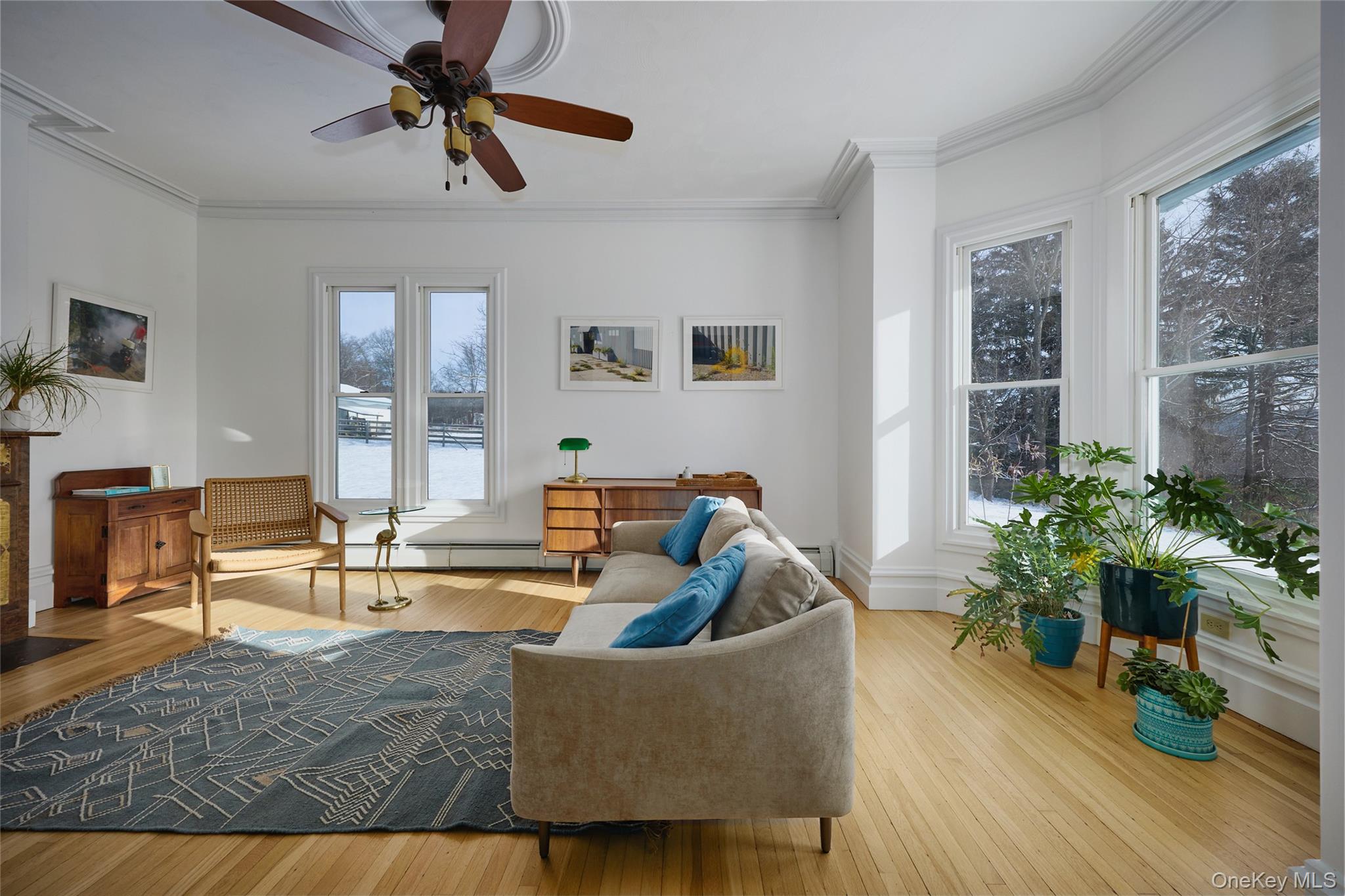 Set atop a gentle hill with sweeping eastern views of Round Hill and Schunnemunk Ridge, this pristine 1860 farmhouse blends preserved historic character with thoughtful modern updates. Originally part of the Sears family dairy pasture, the 3, 866 sq ft home has been meticulously maintained and features original wide-plank hardwood floors, a striking hand-carved banister, five fireplaces with original wooden and stone mantles, 10' ceilings, and large sun-filled windows throughout. The main level offers two gracious living rooms, a formal dining room, a dedicated office, and an updated kitchen outfitted with a Wolf range, cherry cabinetry, generous storage, and a walk-in pantry. A dedicated first-floor laundry room adds convenience. Upstairs are four spacious bedrooms and two full bathrooms, including a generous primary suite with a large walk-in closet and a 5-piece ensuite bath. These spaces reflect the thoughtful renovation completed in 2014 by previous owners, which also included a living room extension, upgraded kitchen, and a 1, 250 sq ft three-car garage designed to complement the home’s historic profile. The lower level is just as impressive. The dry, clean basement contains a unique wine-tasting room set against the original hand-stacked stone foundation, offering a charming and unexpected entertaining space. The 5-acre property offers level, usable land framed by mature native trees—including two historic Linden trees dating to the late 1800s—and expansive lawn. In 2022, the owners installed an 8, 000 sq ft organic vegetable garden complete with deer fencing and a full irrigation system, creating a highly productive and beautiful outdoor space. Additional improvements include new trees and screening, newly added parking, a ground-floor repaint, refinished wood floors, an EV charger (CCS), and the conversion of the former stable into a functional workshop. Three outbuildings expand the estate’s potential for creative, professional, or commercial work. The 3, 036 sq ft workshop is fully equipped with 6" concrete floors for heavy machinery, 220V power, propane heat, ventilation systems, a bathroom with independent septic, and a four-bay garage. The 1, 300 sq ft former stable has been transformed into another heated workspace with 220V power, a kitchenette, a sink, and large sliding barn doors for easy access. The charming 144 sq ft red barn, believed to predate the house and possibly dating back to the 1700s, features traditional mortise-and-tenon joinery and hand-tooled beams. Today it serves as a functional landscape shed while retaining its historic character. History runs deep on the property. The grounds include the historic Sears Cemetery, an 11-memorial family graveyard with stones predating the home's construction. Among those buried here is Hector Craig, a U. S. Congressman and father-in-law to William Havemeyer, part of a family central to the development of early Washingtonville. A rare opportunity to own a fully modernized historic estate, this property seamlessly merges historic integrity, architectural detail, and contemporary comfort across home, land, and workspaces. One Hour to NYC, Close to All Transportations, Dining, Hiking, Shopping and other Conveniences.