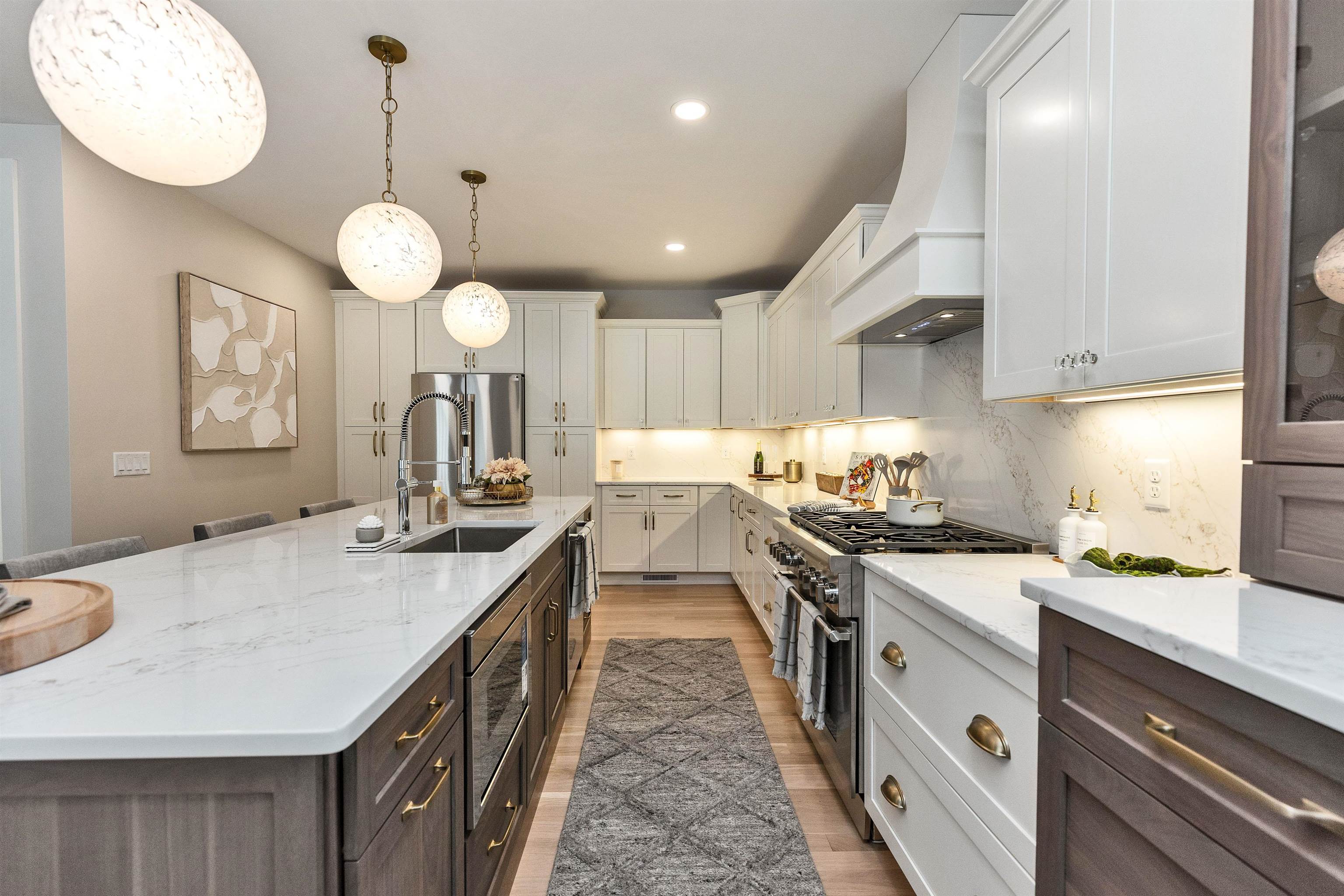 This exquisite home is the pinnacle of craftsmanship, design, and a warm modern luxury. Located in the sought-after Village at Mt. Miner, this home sits in a private and peaceful spot at the end of a cul-de-sac. Step inside to the light filled interior with soaring ceilings accented by white oak beams. The back wall is nearly all glass, with two eight-foot-tall double glass doors leading out to a large deck connecting to the natural beauty of the protected conservation land abutting the backyard. Thoughtfully designed for entertaining, the kitchen opens into the great room with a stunning floor to ceiling cultured stone gas fireplace and custom white oak mantel. The chef's kitchen has cabinetry galore, Thermador appliances, quartz countertops and backsplash, and a 10-foot walnut island. The large first-floor primary suite offers unobstructed views of the natural surround, and a walk-in closet and a tray ceiling adding a touch of elegance. Double sinks, a custom shower with a frameless glass surround, and soaking tub make the primary bath a relaxing spa-like retreat. There is a home office, mudroom, and laundry room all on the first floor. Discerning buyers will appreciate the attention to detail and modern organic aesthetic throughout. This prime location has easy access to nearby amenities, including about an hour's drive to Boston, ski mountains, and seacoast. There aren't many homes that take your breath away; this is one of them. Schedule a showing today.