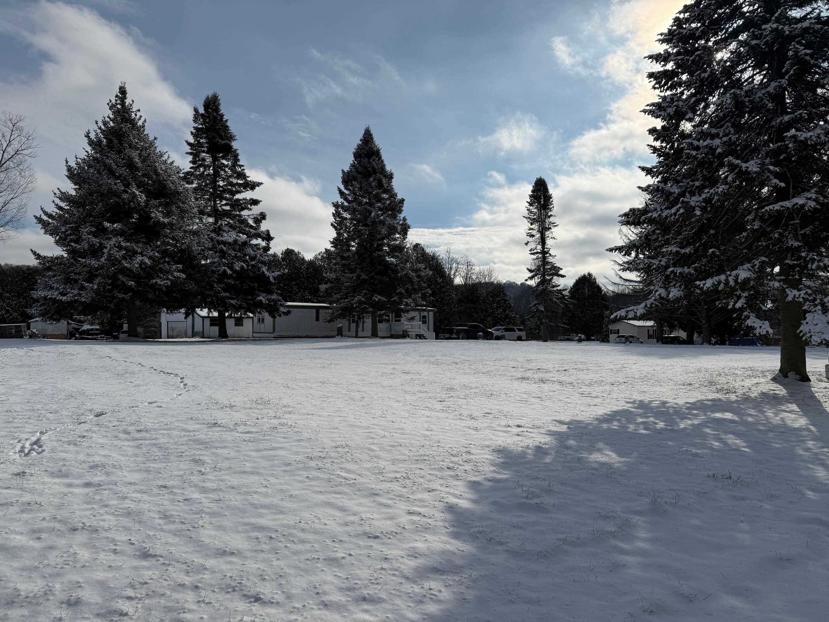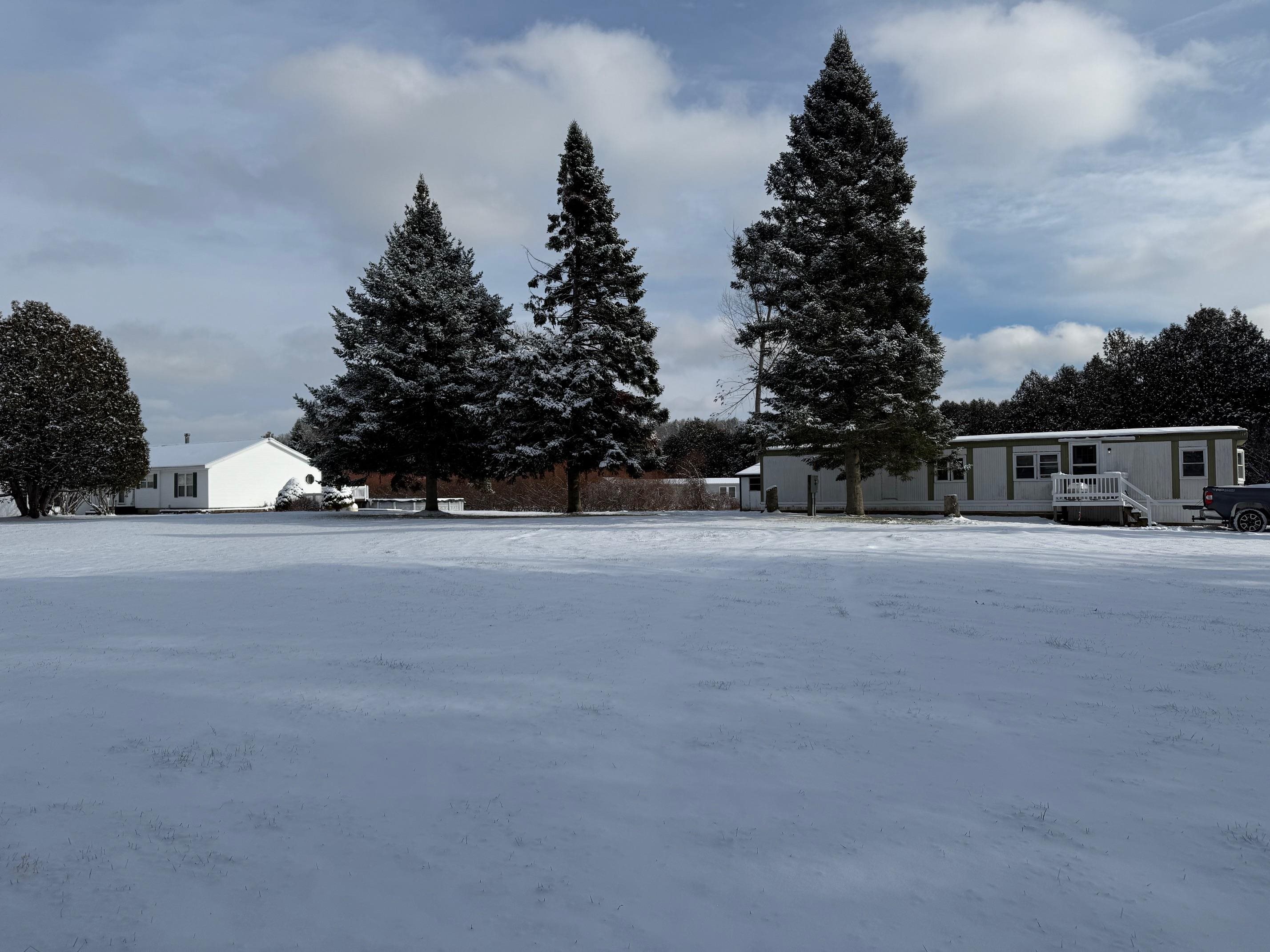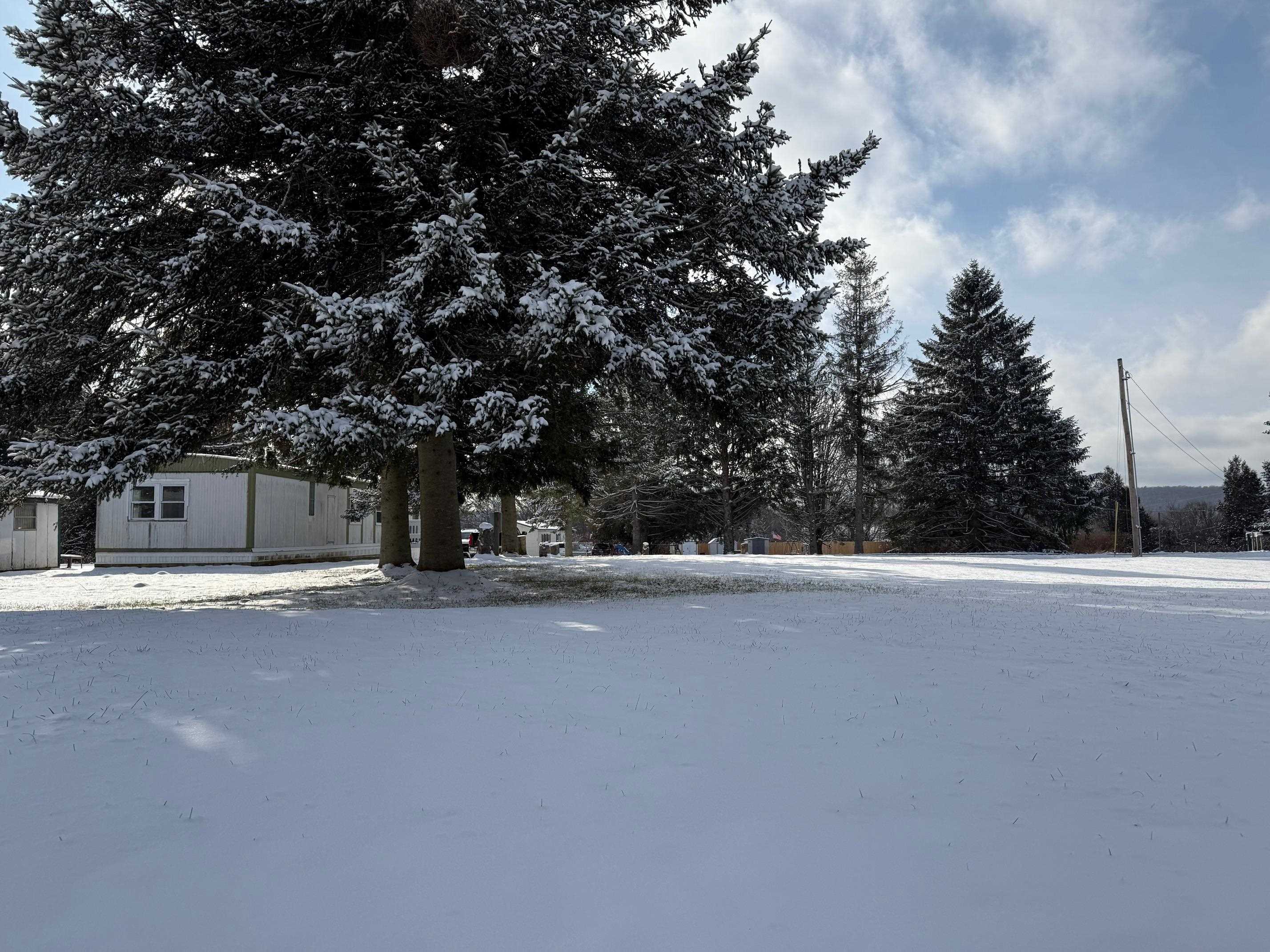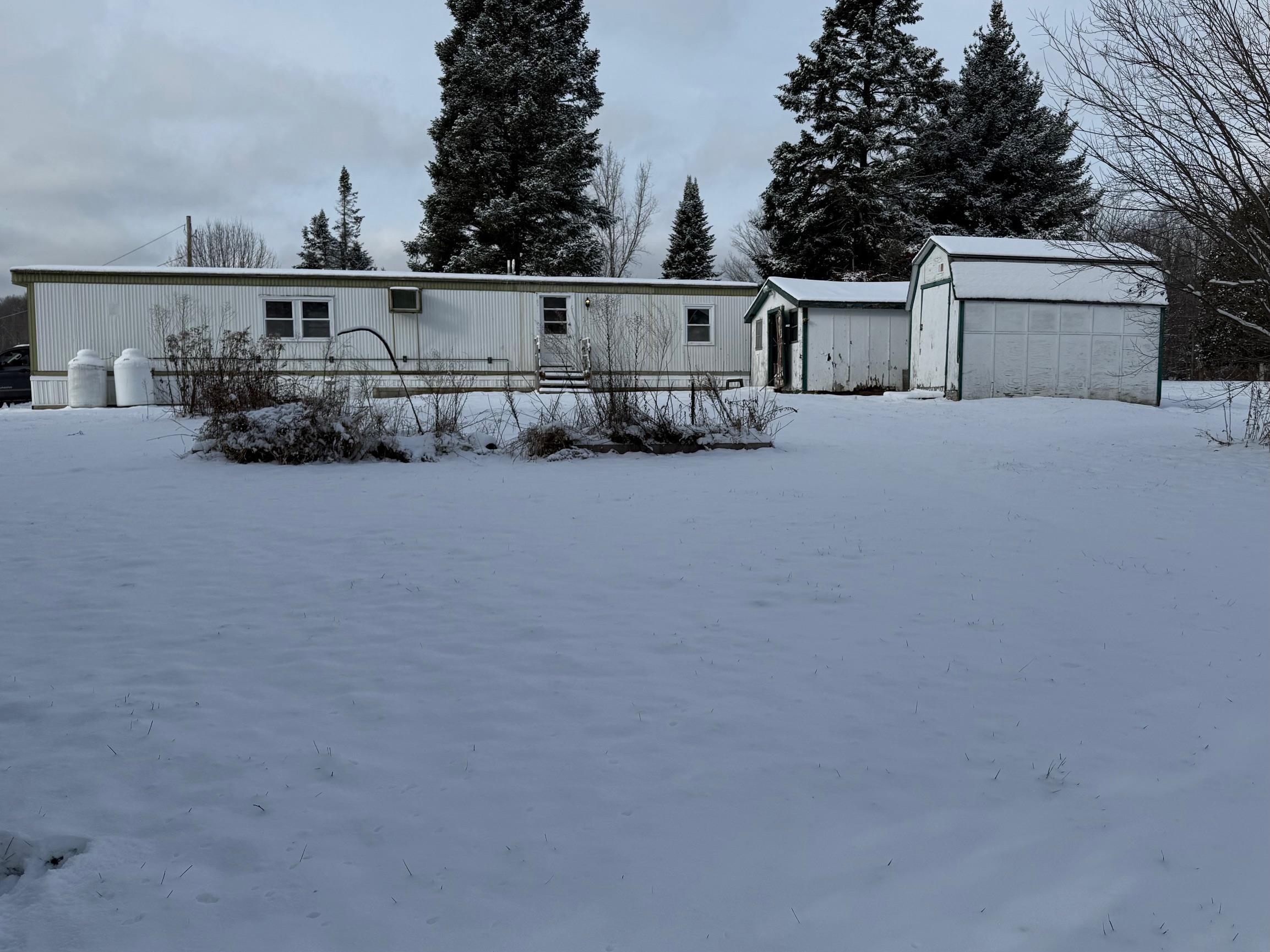 OWNED LAND! This level and mature corner lot is . 88 acres and fully improved with an onsite 1, 000 gallon septic and leach field, community water ($45/month), and a 1976 2-bedroom mobile home. The lot is so spacious and cleared to enjoy. There are two storage sheds onsite and parking for 2+vehicles. The exterior is metal with a metal roof, double plane windows. The home sits on a slab, has tie downs, insulation, new skirting installed 2023, and heat tape. The home has newer carpeting, plywood subfloor in living room and hallway, and vinyl plank in the dining room. Appliances included: washer, refrigerator, gas range. The kitchen does have a spot to hook up a dishwasher. High efficiency furnace is approximately 3. 5 years old. Use as is, or plan to build in the future!