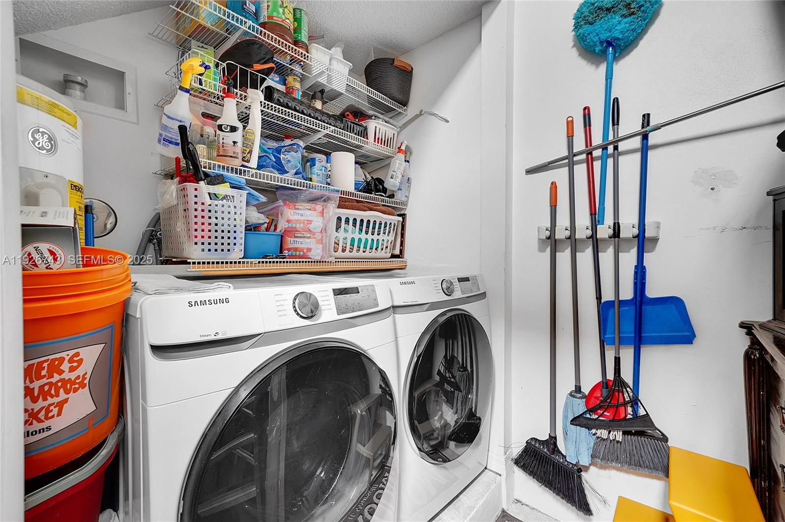 The 2-car garage is a professional home gym (video available) with AC, elevated storage (200+ sf/700 cu ft), and laundry area. Main bedroom retreat boasts his-and-hers closets, glass shower, and tub. Outdoors, a wired gazebo with Bluetooth speakers, fans, and lighting makes entertaining a breeze. Accordion shutters add security and style.