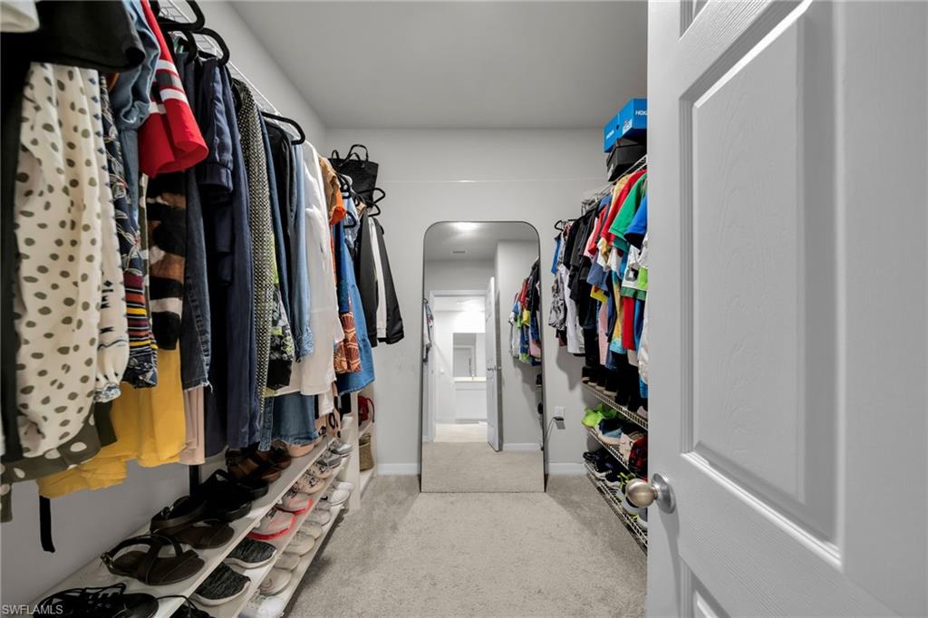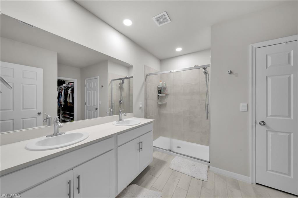 The spacious master suite provides a true retreat with two walk-in closets and a luxurious bathroom featuring a freestanding shower and dual sinks.