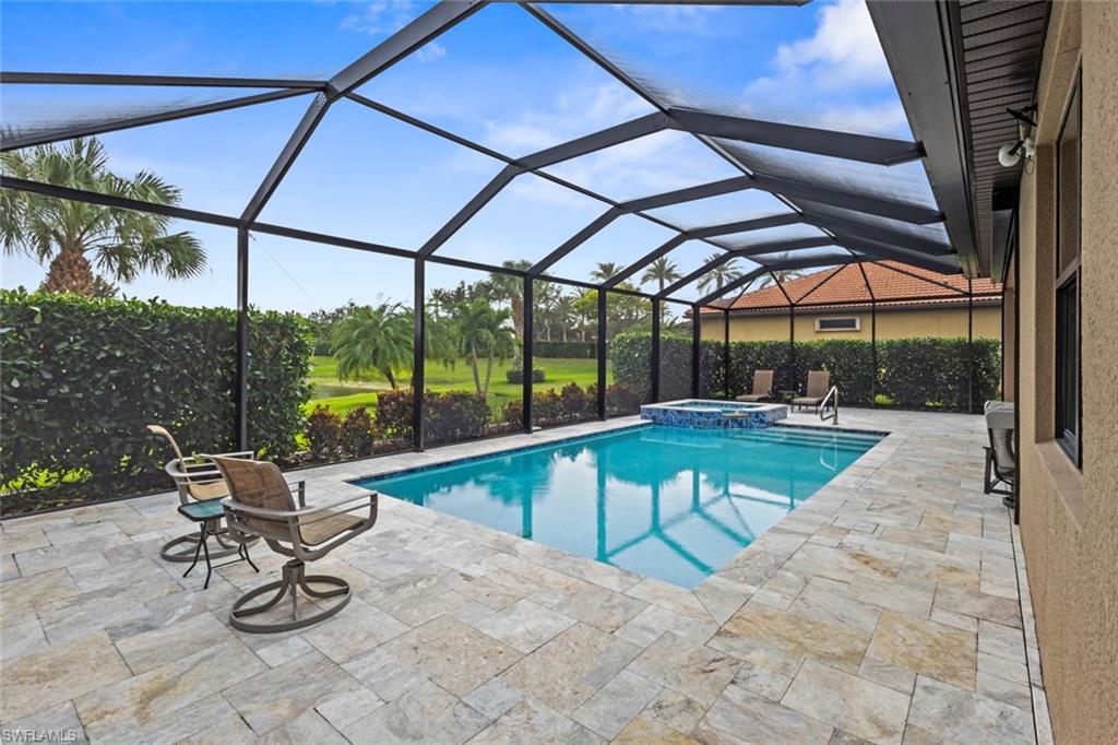 Step outside to your private oasis - an expansive screened-in lanai featuring a SALTWATER POOL and SPA, super screens, and accented by elegant marble pavers. Enhanced landscaping provides added privacy around the pool area. Storm Smart ELECTRIC HURRICANE SCREEN on the lanai keeps your furniture clean and dry during storms.