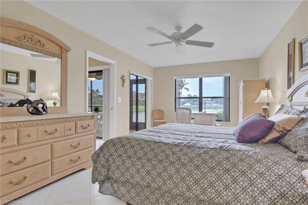 This well-appointed first-floor condo has stunning lake views from the expansive lanai and almost every room. The lanai was enclosed with glass sliders and adds nearly 100 additional square feet of living space. Offered as a turnkey property, it includes all essentials for a comfortable start in your new home. The spacious owner's suite features direct lanai access and picturesque lake vistas. The kitchen has been beautifully updated with granite countertops, backsplash, ceiling updates and new sink and fixtures. The bathrooms and bar have also been updated with granite countertops and fixtures. The HVAC unit was installed in 2023. A new patio was installed in 2023. The ensuite bathroom is equipped with a step-in shower, dual sinks, and a walk-in closet. Additional features include a pantry and a sizeable breakfast nook, perfect for a den or home office and in-residence laundry closet. Fountains V, set in a serene neighborhood, offers well-maintained grounds, two community pools, and a variety of social activities, all with reasonable association fees that cover cable and water. Its prime location features access to many conveniences including the Hibiscus Golf Course, close proximity to US 41 and the Shoppes at Hammock Cove within a mile, and it's only five miles from downtown Naples, renowned for its pristine beaches, gourmet dining, and sophisticated shopping.