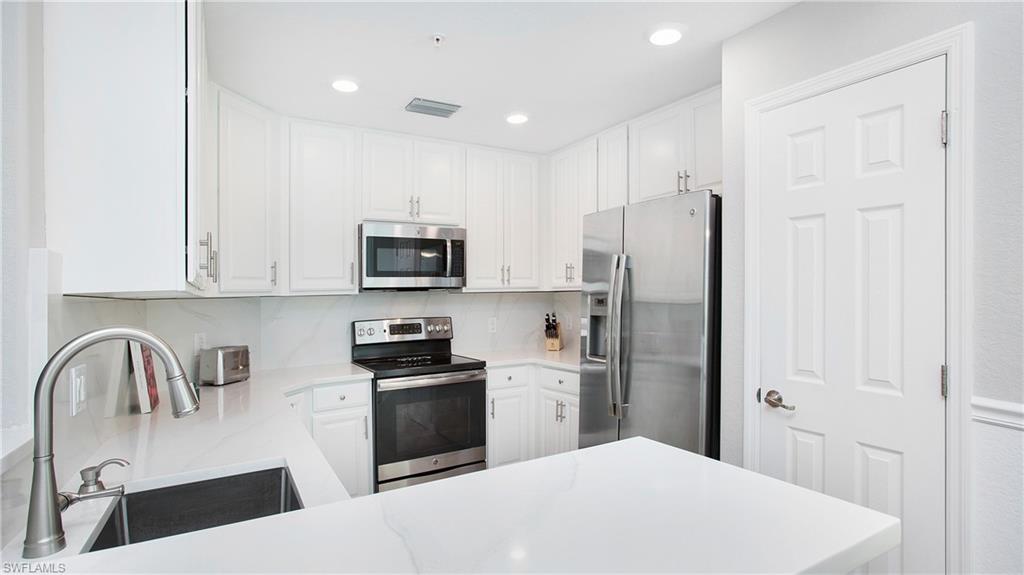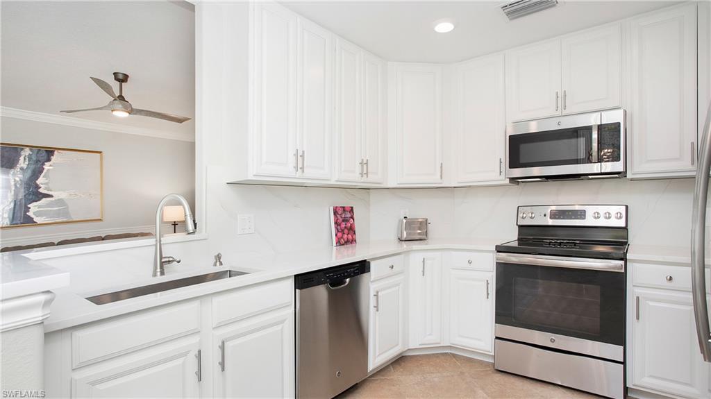 Private first-floor coach home located at the end of a cul-de-sac in Treviso Bay. This 3-bedroom, 2-bath residence features a split-bedroom floor plan and several interior updates. The kitchen includes white cabinetry, quartz countertops, a matching quartz backsplash, and stainless steel sink and faucet. The main living area opens to a screened lanai with views of the preserve and landscaped areas.
