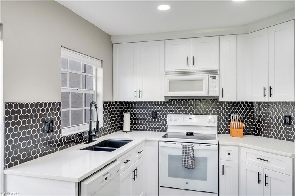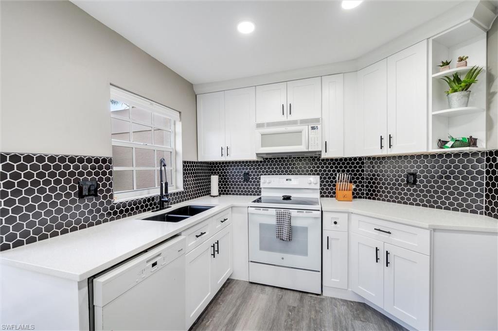 This beautifully renovated first-floor end unit at Worthington Country Club is truly move-in ready. Updated with quartz countertops, white shaker cabinets, luxury vinyl flooring, and white marble-like tile in both the primary shower and guest bath, this three-bedroom, two-bath residence blends modern style with everyday comfort. The open layout offers stunning golf course views and western exposure—perfect for taking in those iconic Florida sunsets. The screened lanai connects seamlessly to both the primary bedroom and living room, filling the home with natural light. The primary suite also features a generous walk-in closet and an en-suite bath. A covered carport and additional storage space are included.