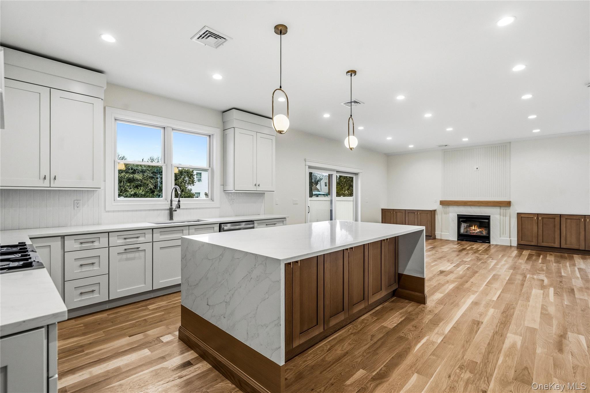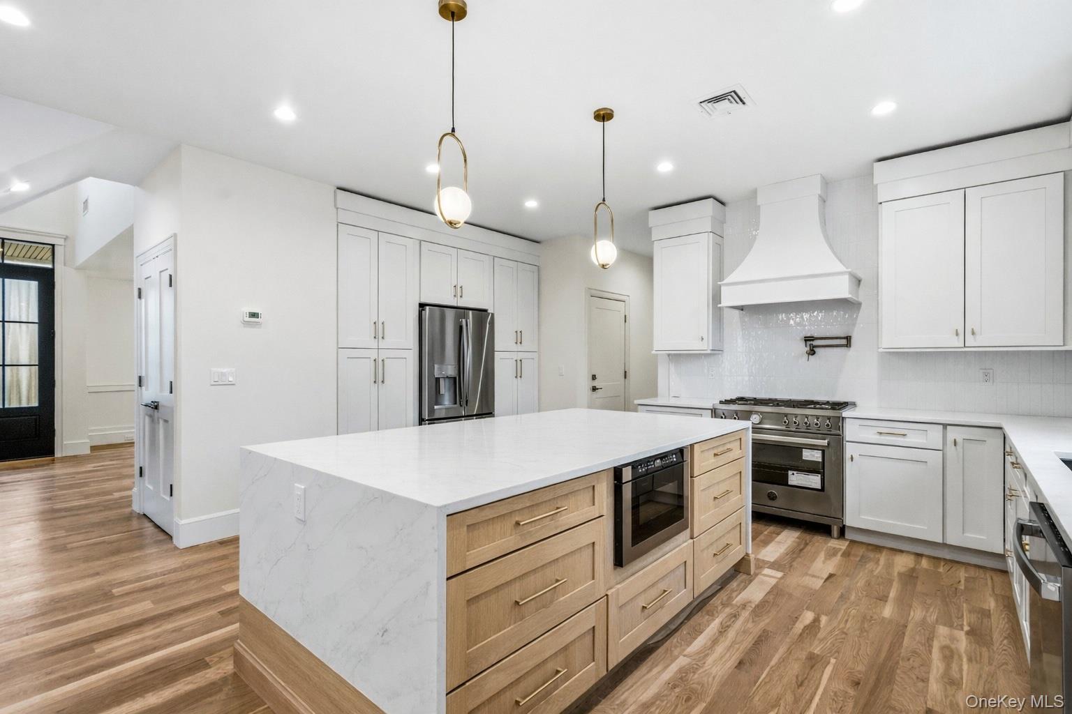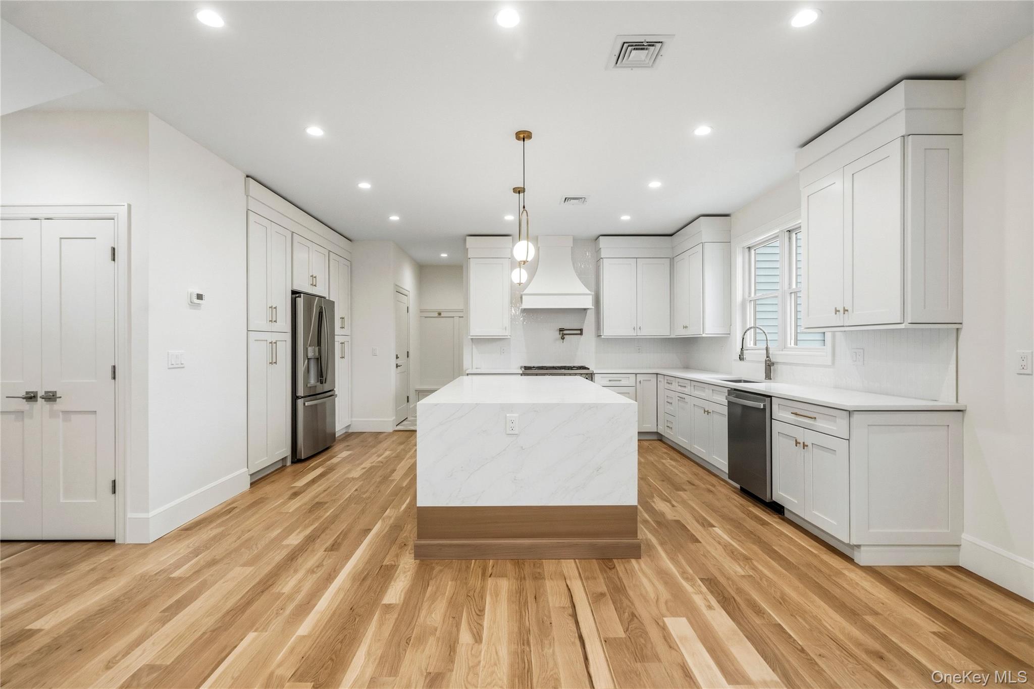 This brand-new construction blends modern farmhouse style with timeless elegance, offering 5 bedrooms, 5. 5 baths, and a fully finished basement with outside entrance. The first floor features a dramatic double-height entry with custom raised panel detailing that flows into the formal dining room with built-in hutch, complete with a coffered ceiling and dry bar—perfect for entertaining. Wide-plank white oak hardwood floors, 9-foot ceilings, and custom crown molding create a seamless sense of luxury. A spacious first-floor bedroom or office, full bath, ideal for extended family. The chef’s kitchen boasts gas cooking, an oversized island, premium stainless-steel appliances, and LED accent lighting. The adjoining family room includes a gas fireplace with built-in cabinets on either side, and sliders leading to a professionally landscaped, fenced yard with paver patio. Second floor features four oversized bedrooms, including a primary suite with decorative ceiling, coffee bar, walk-in closets, and a spa-like bath with soaking tub, glass-enclosed shower, double vanities, plus make-up vanity, and radiant heated floors. A laundry room, and 3 additional bedrooms, two more full bathrooms complete the second level. The fully finished 1, 600 sq. ft. basement with a full bath and outside entrance offers endless possibilities—home gym, media room, bar, or more. East Meadow School District. Pictures are of a similar home built by the builder.