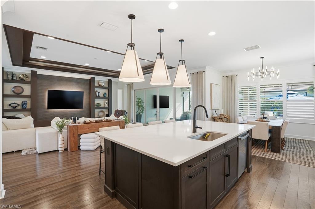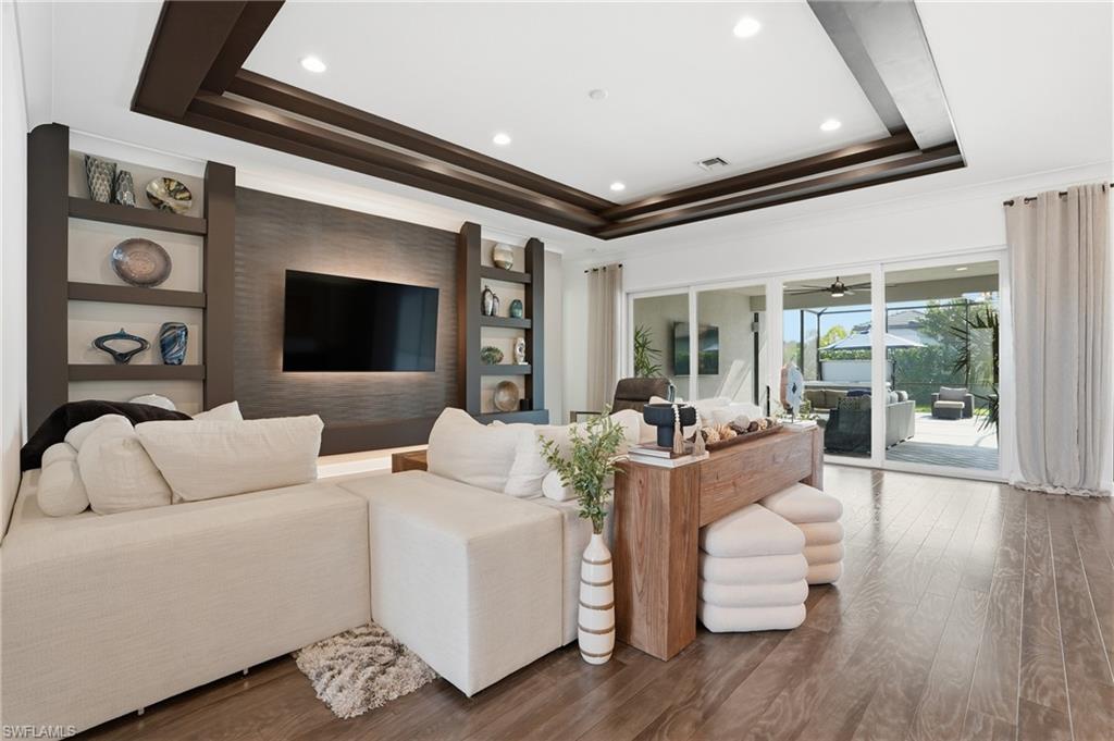 Welcome to a refined residence in the prestigious 55+ community of Valencia Trails, where modern luxury meets effortless livability in the heart of North Naples. Elegantly crafted with a timeless tile roof and a spacious three-car garage, this home impresses from the moment you arrive. Inside, rich wood flooring flows through the main living spaces, complemented by designer tray ceilings and a light, airy ambiance that enhances the home’s sophisticated, contemporary aesthetic.