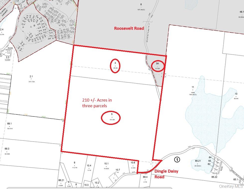 210 +/- Acres wooded vacant land for development. There is an older home on property which is in poor condition. No representations on the house or the viability of any septicwhat is reputedly a shallow dug well. Located on a quiet Dingle Daisy Road not far from Route 42, Monticello, N. Y. It also has access off of Roosevelt Road, see maps. There are some wetlands on the parcel but overall it is attractive and lays out nicely for a private estate or subdivision. Zoning is RR-2 (generally 2 acre zone) and can be accessed with this link: https: //ecode360. com/11124702 There are three parcels making up the 210 Acres: Thompson 59. -1-5; 59. -1-3; and 43. -1-54. There is no municipal sewer and water services available to these parcels.
