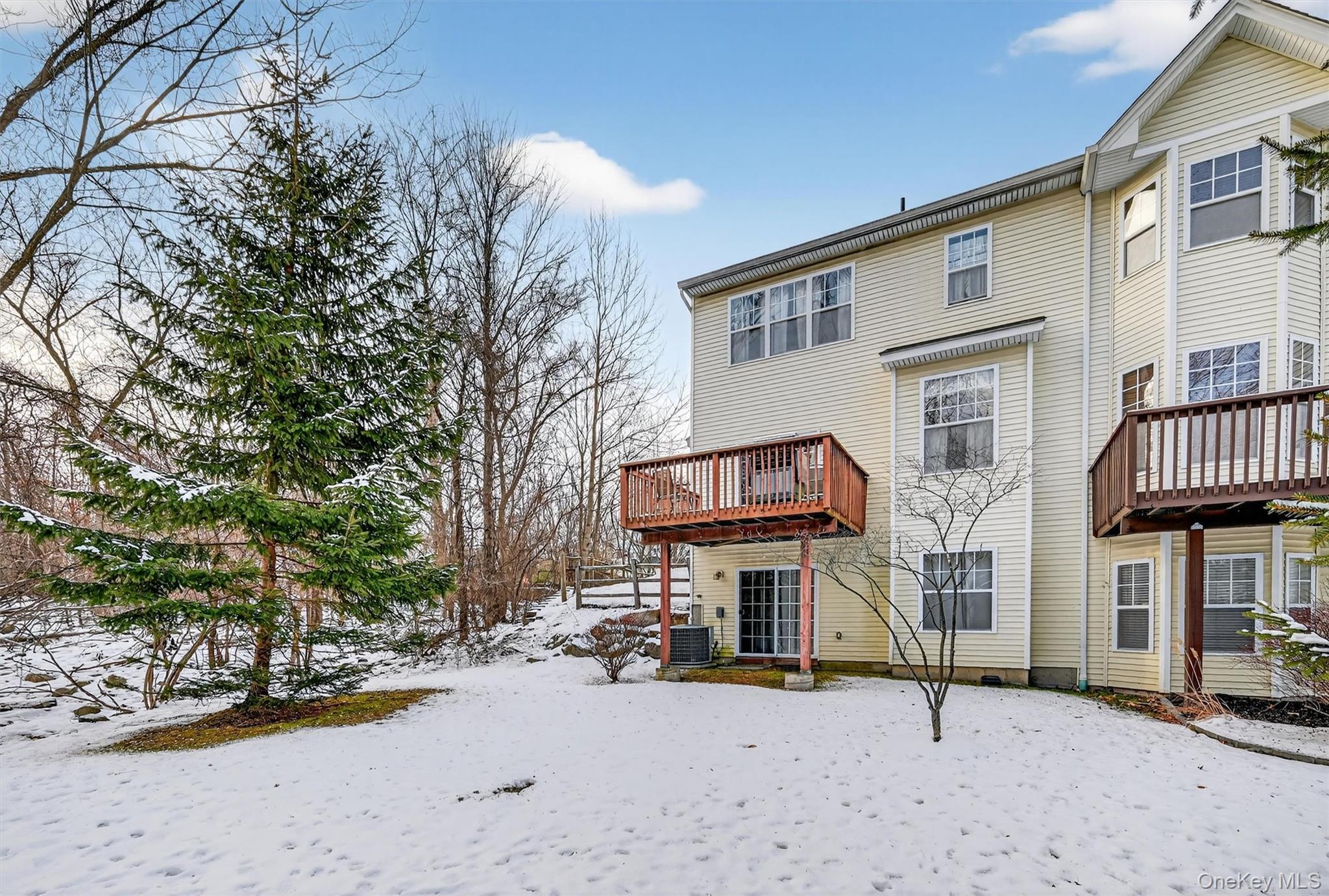 Well appointed townhome located in the Woodside Knolls community and situated on a cul de sac. The entryway features a two story foyer with columns that are indicative of the thoughtful architectural detail found throughout this home. There are gleaming hardwood floors throughout the first level, complemented by recessed lighting and a marble fireplace that serves as a focal point in the main living area. The sliding glass doors allow for an abundance of natural light and provide access to the deck overlooking the backyard. The kitchen features white cabinetry, a pantry, and stainless steel appliances. There is a bonus room that can be used as an office or additional living space. The main level offers a comfortable layout with defined living and dining spaces that flow together for everyday living and entertaining. The upper level has an open hallway that overlooks the main level and offers newer carpeting installed one year ago. Upstairs, the primary bedroom features vaulted ceilings and a spacious layout, it features a large walk-in closet, and an en suite master bathroom with a double vanity, stand up shower and jacuzzi tub. The additional bedrooms are well proportioned and both have walk-in closets. The lower level provides additional finished living space with a full bathroom and walk out access to the backyard. The home is set against a wooded backdrop that adds privacy. There is a two car garage and the community features an inground pool, community center, playground, tennis court and basketball court. It is conveniently located close to all shops, restaurants, schools and highway access.