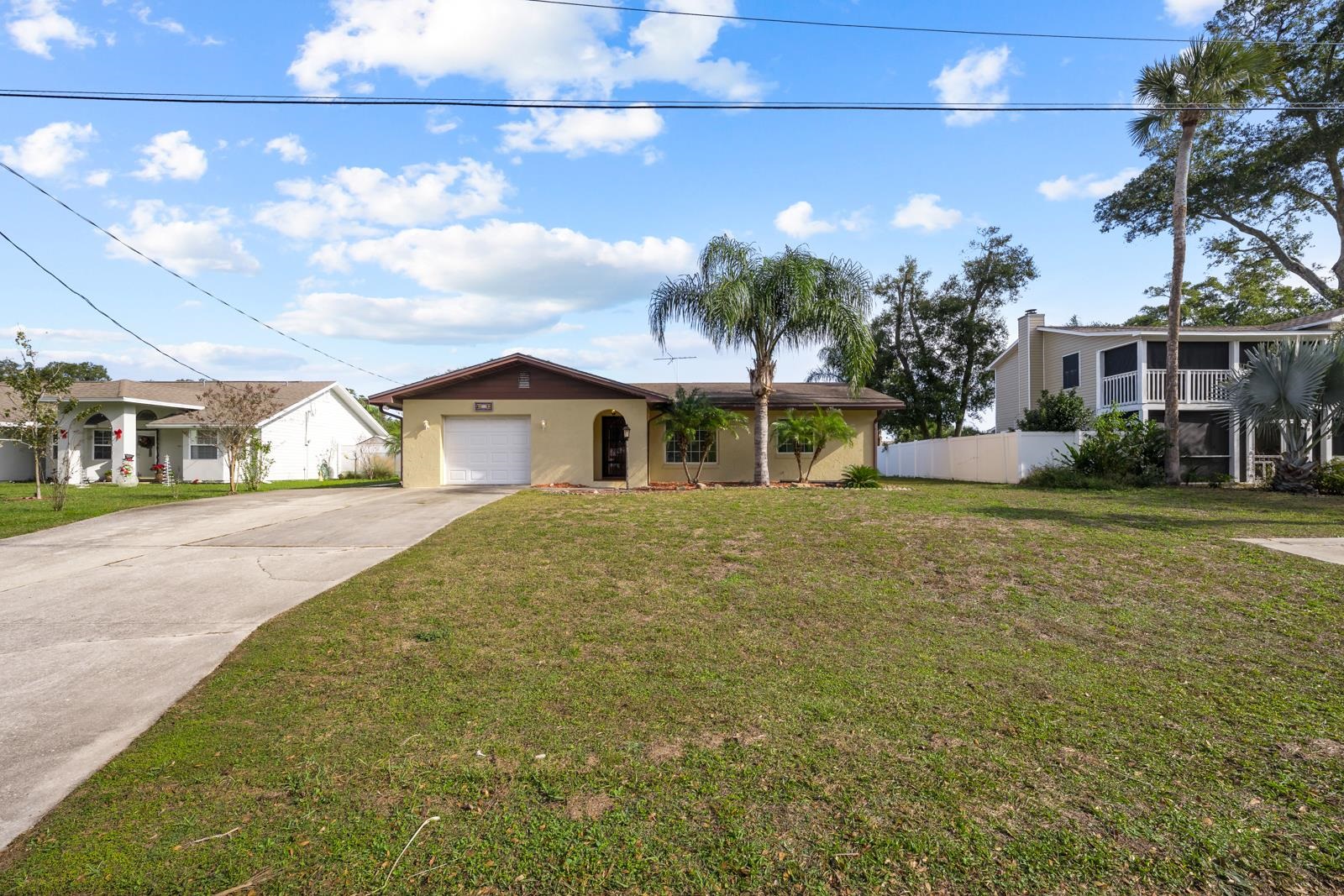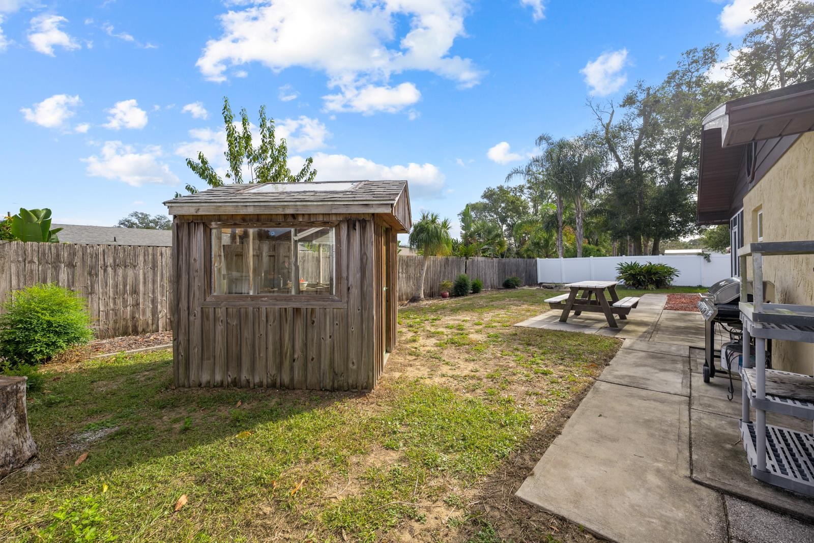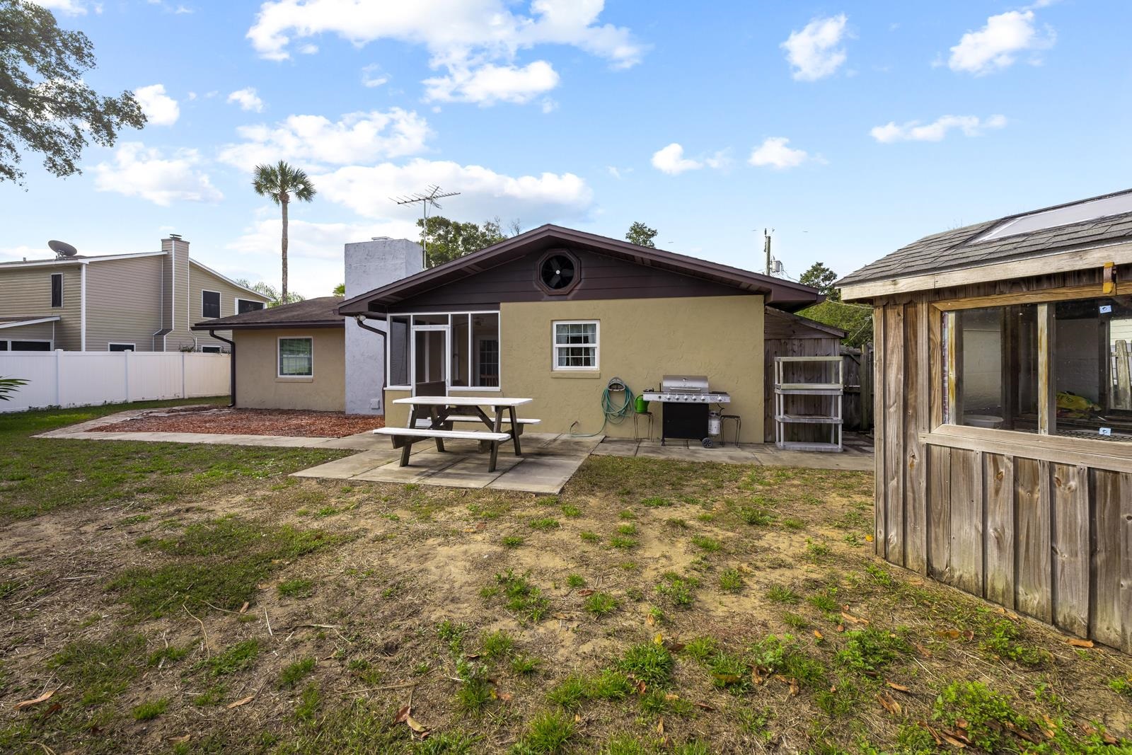Mid-Century Vibe Home in St. Augustine South! As you enter into a formal living area with an arched wall, connected to the family room with a GORGEOUS brick wood burning fireplace you feel like you are in mid-century home. There are two bedrooms and one bath, large formal dining, and bright kitchen. Outside is a screened porch, partially fenced yard that is lovely landscaped. If you love gardening, there is also a greenhouse in the back yard to grow all your favorite plants and flowers. This home has so much potential. The community has 2 boat ramps, community center, play park with fields, boardwalk along the ICW and no HOA.
