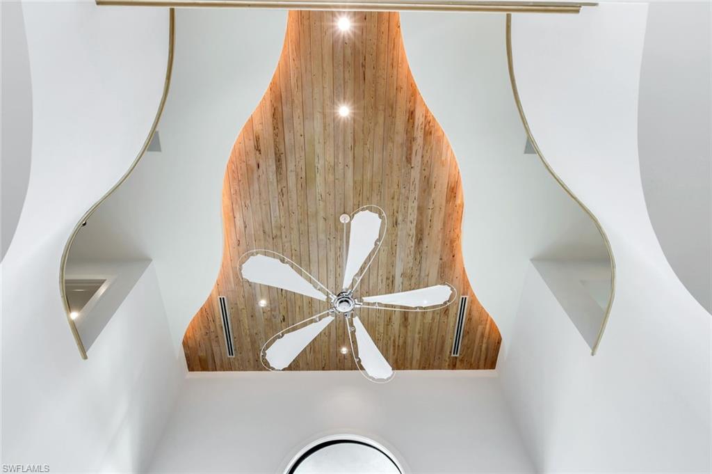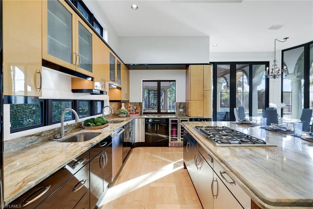 Spanning over 6, 100 sq ft of refined interior living space, this 5-bedroom + den, 4 full and 2 half bath residence showcases spectacular 20+ ft contoured ceilings, abundant natural light, and meticulous attention to detail throughout. The chef’s kitchen is designed for both function and style, featuring custom cabinetry imported from Japan, quartzite countertops, a gas cooktop island, premium appliances, and seamless flow to the expansive outdoor living areas.