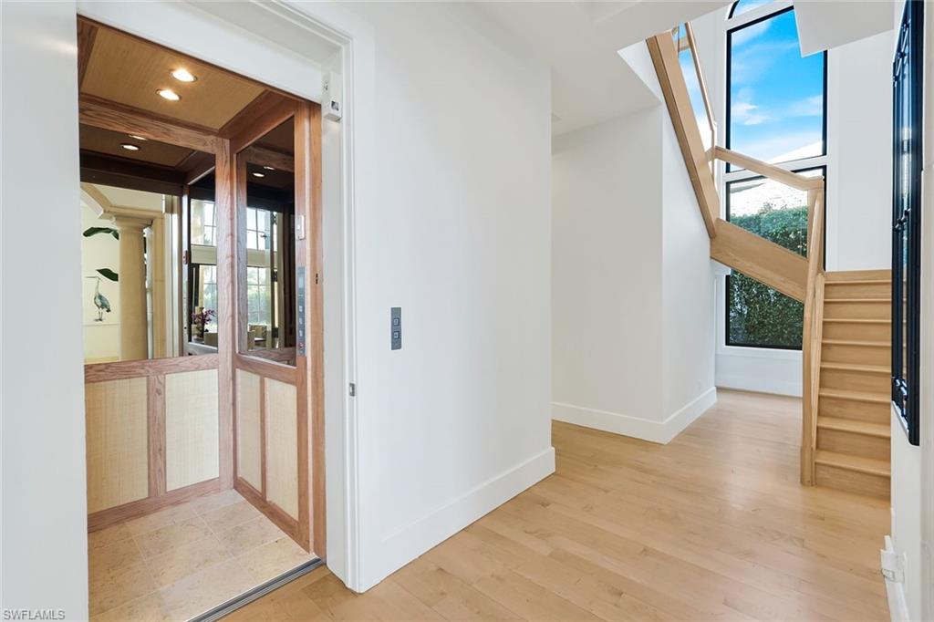 The luxurious owner’s suite offers tranquil water and preserve views, a private balcony, and a spa-inspired bath with jetted soaking tub and walk-in steam shower. An elevator provides convenient access to the second level. Impact-resistant WinDoor windows and doors and a newer roof provide peace of mind.