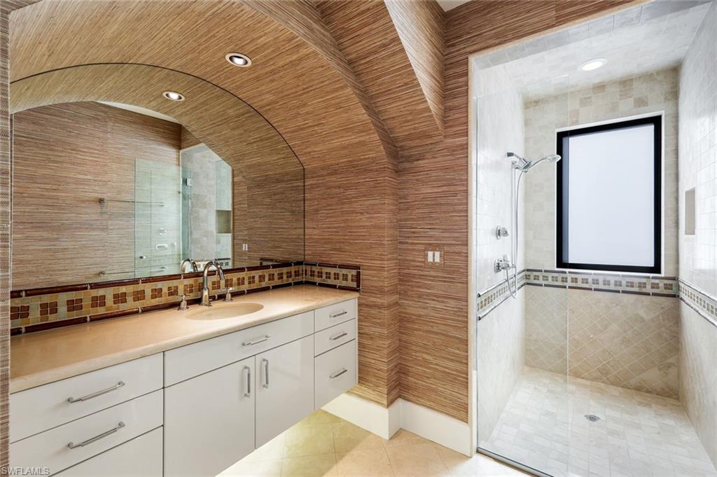 Positioned on nearly half an acre, this home features a private 40-ft dock in the backyard with the option to purchase an additional 50-ft protected slip in Windstar’s private marina—an extraordinary offering seldom available in Naples Bay communities.