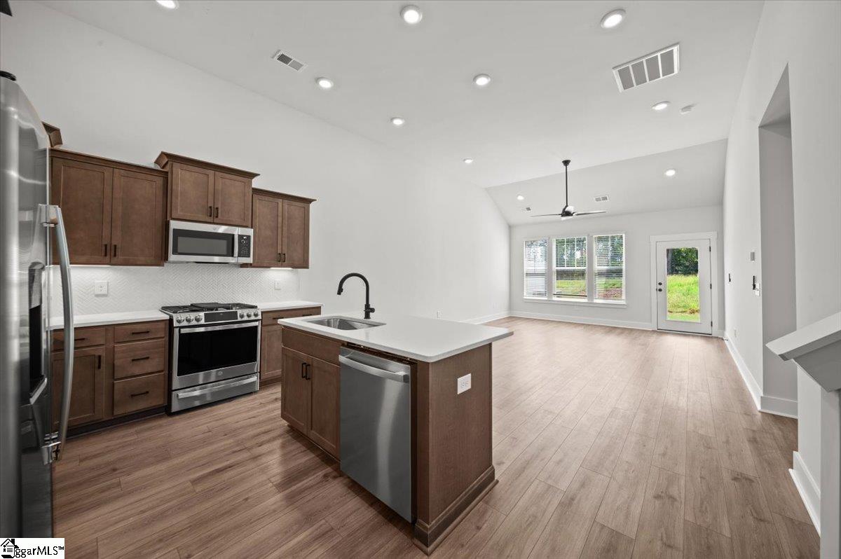 Welcome to Aspen Ridge! We are the only luxury townhomes minutes from Downtown Greer. SIMPLIFY YOUR MOVE! All homes feature the move-in package boasting a refrigerator, washer, dryer, dishwasher, microwave, in-sink disposal and white faux wood blinds. Located beside the community bark park, this home is a pet lovers dream! Offering 2, 182 square feet of functional living space, the Summit is a thoughtfully crafted home that is sure to meet all your needs. Enter the spacious foyer from your front porch or garage and come into your open concept living area where you can entertain seamlessly between the living room, kitchen and breakfast area. The chef's kitchen is a must see with stunning dark brown cabinetry, Quartz countertops, tiled backsplash, center island with sink, under cabinet lighting and stainless steel gas appliances including a refrigerator. The 12’ Cathedral Ceilings makes the living room open and airy and lead out to the covered porch and more private backyard which is perfect for those summer evenings. Retreat to the luxurious main floor Primary Suite, complete with a generous walk in closet and spa like bathroom featuring double vanities and a beautiful tiled shower with seat and glass door. Adjacent to the foyer is a dining room which would also make a great home office. A full bath as well as your laundry room with washer/dryer included complete the main level. Upstairs are two large bedrooms, a full bath, and a versatile room that would be a great entertaining space or even another bedroom. Blinds are also included throughout the home! The 1 car garage and double parking pad give a convenient and versatile combination for car storage and parking. Smart home technology, energy-efficient design, and a dedicated local warranty team ensure long-term comfort and convenience. HOA includes lawn care and trash collection. Live effortlessly in your new home with easy access to Greenville, SC, I-85, nearby schools, shops, parks and restaurants. Desirable open-concept floorplans with craftsman style exteriors. Main level or second level primary suites available with many premier features floorplans including, 2-story ceiling, 9-foot kitchen island, spacious primary suites, LVP flooring, and plentiful large windows allowing an abundance of natural light. Come by today for your personal tour and be one of the first ones to call Aspen Ridge your new home! See Sales Agent for addtional pricing information.