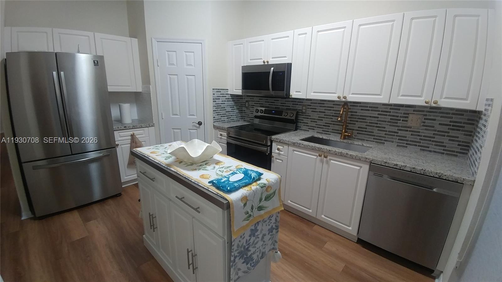 Two Story Townhouse with garage and balcony, parking in rear and front of building. Association fee includes insurance for building exterior, internet and media, alarm service, gated community, use of pool and playground.