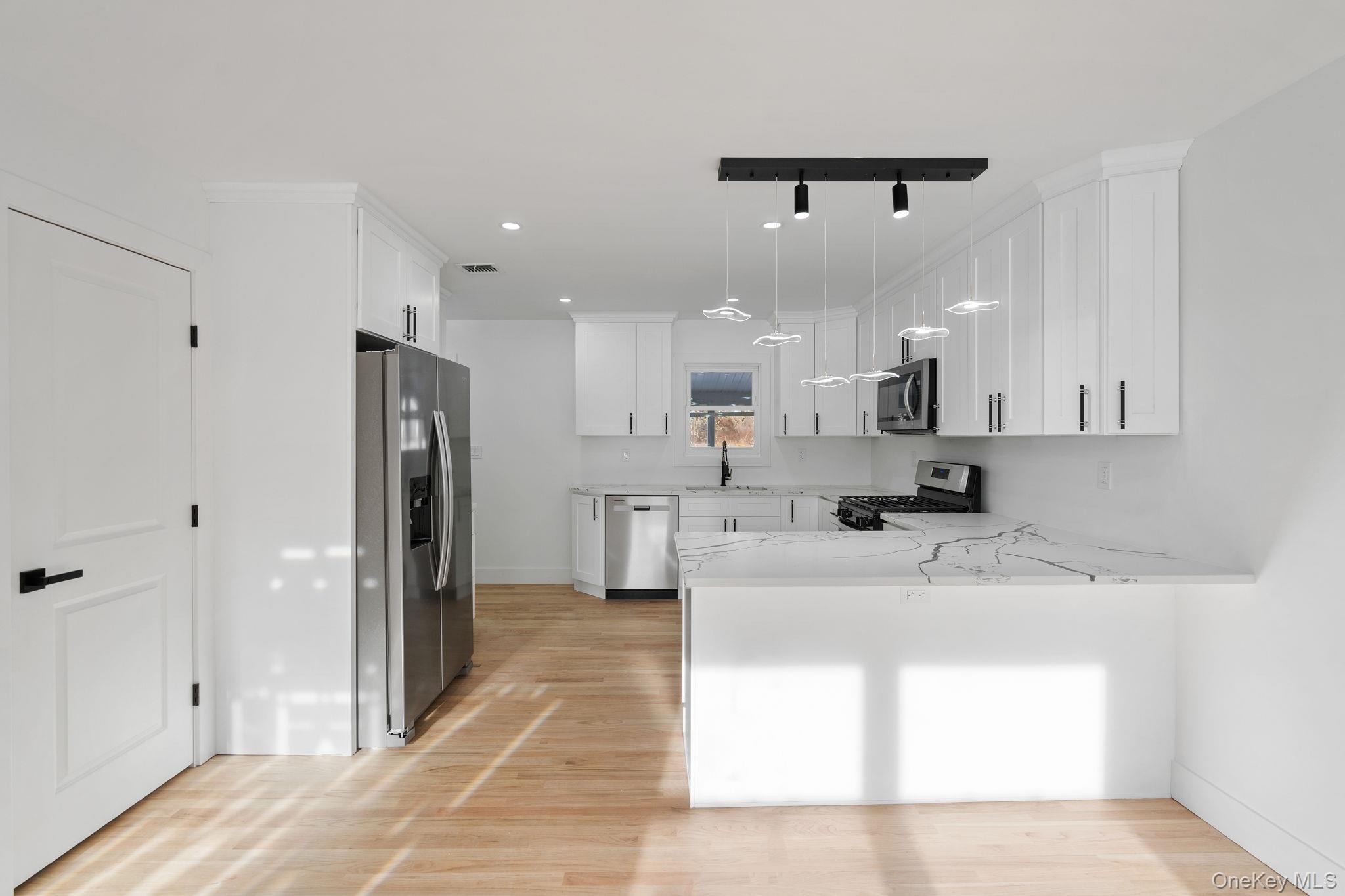 Welcome home to this beautifully renovated 3-bedroom, 3 full-bath split-level located in the highly desirable Wallkill School District. Filled with natural light, this move-in-ready home offers an open and comfortable layout perfect for everyday living and entertaining. The main level showcases gleaming hardwood floors, recessed lighting, and a stylish, modern kitchen featuring white cabinetry, quartz countertops, stainless steel appliances, and a large center island—ideal for casual meals or gathering with friends. Spacious living areas flow effortlessly, creating a warm and welcoming atmosphere throughout. The primary bedroom includes a private en-suite bath with sleek finishes and a walk-in shower, while the additional full bathrooms are thoughtfully updated with contemporary vanities and tile. The lower level provides flexible space for a family room, home office, guest area, or playroom, complete with a full bath. Ideally situated just outside the Hamlet of Modena, this home offers convenient access to a variety of local restaurants, shopping centers, a public library, medical and banking facilities, nearby schools, and community amenities including Thomas Felten Park. The area is also surrounded by popular Hudson Valley attractions such as the Mohonk Preserve, local wineries, and family farms. Modena’s central location at the junction of Routes 44/55 and Route 32 makes commuting and exploring the region easy and convenient. Additional highlights include a two-car garage, stone exterior accents, and a peaceful setting that blends modern comfort with everyday convenience.