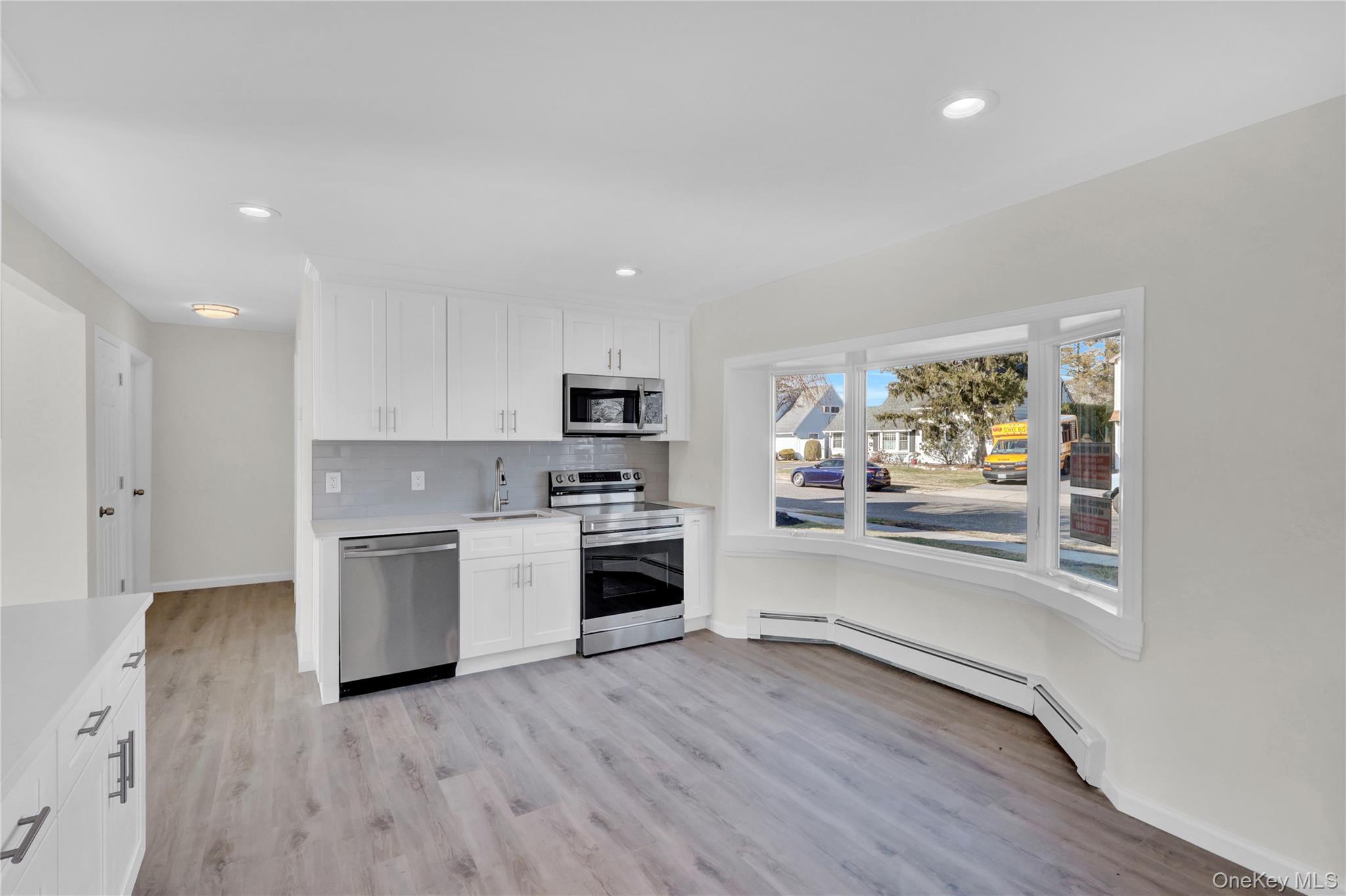Move right into this renovated four-bedroom, two-bathroom, expanded Levitt ranch-style home. New designer kitchen with quartz counters and stainless-steel appliances. Two new bathrooms, new heating, new flooring and carpeting, fresh paint, and more. Mid-block location. Close to local shopping, schools, and parkways. Don't miss out on this opportunity! To help visualize this home’s potential, yard photos were digitally enhanced.
