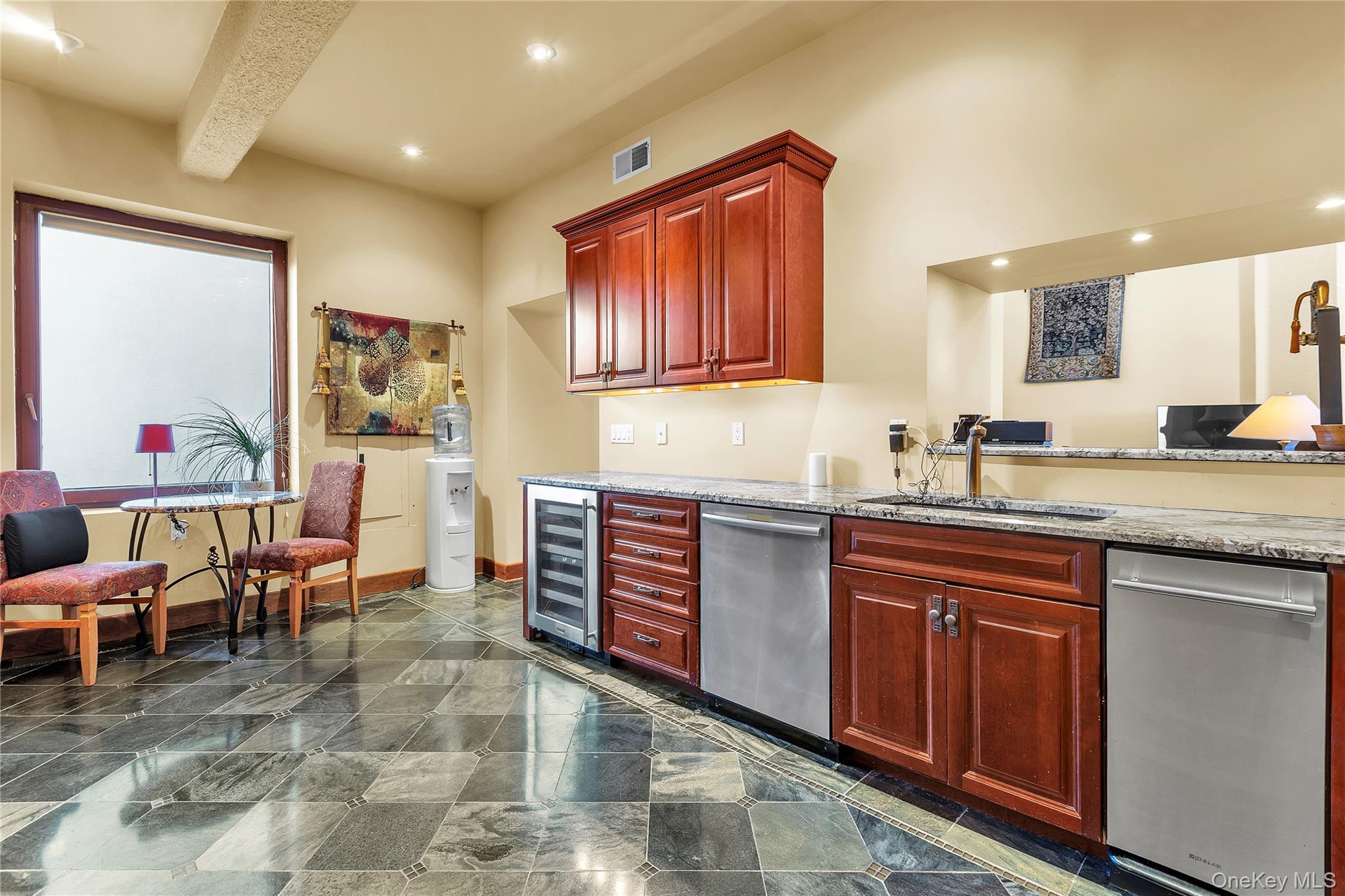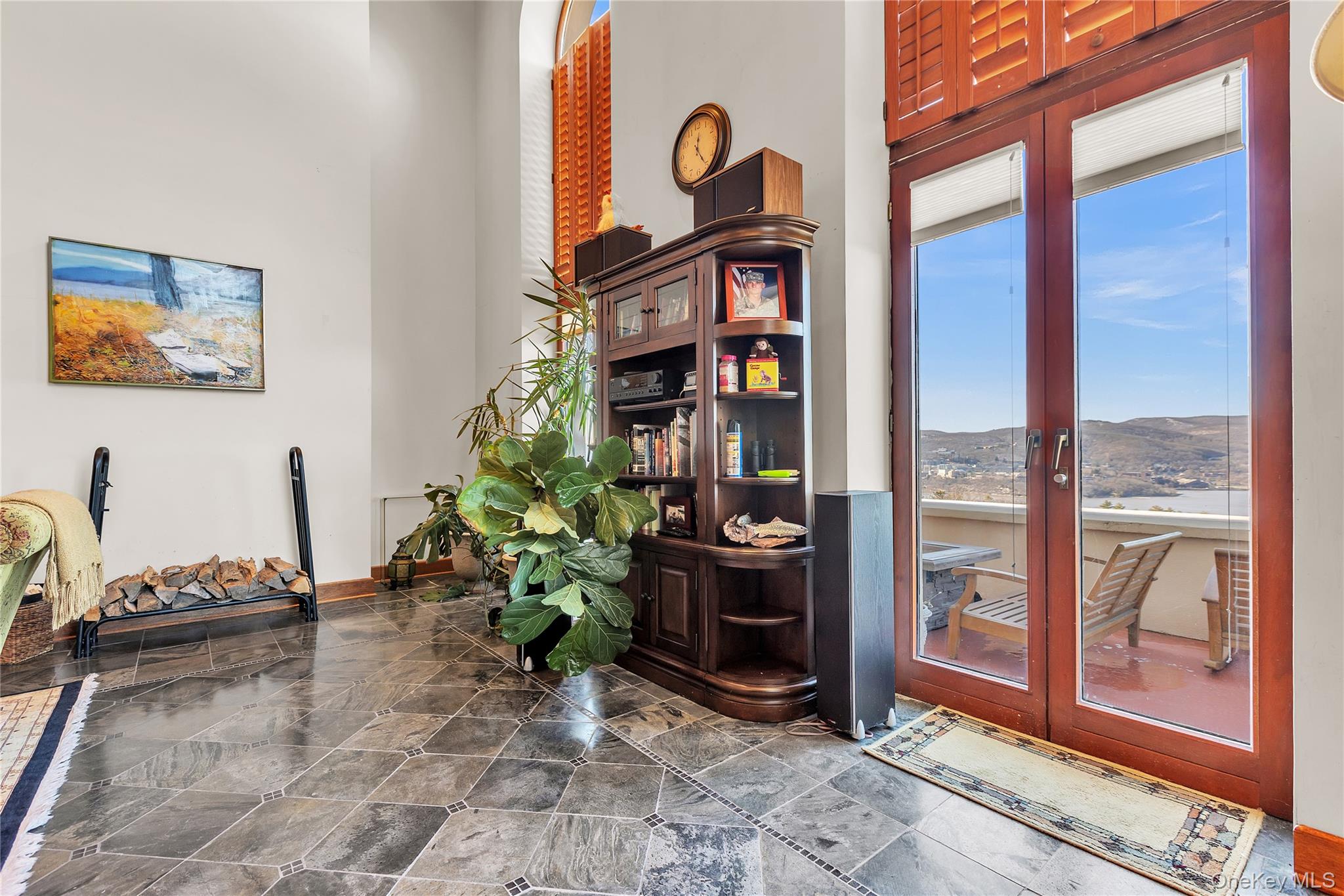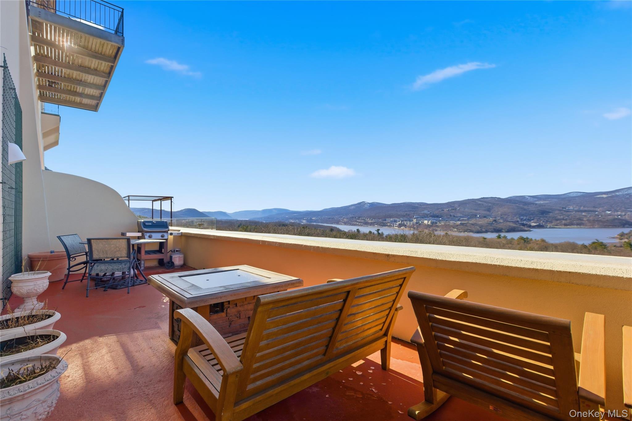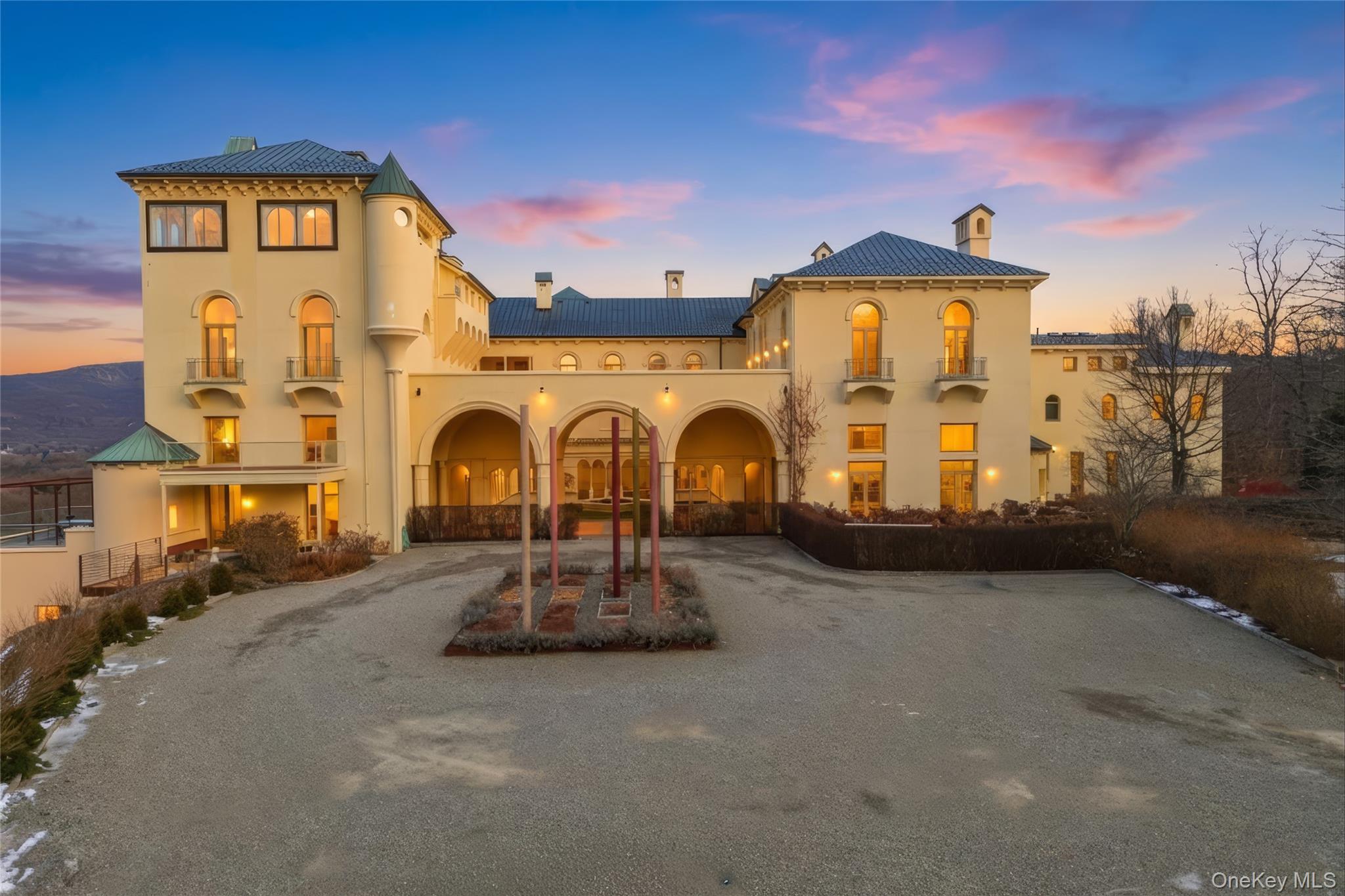 Rising above the Hudson Highlands with commanding views and unmistakable stone architecture, Dicks Castle remains one of the region’s most recognizable and storied landmarks. A Moorish style castle fashioned after Alhambra in Granada, Spain and situated on 26 wooded acres, the exterior features turrets, arches and courtyards surrounded by sculptures and stone walls well over 100 years old. This residence offers an exceptionally rare opportunity: the ability to live inside a piece of Garrison history while enjoying space, privacy, and the contemporary comforts expected of a modern luxury home. This particular home is unlike any other in the castle. At approximately 2, 700 square feet, it is the only unit with three full bedrooms and three full baths, a distinction that sets it apart immediately. The interior design elevates the castle’s character with thoughtful updates-tile floors from India with radiant heat, soaring volumes of space, and a layout that blends openness with intimate architectural moments. The heart of the home is a dramatic great room anchored by a fully functional Reynard fireplace and framed by 23-foot ceilings. From this vantage point, two floor-to-ceiling doors and windows open to sweeping panoramas of the Hudson River Valley and the lights of the United States Military Academy at West Point. Few homes in the Hudson Valley offer a view with this level of scale, continuity, and emotional impact. The primary bedroom suite looks out over the great room, giving it a lofted sense of retreat while maintaining connection to the architecture and the views beyond. Two additional bedrooms are generously sized, each appointed with Jacuzzi bathtubs, making them ideal for guests or extended-stay. Every room is positioned to take advantage of natural light and the castle’s unique lines. The floor plan supports both quiet day-to-day living and sophisticated entertaining, with thoughtful storage, a calm material palette, and an overall feeling of permanence that only legacy structures can provide. Exterior living is equally compelling. A private deck extends the living space outdoors, complete with a propane-fueled fire box — perfect for warm evenings under the stars, watching river traffic drift below or the night-time glow of West Point across the valley. There is no other property like this. Inventory within Dicks Castle is scarce, and homes with this scale, bedroom count, and vantage point are almost never available. For buyers who want something that stands apart — architecturally, historically, and emotionally — this is a chance to own a singular residence in one of the Hudson Valley’s most iconic landmarks.