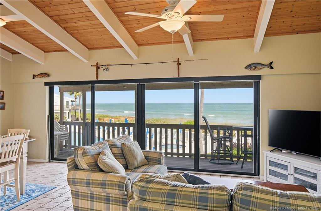 Discov?r th? coa?tal l?fest?le at Beachwood V?lla? on Hutchinson Island, ideally located just minutes from the shops and dining of Downtown Stuart and Jensen Beach. This top-floor residence offers flexibility as a personal retreat or income-producing rental, with the ability to lease up to six times per year (minimum two-month terms). Vaulted ceilings, full impact glass, and sweeping ocean views enhance the open, light-filled interior. Conveniently situated near the pool, the unit is easily accessed via stairs from the private covered balcony. Community amenities include direct beach access, swimming pool, hot tub, and grilling area. The main living area and kitchen are located on one level, with bedrooms and baths below, plus TWO loft areas (one above the kitchen AND another accessible from the master bedroom) providing additional usable space. Additional features include an in-unit washer and dryer, dog-friendly community, and covered parking. Schedule your showing today!