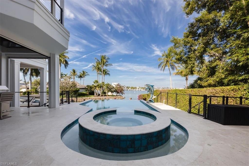 The great room opens seamlessly to the outdoors through full-corner hurricane-impact sliding doors, creating effortless indoor-outdoor living. Enjoy the first-floor infinity pool deck as boats glide by en route to the Naples Yacht Club, or embrace the ultimate boating lifestyle with direct Gulf access and no bridges. The new 24, 000-lb covered boat lift, double jet-ski lift, and 50-amp shore power complete this boater’s paradise. A three-car garage with air conditioning and two custom 6, 000-lb car lifts adds exceptional convenience. Unwind on the second-level terrace with new Ipe wood decking while taking in iconic Naples sunsets, or practice your short game on the private putting green—all surrounded by spectacular water views. Designed for luxurious living and unforgettable entertaining, this one-of-a-kind waterfront residence delivers the very best of the Naples lifestyle.