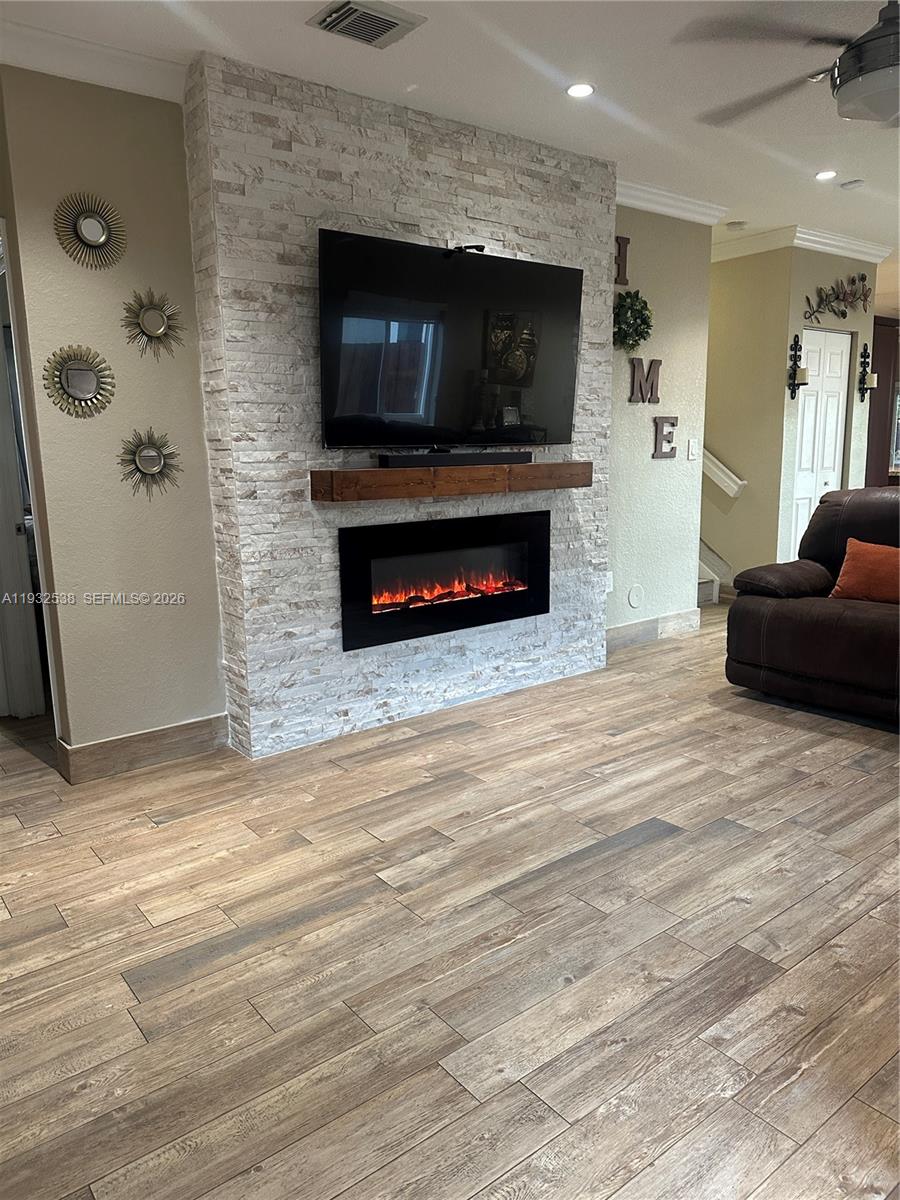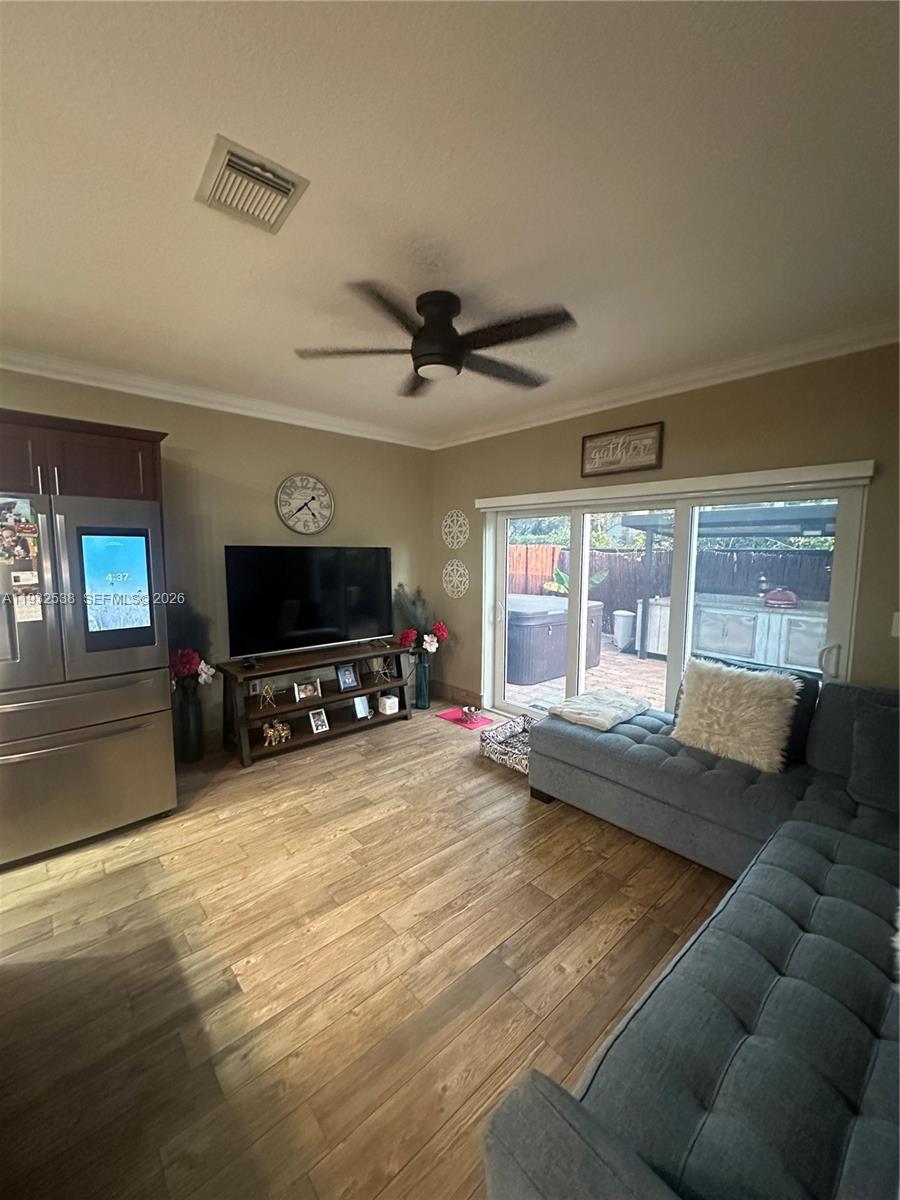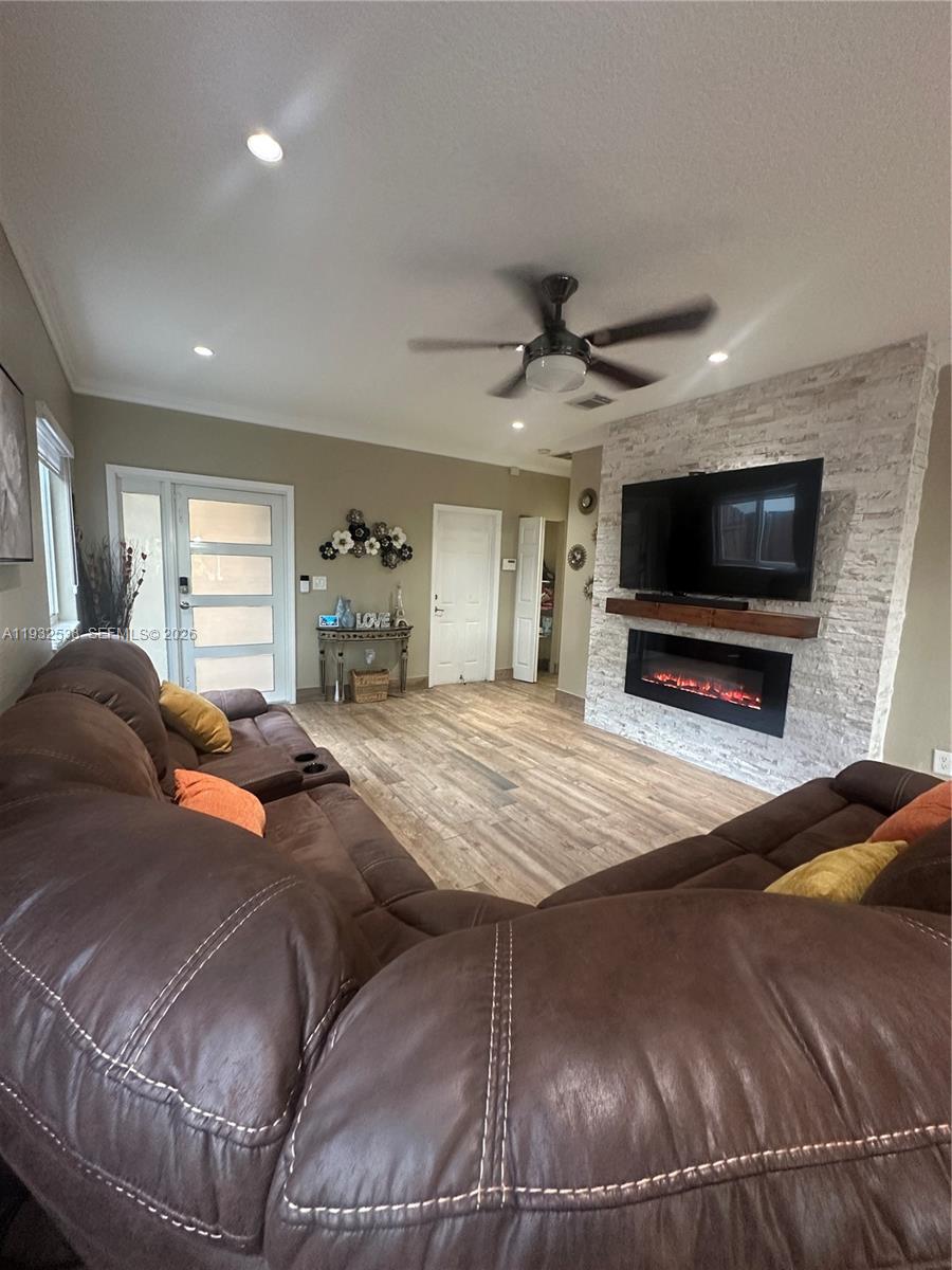 This home offers a double garage, spacious living and dining areas, and a stylish electric fireplace. The open eat-in kitchen flows seamlessly into the family room, creating a perfect space for everyday living and entertaining. The property features impact doors and windows throughout and a new roof installed in 2019.
