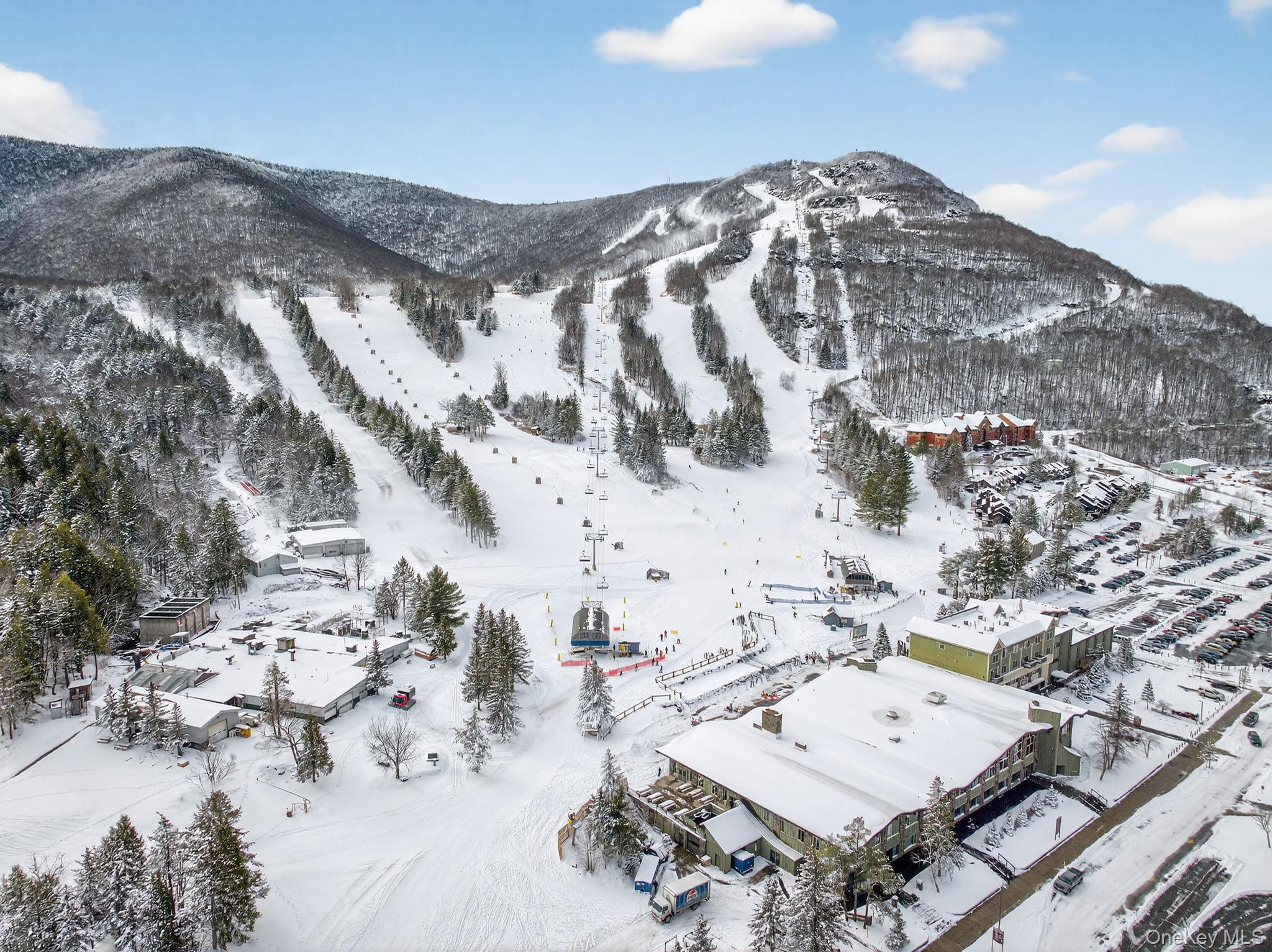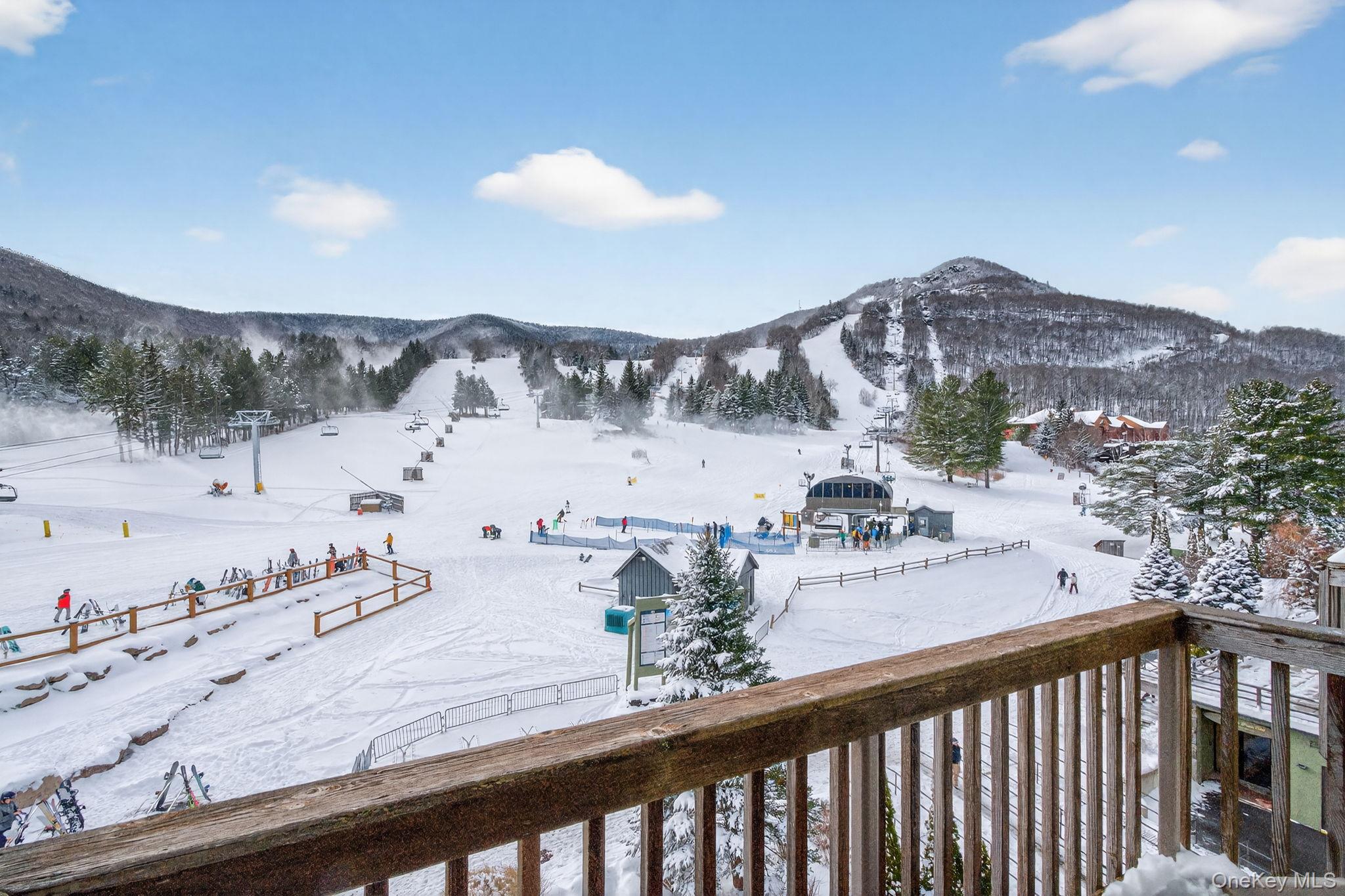 Ski-in/ski-out is one thing. Rolling out of bed onto the slopes before your coffee kicks in is another. This is the latter. Arguably the best location at Hunter Mountain, and one of just eight units at The Pinnacle, this condo sits directly at the base of the mountain—so close that the lift is 1 minute from your door. The result is a rare combination of frictionless ski access and mountain views that few properties can match. Inside the 2-bedroom, 2. 5-bath layout is designed for effortless living. The main level is bright and inviting thanks to a southern exposure and hardwood floors--it’s anchored by one of two gas fireplaces for instant ambiance. A peninsula kitchen with granite counters opens into the living area. A powder room and laundry room with ample storage complete this level. Upstairs, the primary suite features its own fireplace and full bath; the second bedroom sits beside a hall bath with a Jacuzzi tub for après-ski recovery. A private balcony on the top floor offers a commanding, front-row view of the slopes. Additional conveniences include a deeded parking space and dedicated ski locker. This property is perfect for both personal use and turnkey rental potential. At less than 200 ft from the lift, this is about as close as you can legally sleep next to the mountain. And when you’re done skiing, you’re just 3 minutes from the village and 8 minutes from Tannersville A rare opportunity in one of Hunter’s most coveted slope-side settings.