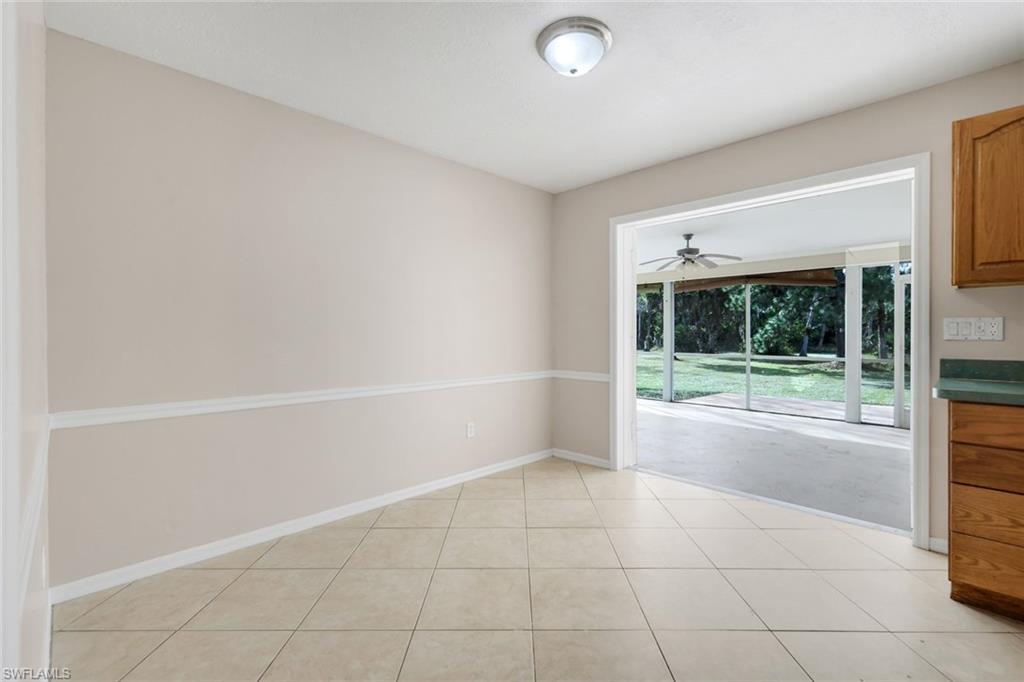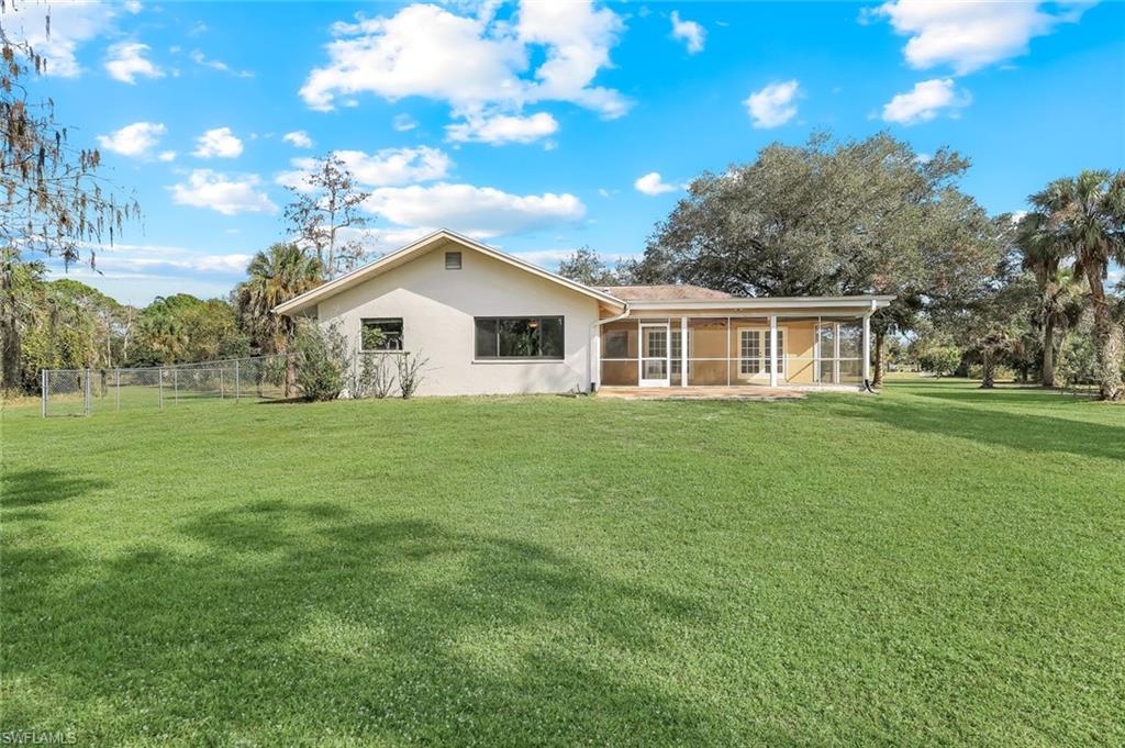 This charming single-family home is situated on a rarely available 5-acre lot, just 3 miles from Collier Blvd. The spacious property offers both privacy and convenience, making it an ideal choice for families seeking a tranquil lifestyle close to local amenities. The home includes three comfortable bedrooms and two full bathrooms, providing ample space for family members or guests. The large eat-in kitchen features French doors that open to a screened-in lanai, perfect for enjoying meals with a view of the outdoors. There are two family rooms in the home. The front family room offers a cozy space for relaxation, while the rear family room with French doors to the lanai overlooks the expansive yard, offering wonderful views and additional living space. A new shingle roof was installed in 2020, ensuring durability and protection. Impact windows were added in 2021 to enhance safety and energy efficiency and the home features a newly installed hot water heater. The home is on well water, with a reverse osmosis (RO) system under the kitchen sink for purified drinking water. A fenced-in area attached to the house provides a safe and convenient space for your dogs to play. There are two sheds, one for storage and the other houses the well equipment. Welcome home to your private oasis!