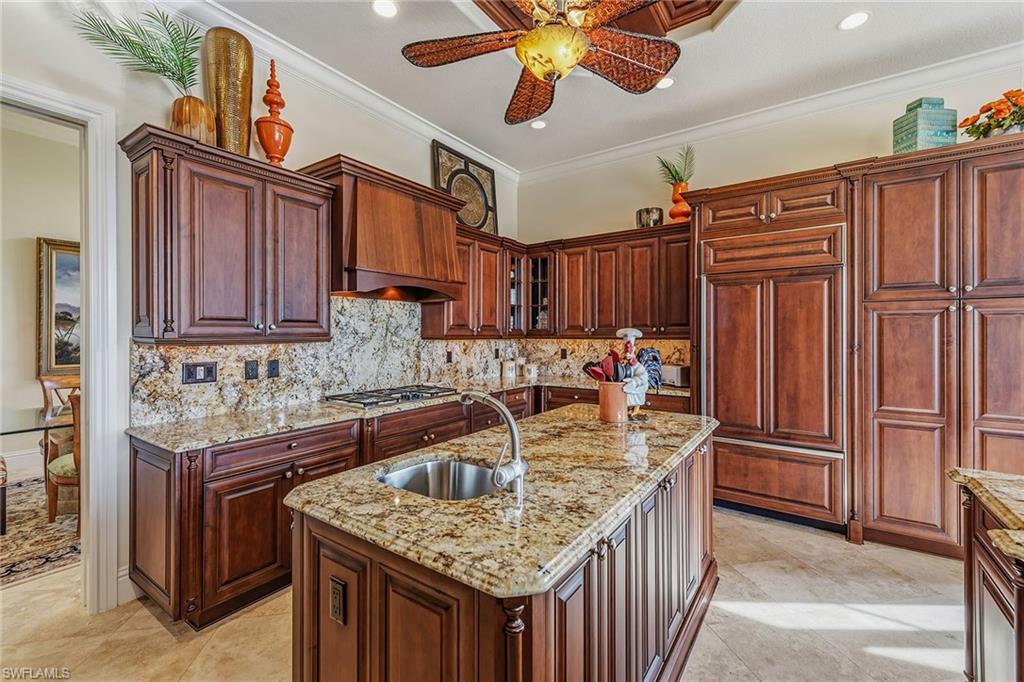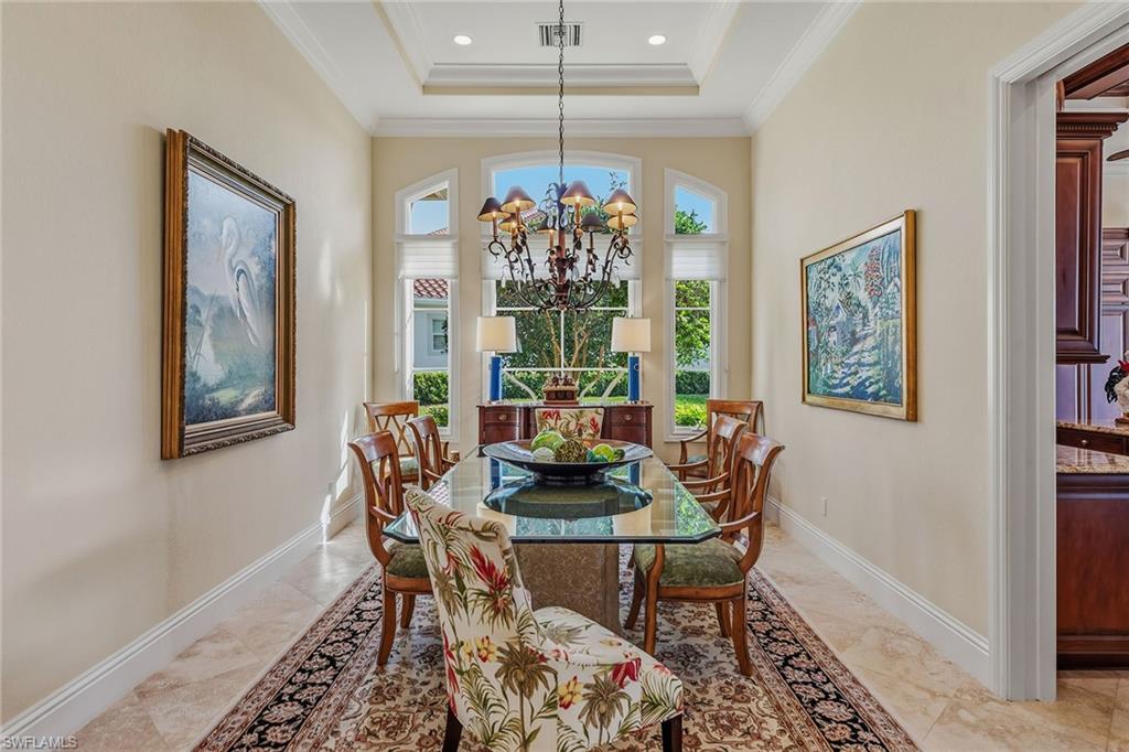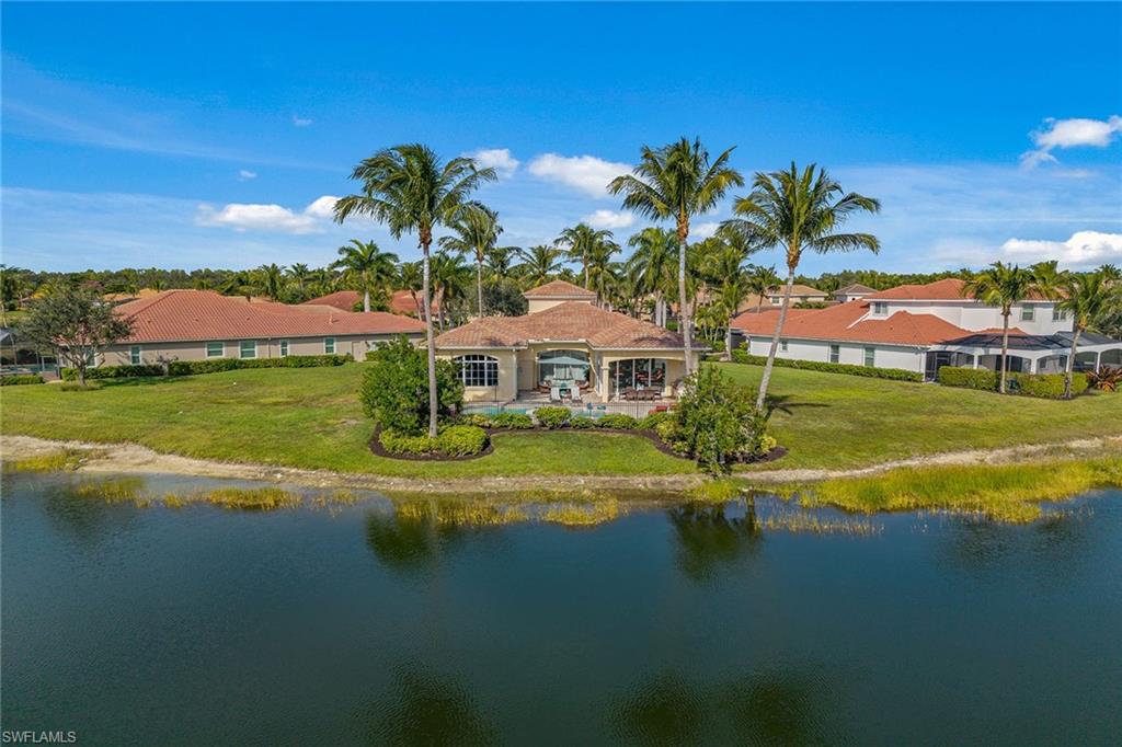 Rarely available and impeccably crafted by Gulf Bay, this elegant Chiasso residence offers an exceptional private setting surrounded by sweeping water views and tranquil natural beauty. Ideally positioned on a secluded waterfront cul-de-sac with coveted southwest exposure, the home enjoys expansive lake vistas and breathtaking sunsets, creating a serene backdrop for refined Florida living. Thoughtfully upgraded throughout, the residence offers three bedrooms plus a den, three-and-a-half baths, and a two-car garage. Beautifully furnished and tastefully decorated, the home is designed for both comfortable everyday living and effortless entertaining. Outdoor living is highlighted by a gas-heated pool and spa with a fully fenced paver deck, complemented by a well-appointed outdoor kitchen featuring a Wolf gas grill, under-counter stainless refrigerator, granite countertops, and lush landscaping that enhances privacy and ambiance. Notable upgrades include impact-resistant windows and doors, a tile roof, pavered driveway, a 98-gallon natural gas water heater, and dual HVAC systems replaced in 2021 and 2022. Inside, timeless finishes and architectural details are showcased beginning in the grand foyer with travertine natural stone flooring, solid wood entry door with sidelights, arched windows, soaring ceilings, wall accent detailing, and crown molding. Travertine flooring flows through the main living areas, including the elegant living room with coffered ceiling, recessed lighting, and crown molding, and the inviting family room featuring a wood-insert coffered ceiling, in-ceiling speakers, and zero-corner sliding glass doors opening to the pool deck. The gourmet kitchen is beautifully appointed with custom wood cabinetry, glass-front display uppers, under-cabinet lighting, granite countertops and full backsplash, filtered water at the sink, and a center island beneath a recessed coffered ceiling. Premium appliances include Dacor, Sub-Zero, and Bosch. An adjacent formal dining room offers a recessed ceiling, crown molding, and arched windows with garden views. The primary suite provides a luxurious private retreat with serene water views and two walk-in closets. The spa-inspired bath features dual marble vanities with makeup counter, a jetted soaking tub, and a walk-in shower tiled floor to ceiling. Two guest bedroom suites offer en-suite baths with marble finishes and frameless glass showers. The den features engineered hardwood flooring, recessed ceiling and lighting, and custom built-in desk and wall units, while a stylish half bath adds convenience for guests. Residents enjoy an award-winning, gated community with enhanced amenities including a resort-style pool, updated dining venues, 10 new pickleball courts, fitness and spa facilities, tennis, and an active social calendar. Optional memberships with no golf waitlist provide access to the championship course, new golf clubhouse, marina, and private beach club.